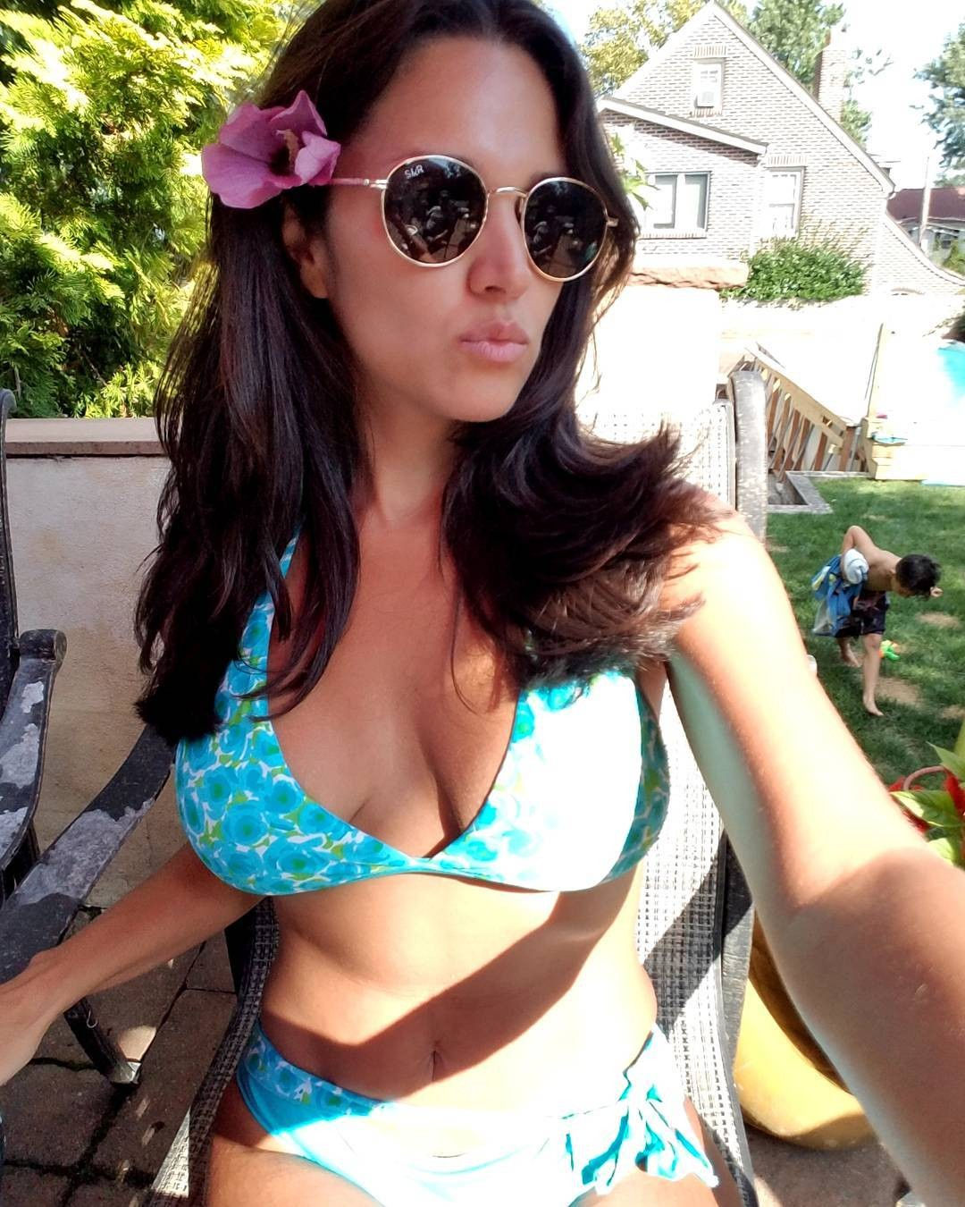 Trova la versione non ritoccata delle foto in bikini su internet --- ha una brutta cicatrice nella parte inferiore destra dello stomaco che è stata rimossa con Photoshop in tutte queste foto e ce ne sono un paio che mostrano bene i capezzoli (ampie areole marroni). Difficili da trovare, ma erano sul web circa 10 anni fa (sì, queste sono foto vecchie).