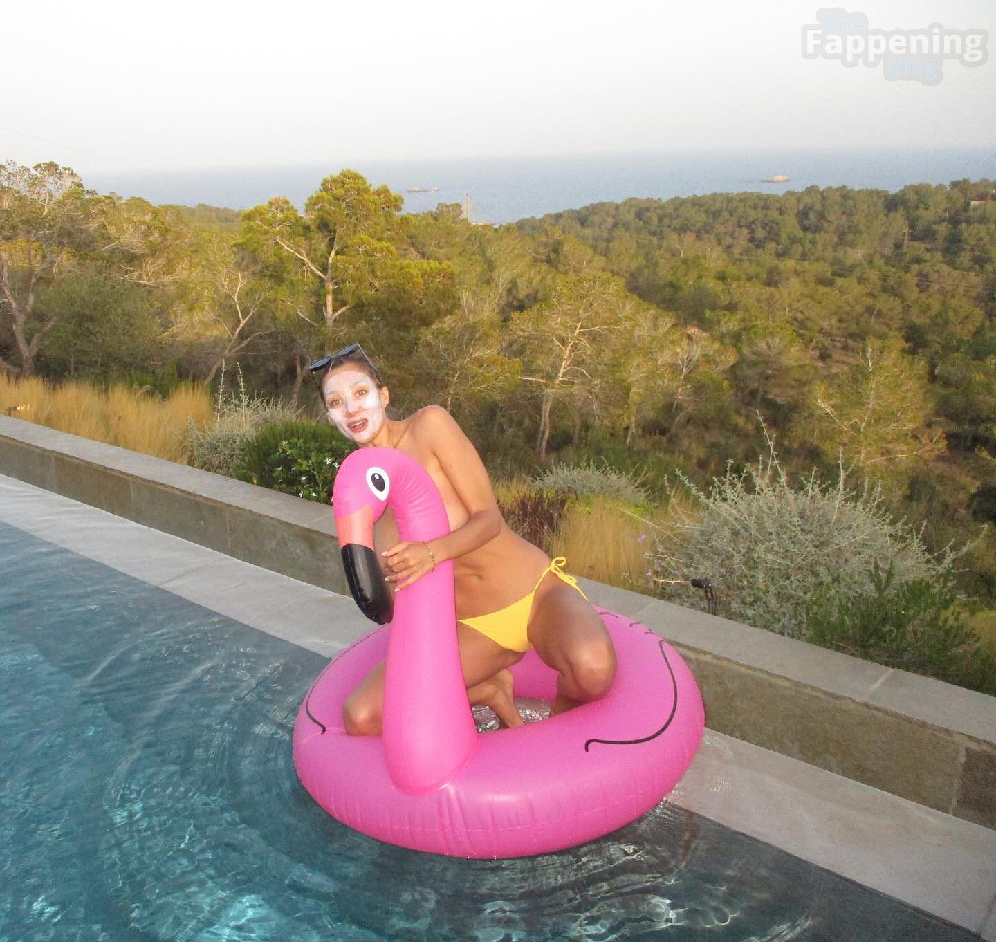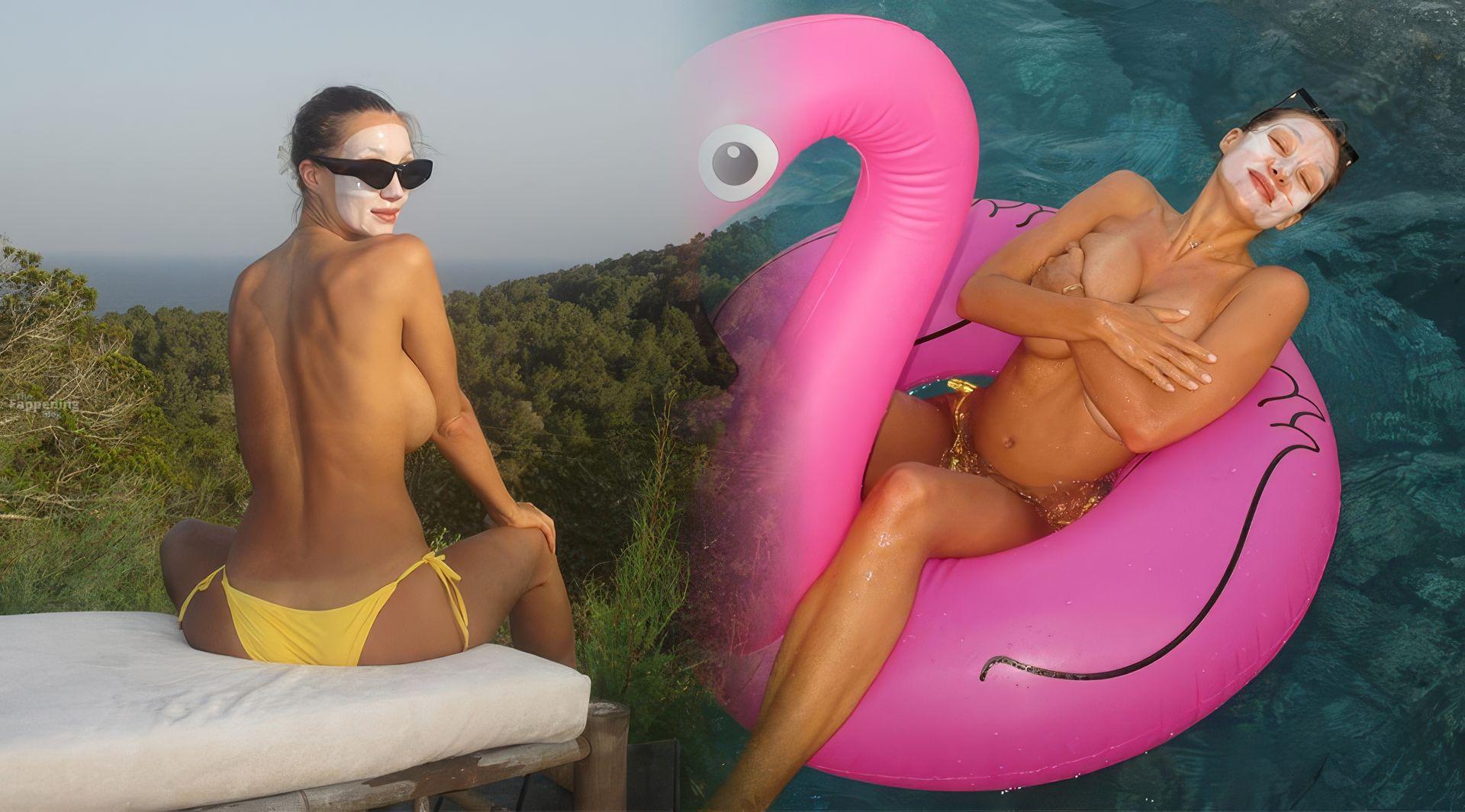 Penny Lane sfoggia un perizoma giallo e una maschera per il viso a bordo piscina, andando completamente topless in un servizio fotografico sui social media.