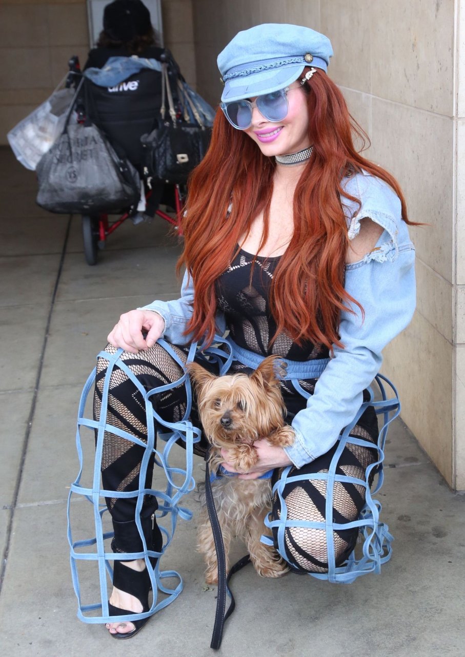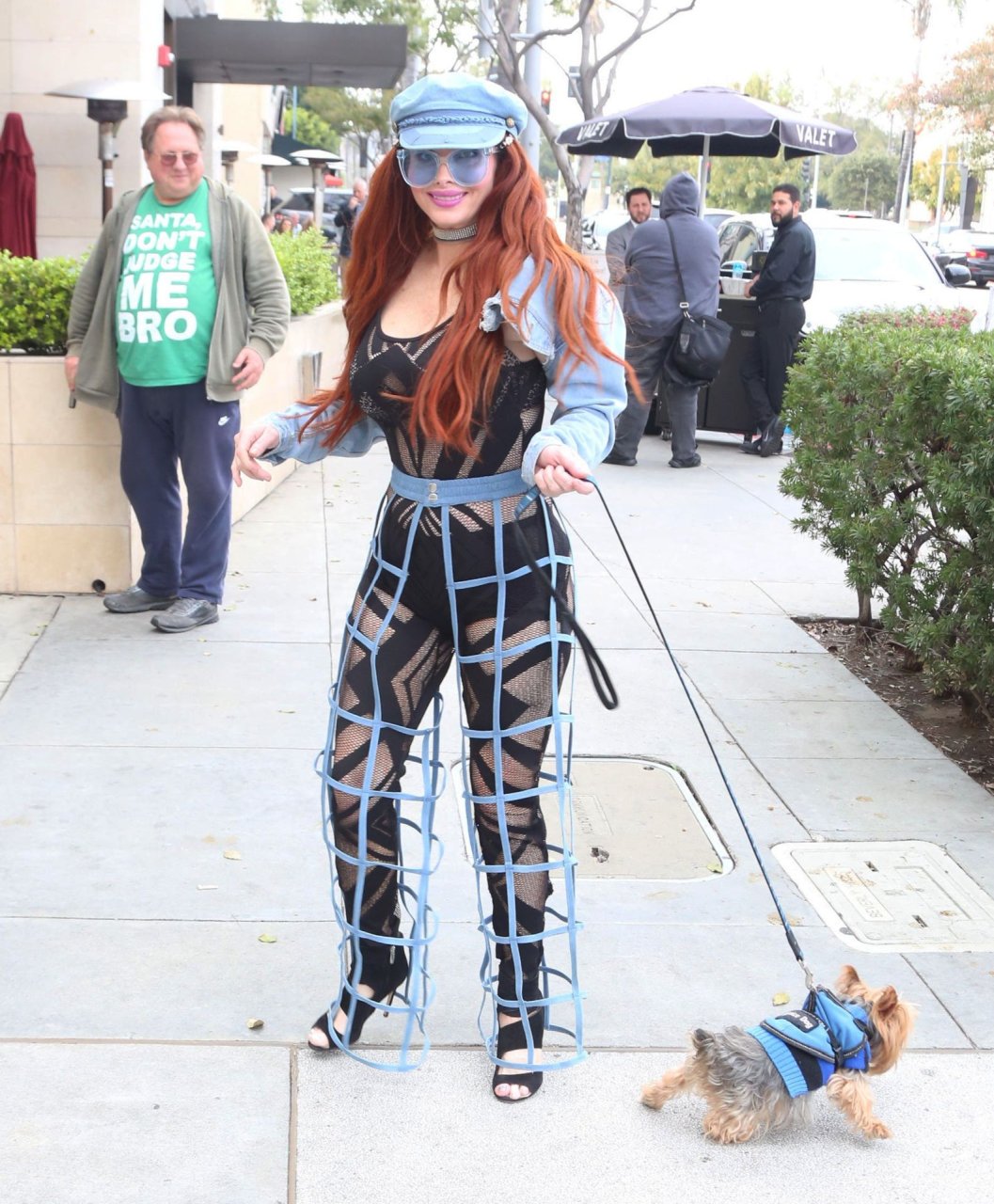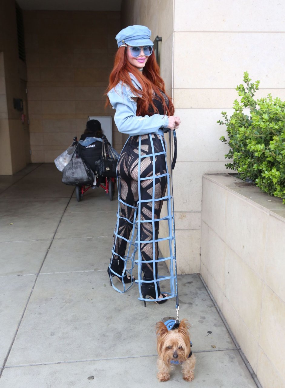Phoebe Price mostra le sue curve mentre porta a spasso il suo cane a Beverly Hills, 01/03/2019. La modella indossava un outfit interessante – pantaloni blu con tagli a gabbia e lingerie nera a rete sotto, un berretto da giornalaio e occhiali da sole blu. Questa signora sa come posare!