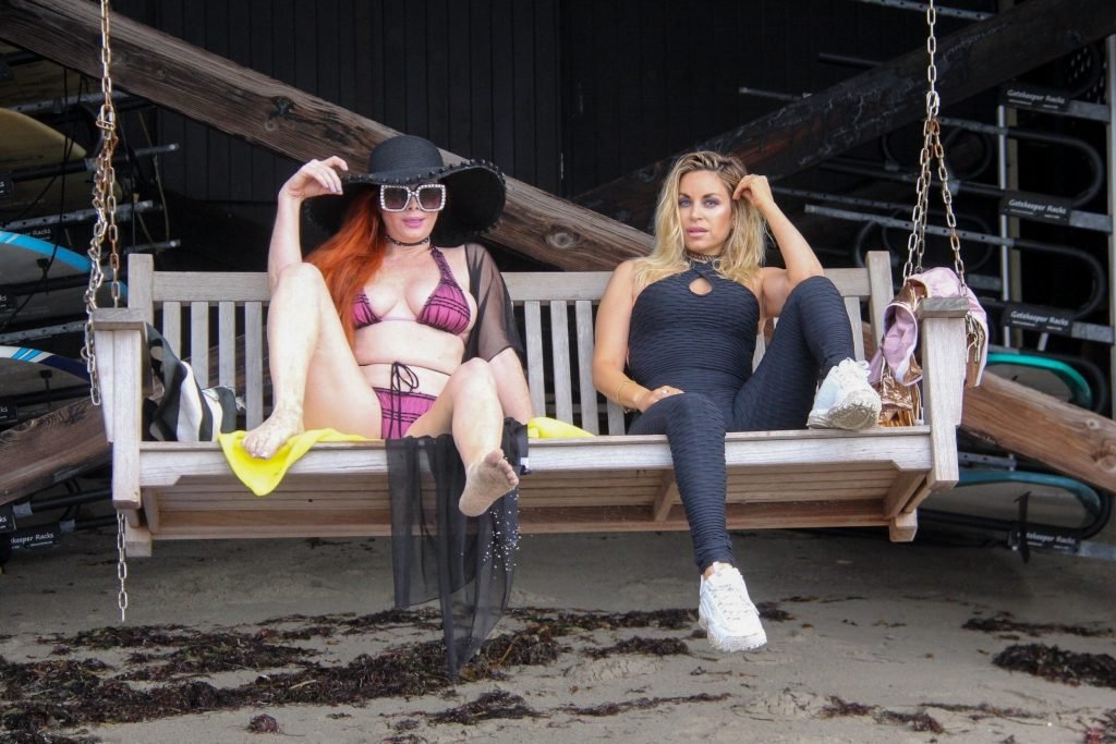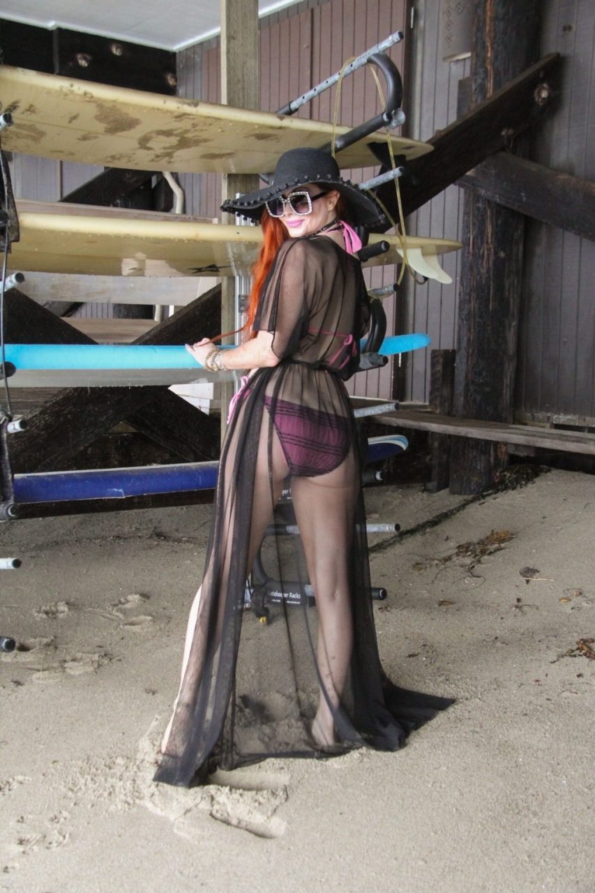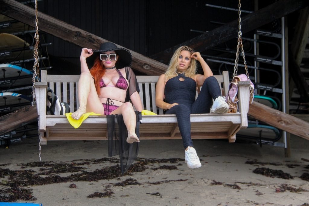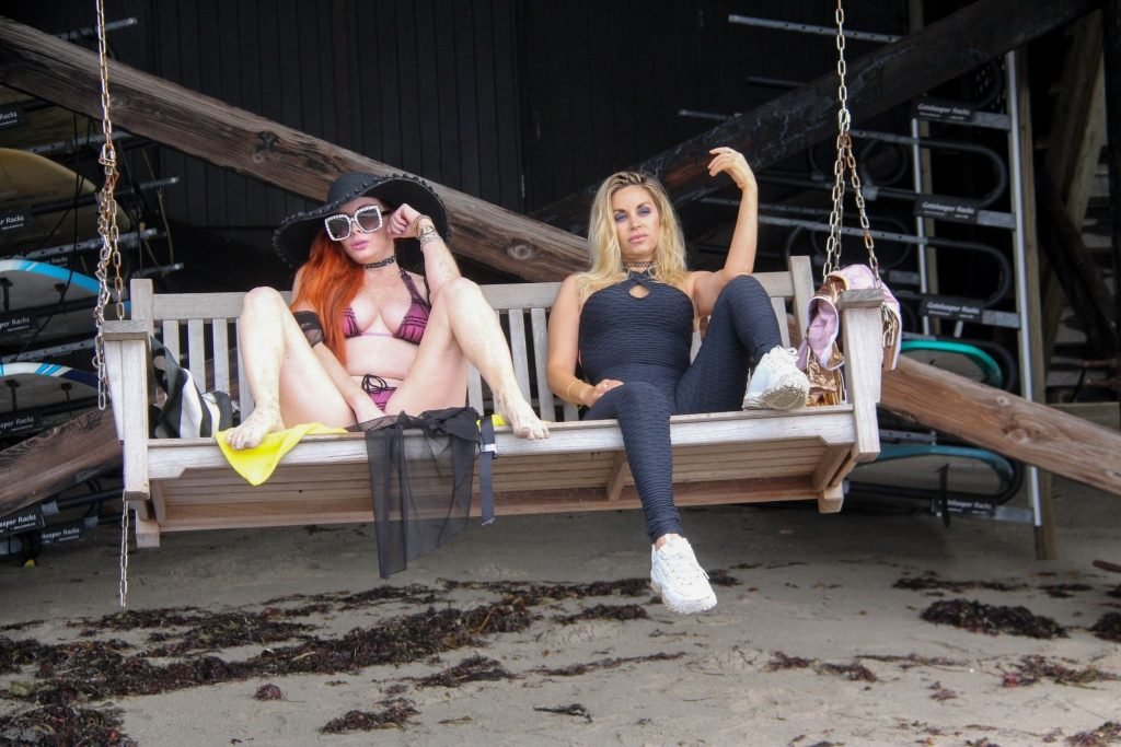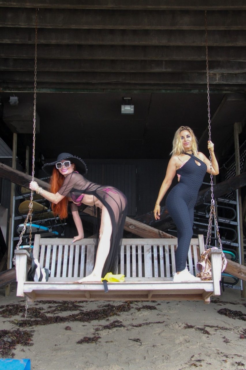 Phoebe Price (45) si gode un pomeriggio trascorrendo del tempo con la sua amica attrice Marcela Iglesias sulla spiaggia di Malibu, indossando un bikini nero e viola con un copricostume trasparente, 18/07/2018. Le due posano e si siedono su un’altalena mentre aspettano che esca il sole.