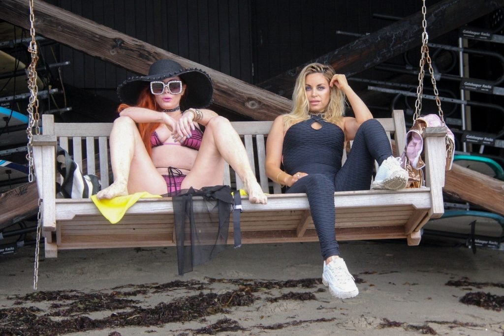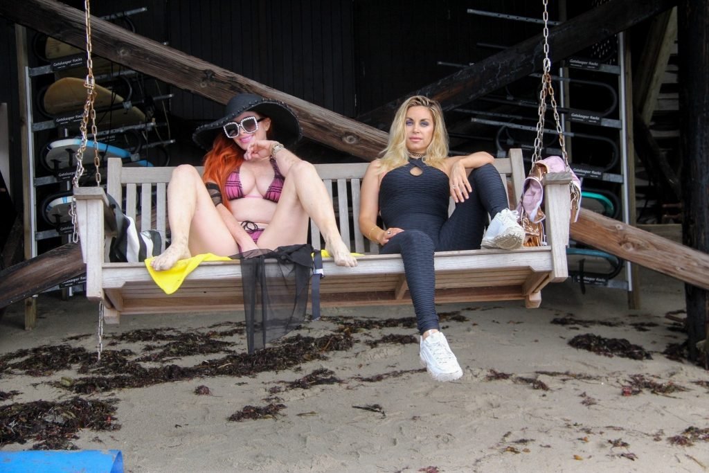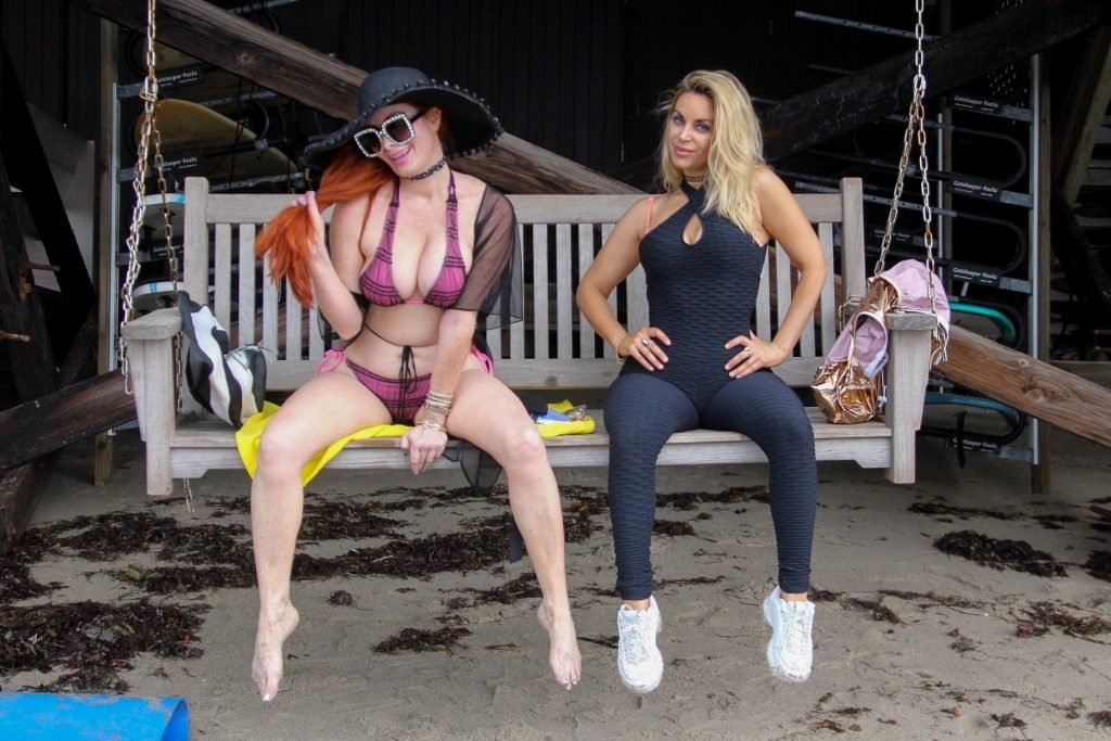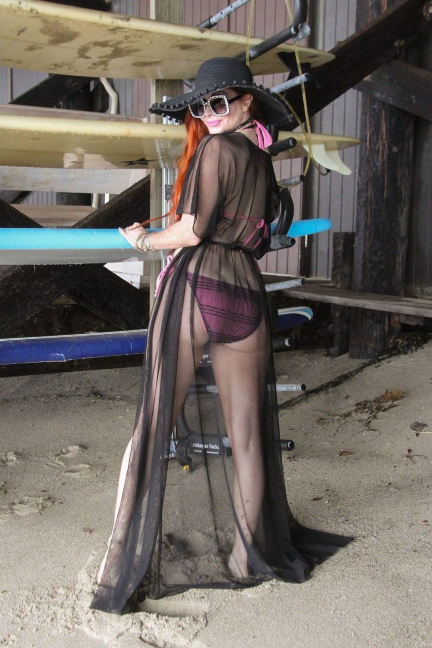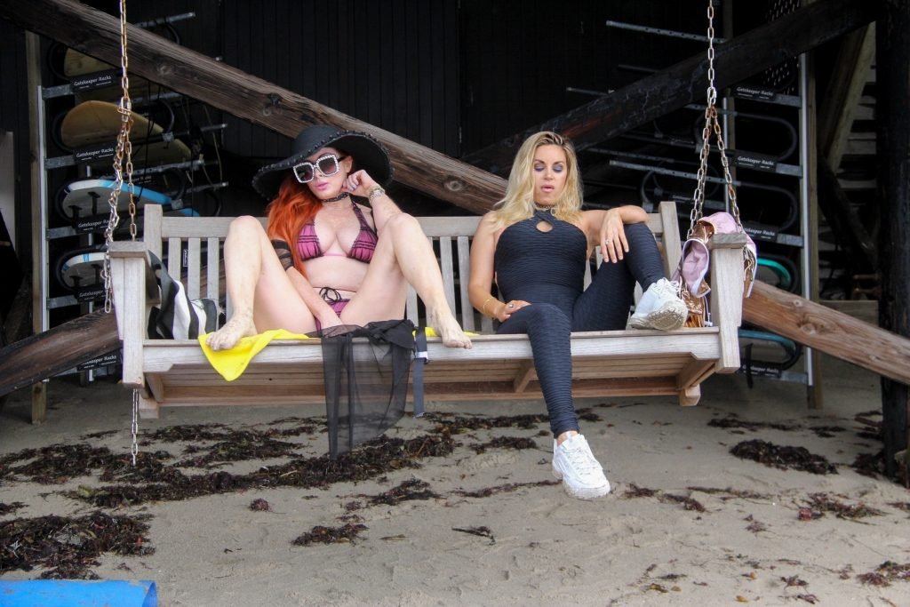 Phoebe Price (45) si gode un pomeriggio trascorrendo del tempo con la sua amica attrice Marcela Iglesias sulla spiaggia di Malibu, indossando un bikini nero e viola con un copricostume trasparente, 18/07/2018. Le due posano e si siedono su un’altalena mentre aspettano che esca il sole.