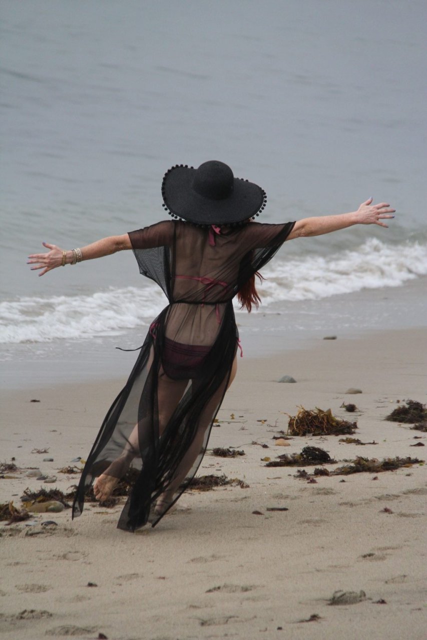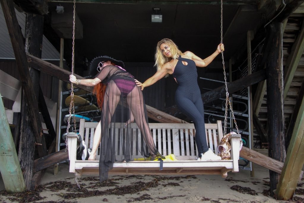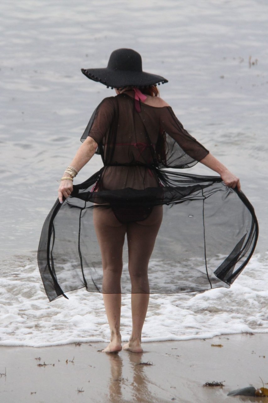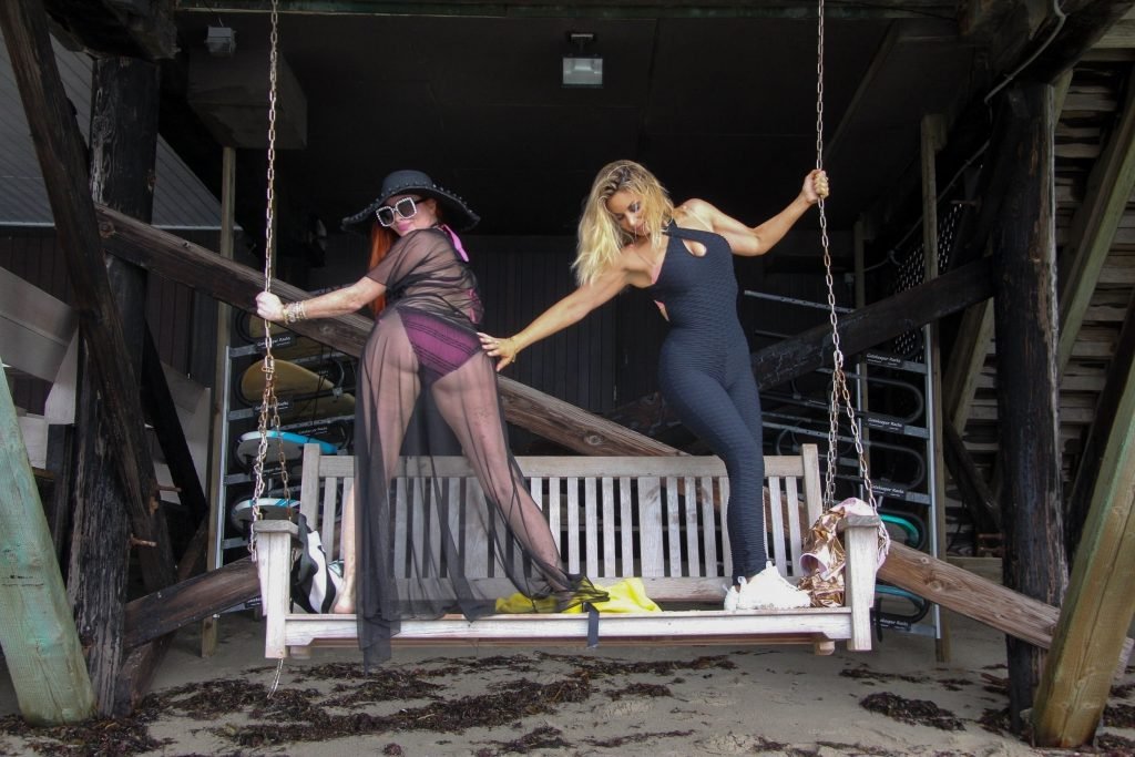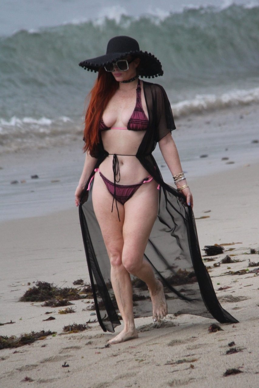 Phoebe Price (45) si gode un pomeriggio trascorrendo del tempo con la sua amica attrice Marcela Iglesias sulla spiaggia di Malibu, indossando un bikini nero e viola con un copricostume trasparente, 18/07/2018. Le due posano e si siedono su un’altalena mentre aspettano che esca il sole.