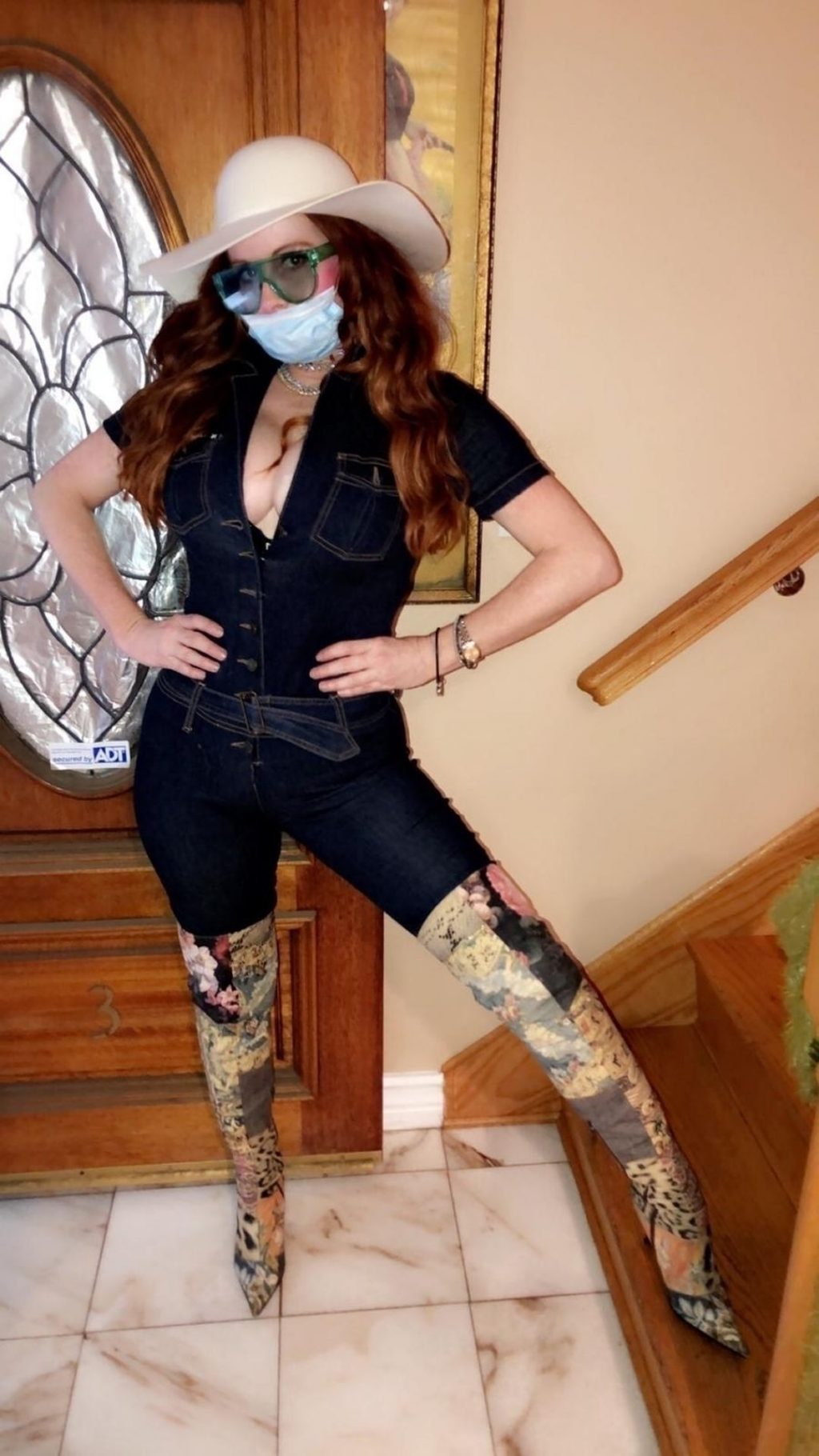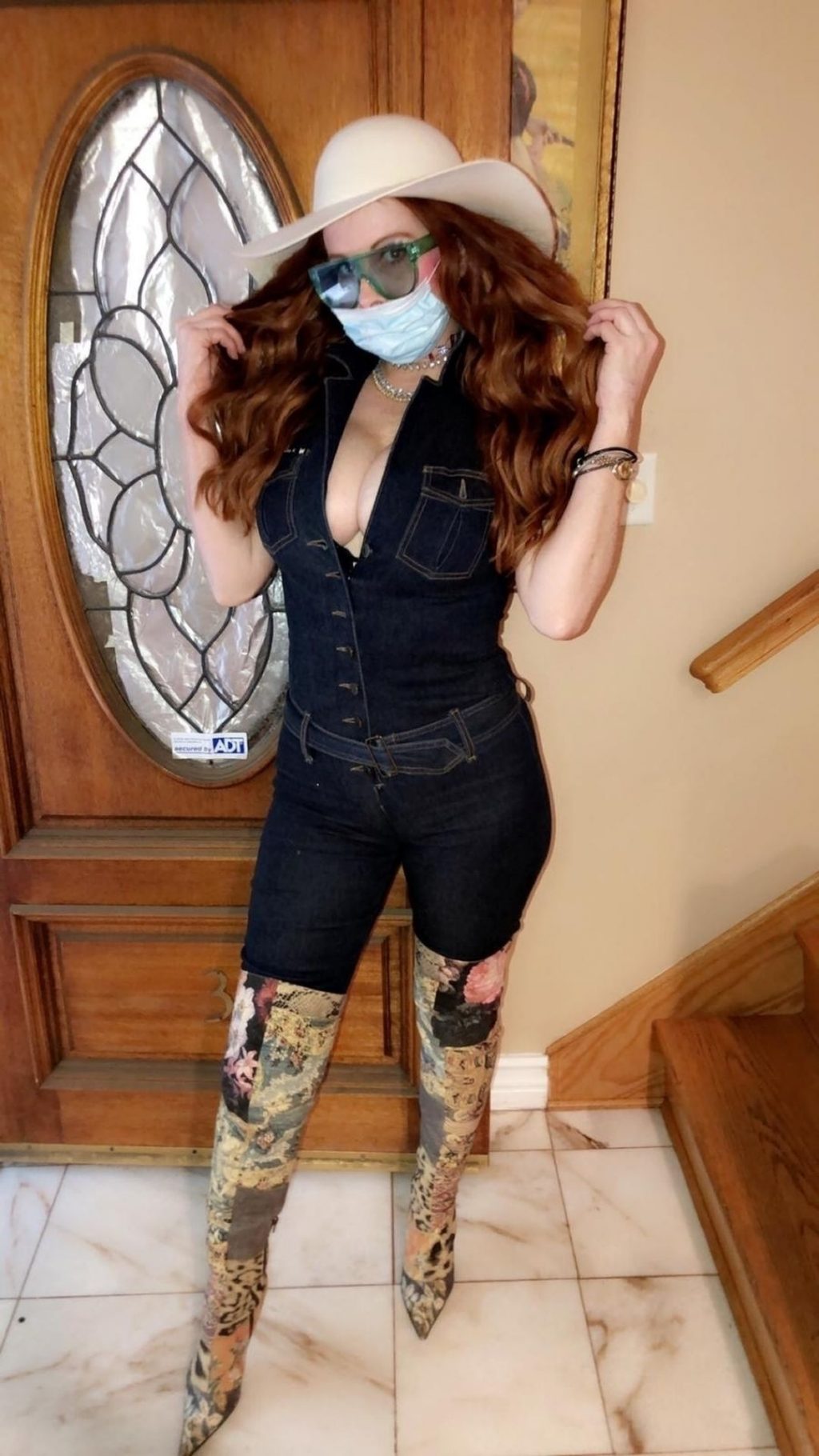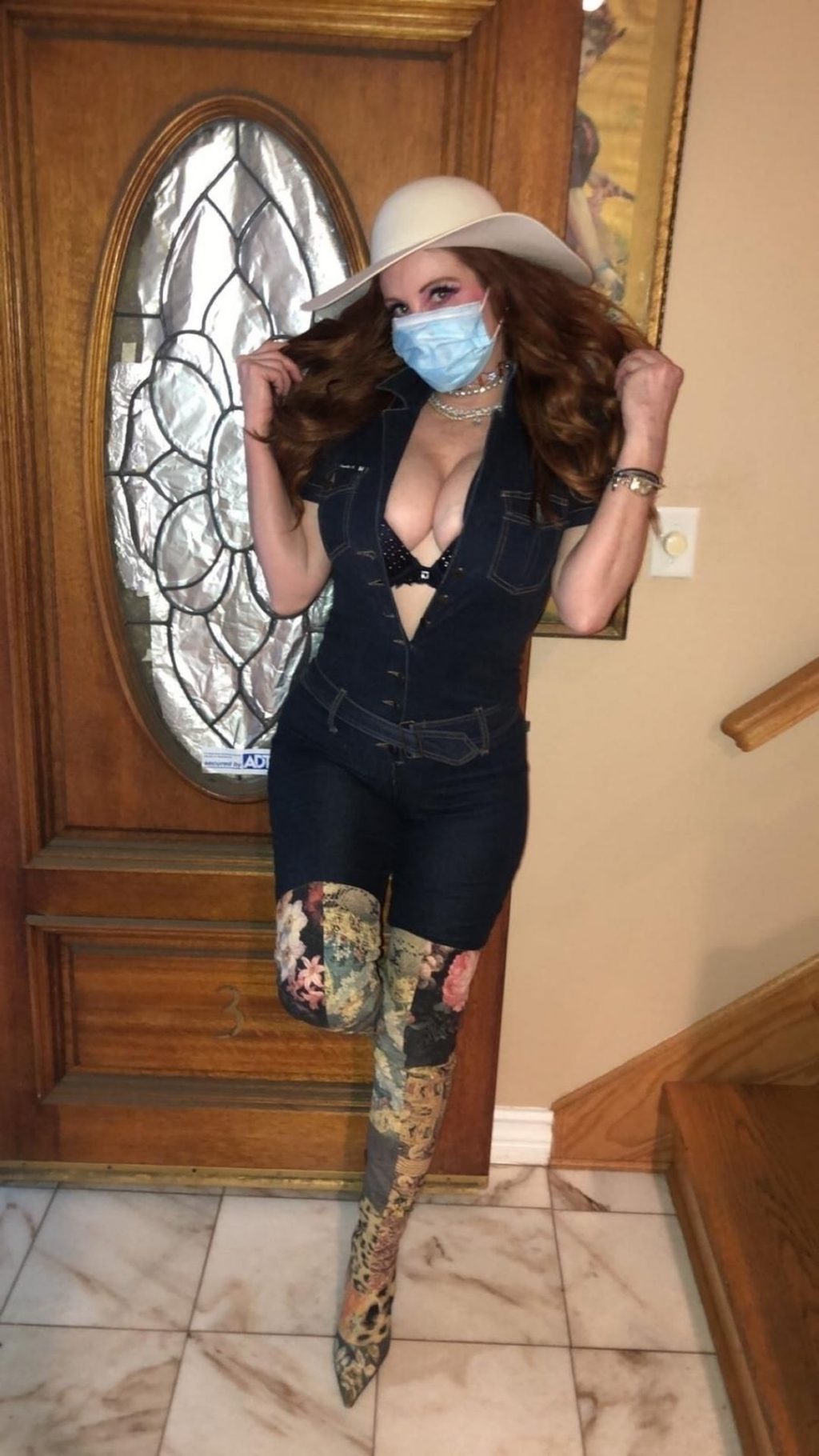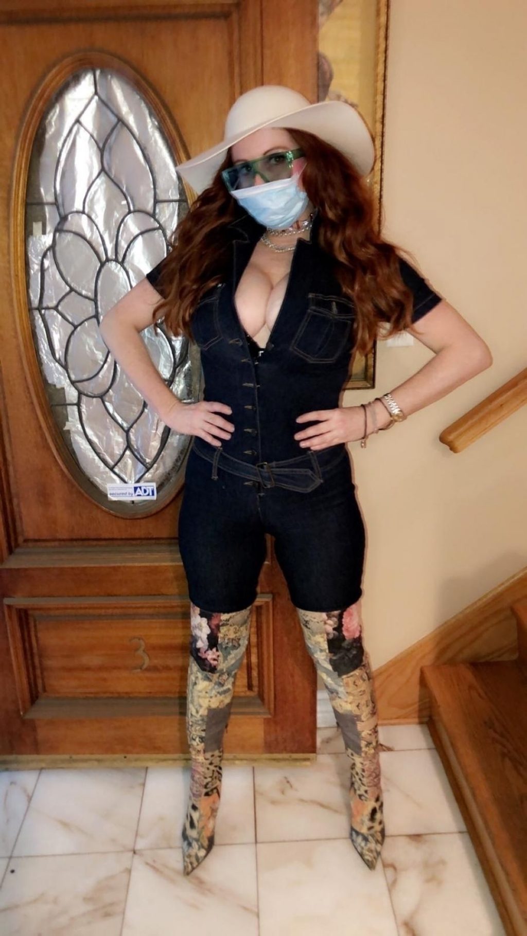 Phoebe Price posa per foto con la sua maschera Coronavirus nella sua casa a Beverly Hills, 03/10/2020.