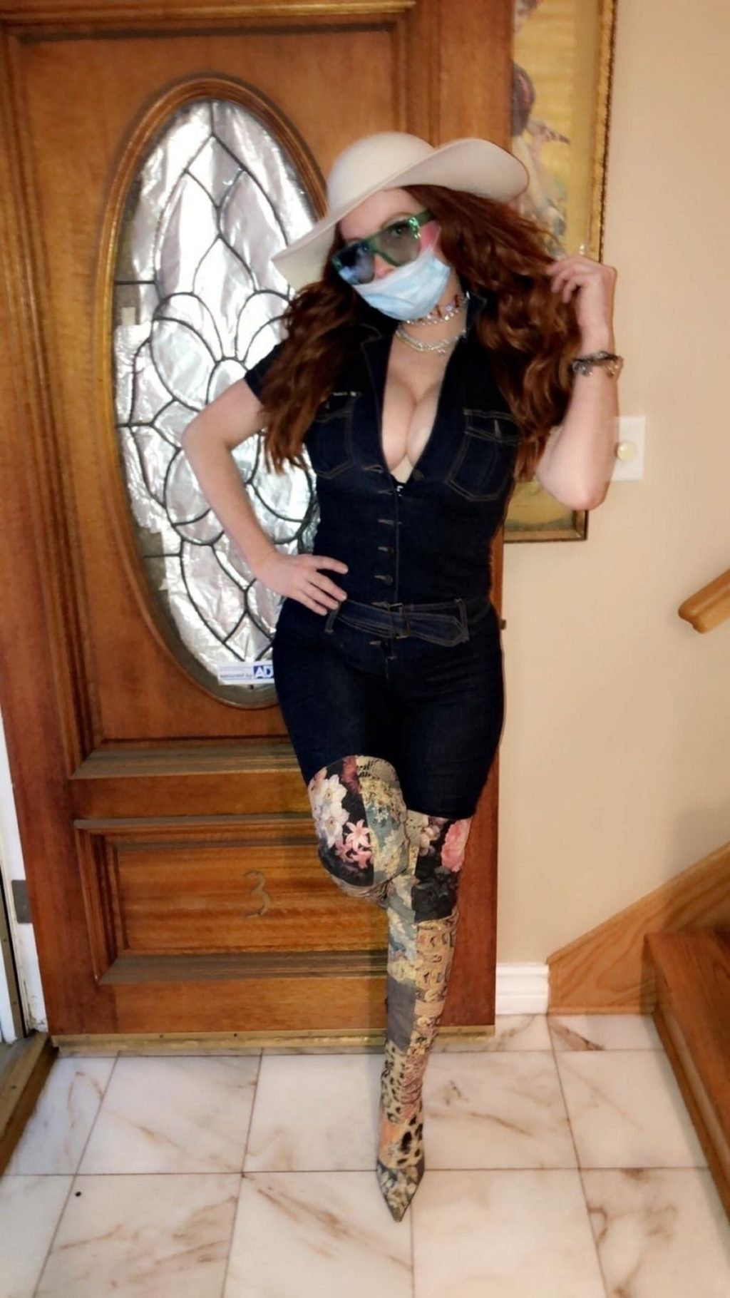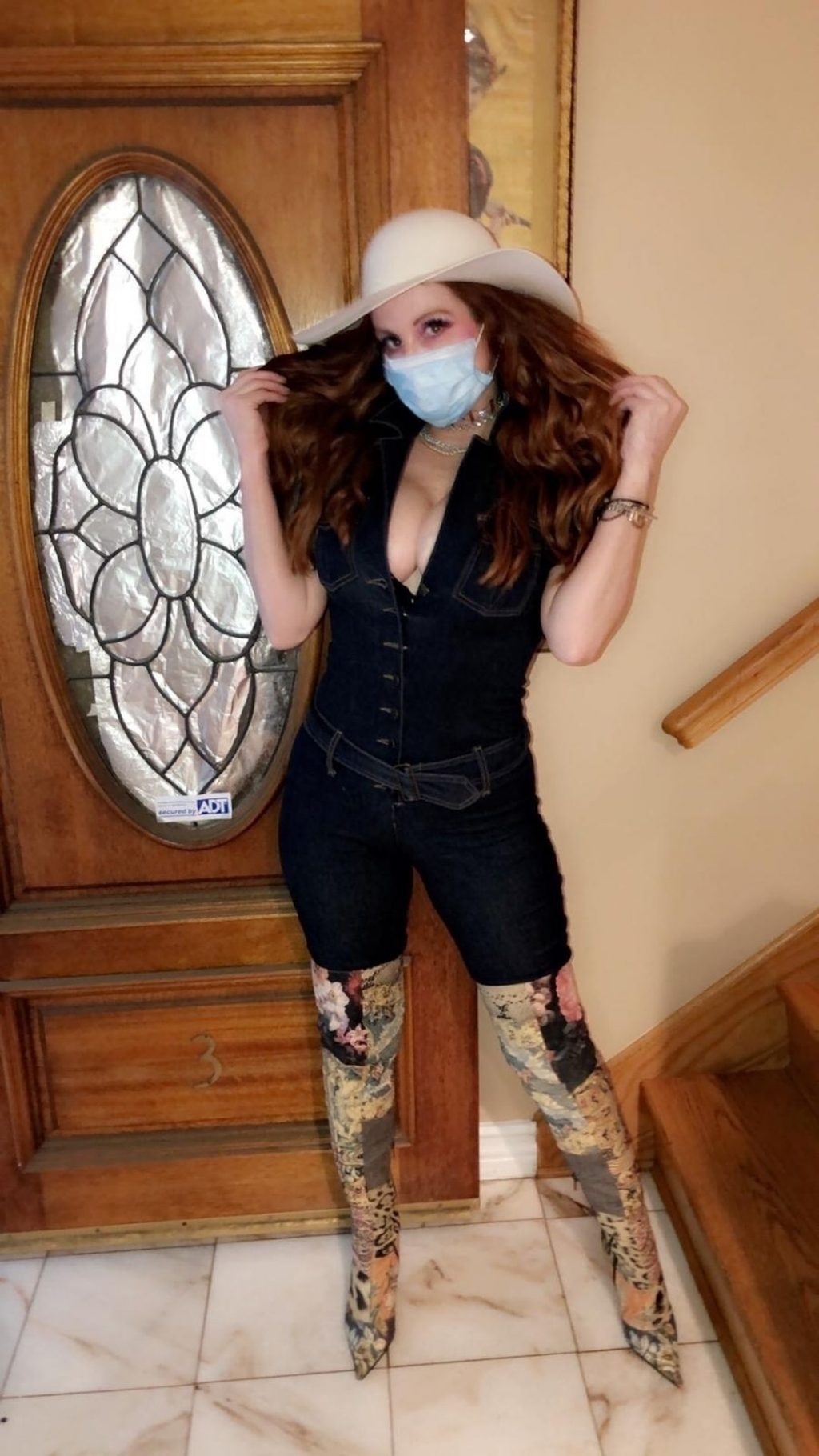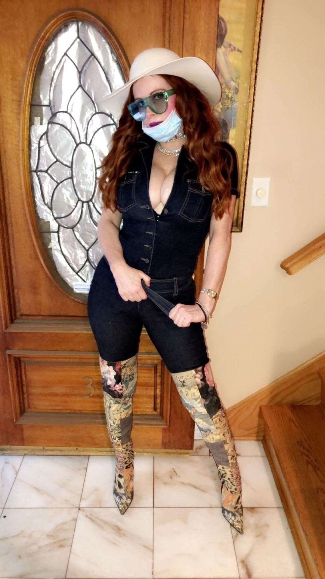 Phoebe Price posa per foto con la sua maschera Coronavirus nella sua casa a Beverly Hills, 03/10/2020.