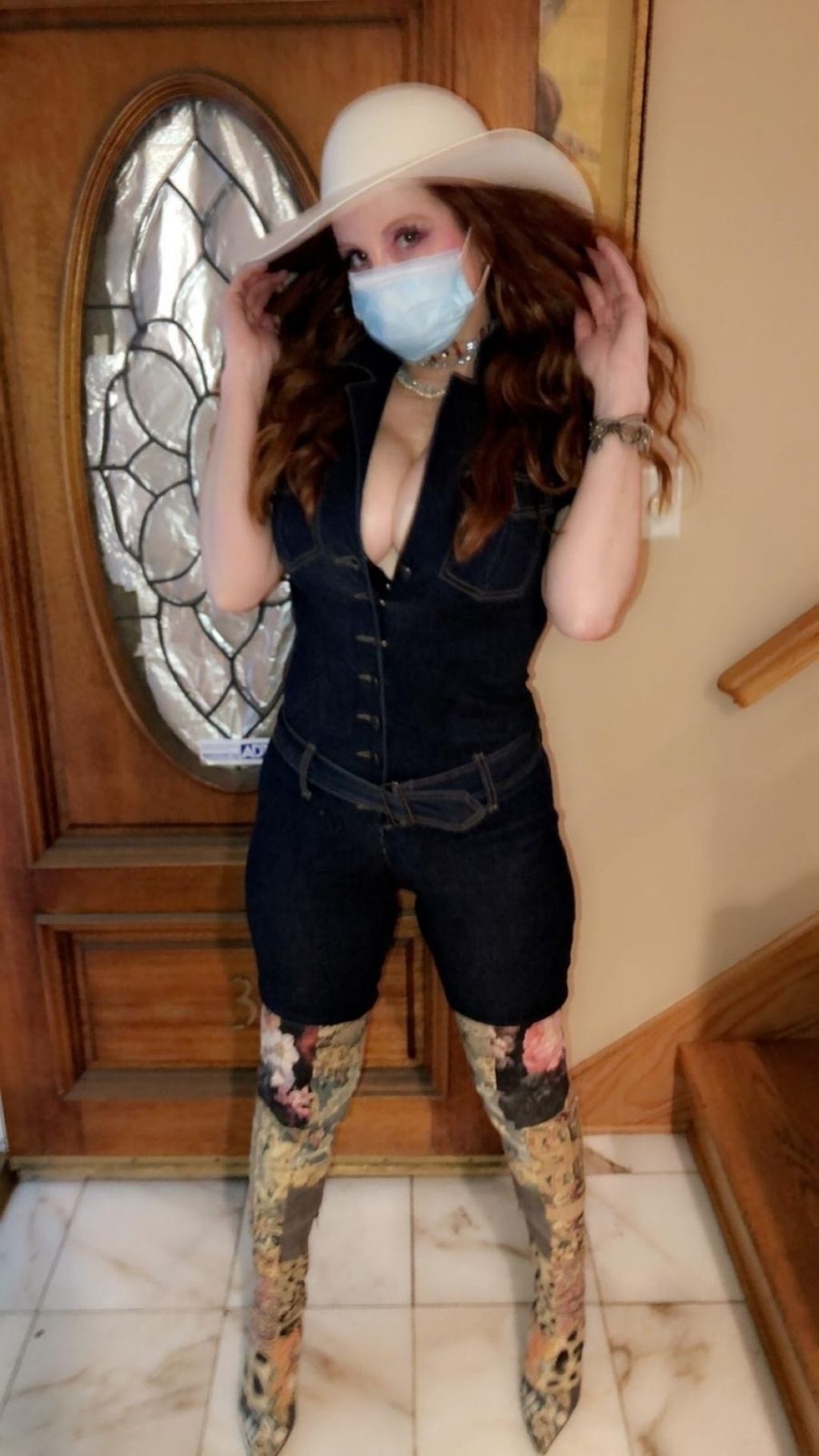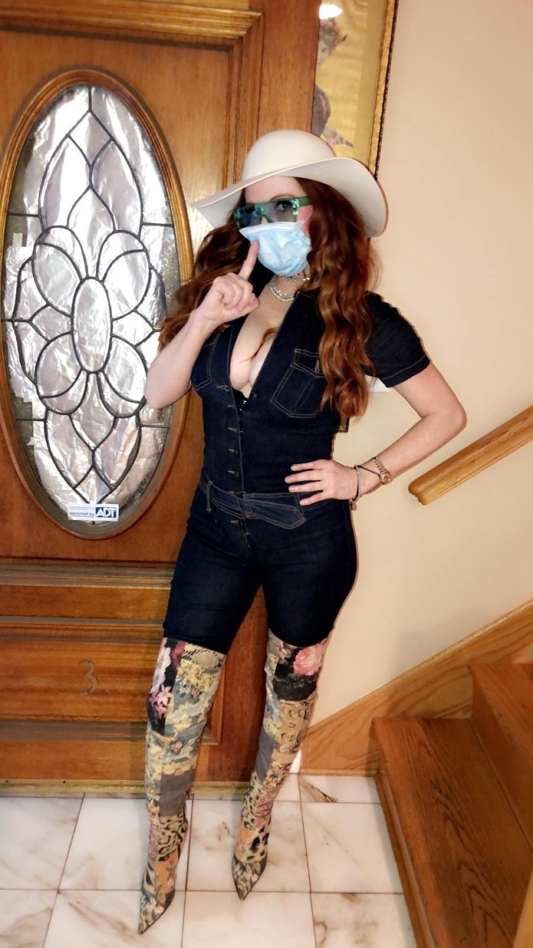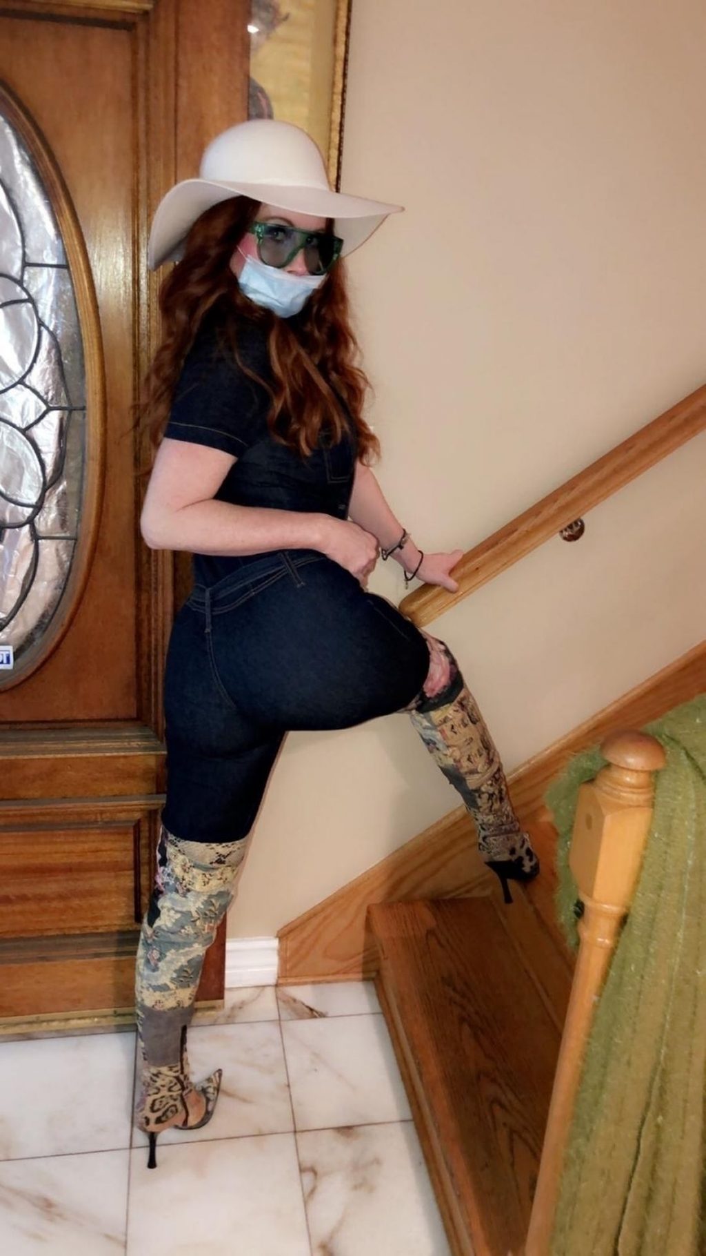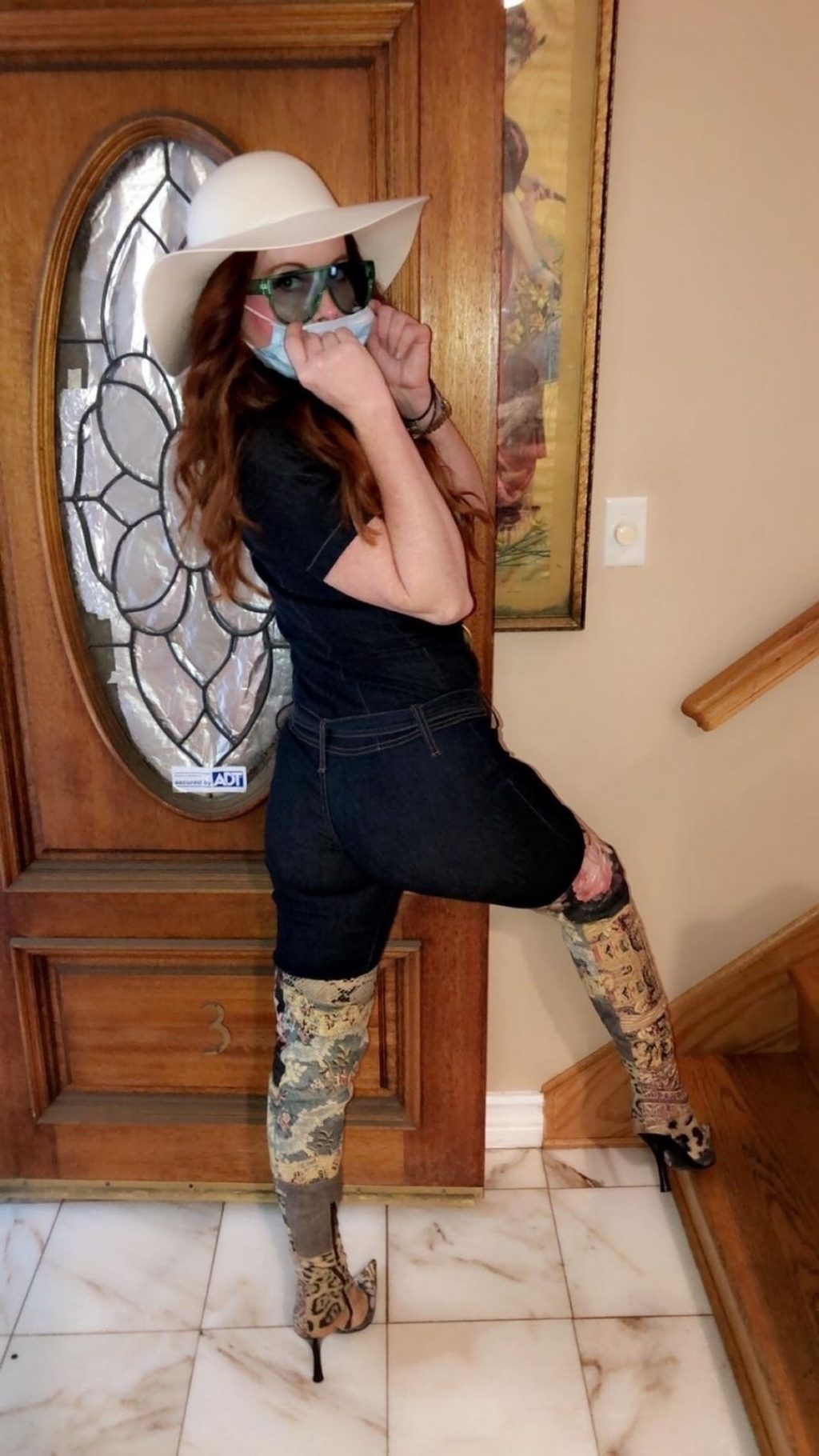 Phoebe Price posa per foto con la sua maschera Coronavirus nella sua casa a Beverly Hills, 03/10/2020.