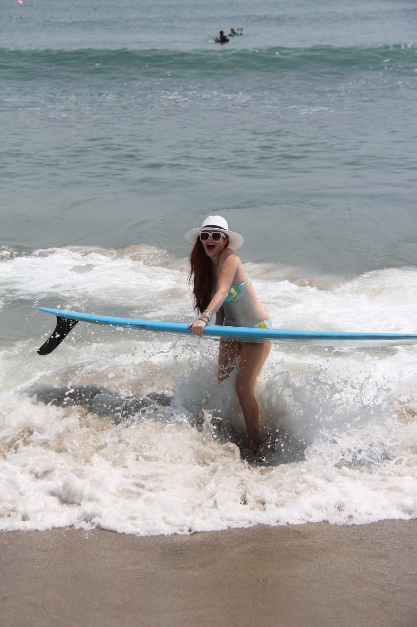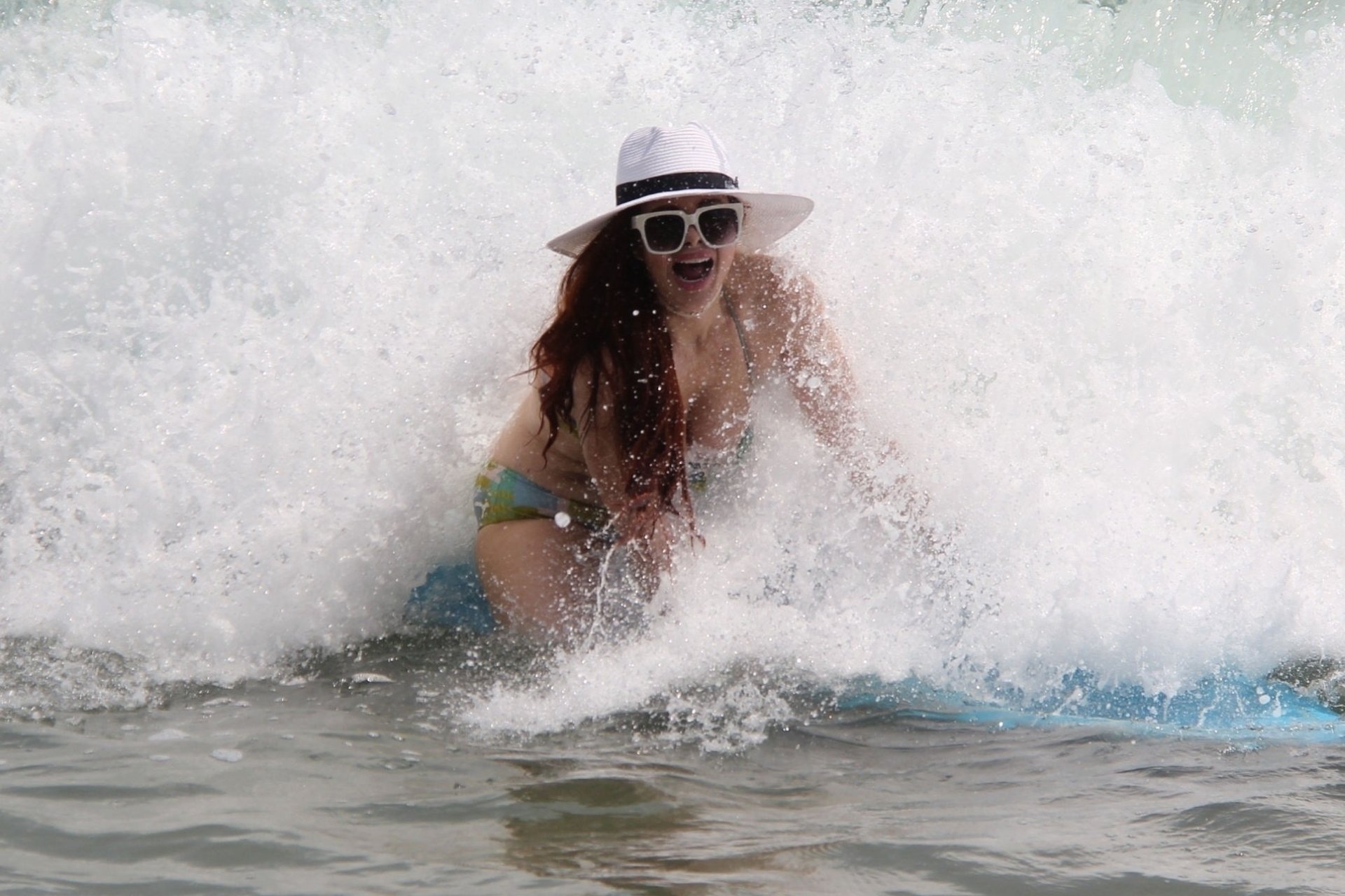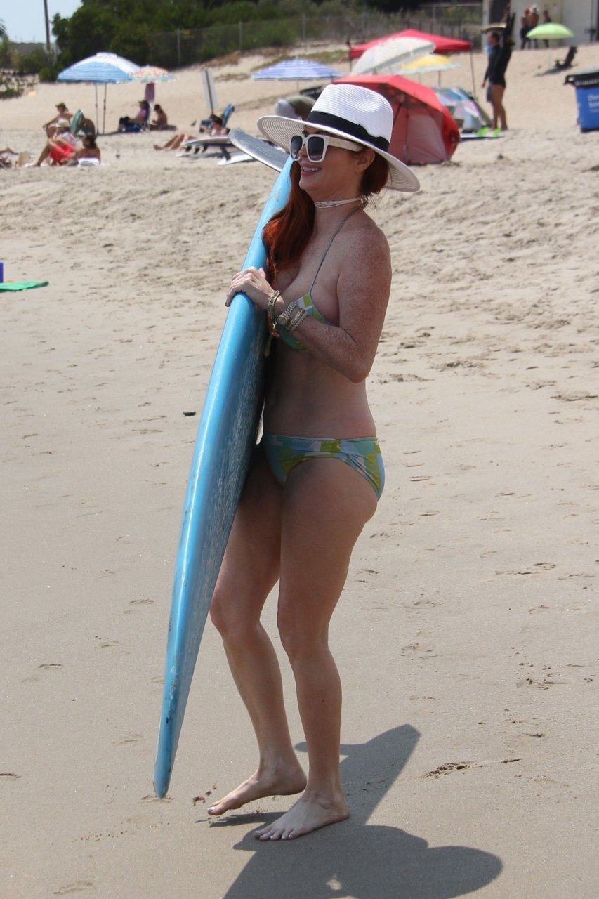 L’ex attrice Phoebe Price (45) si cimenta nel surf mentre mostra il suo corpo in bikini sulla spiaggia di Malibu, CA, 12/08/2018.