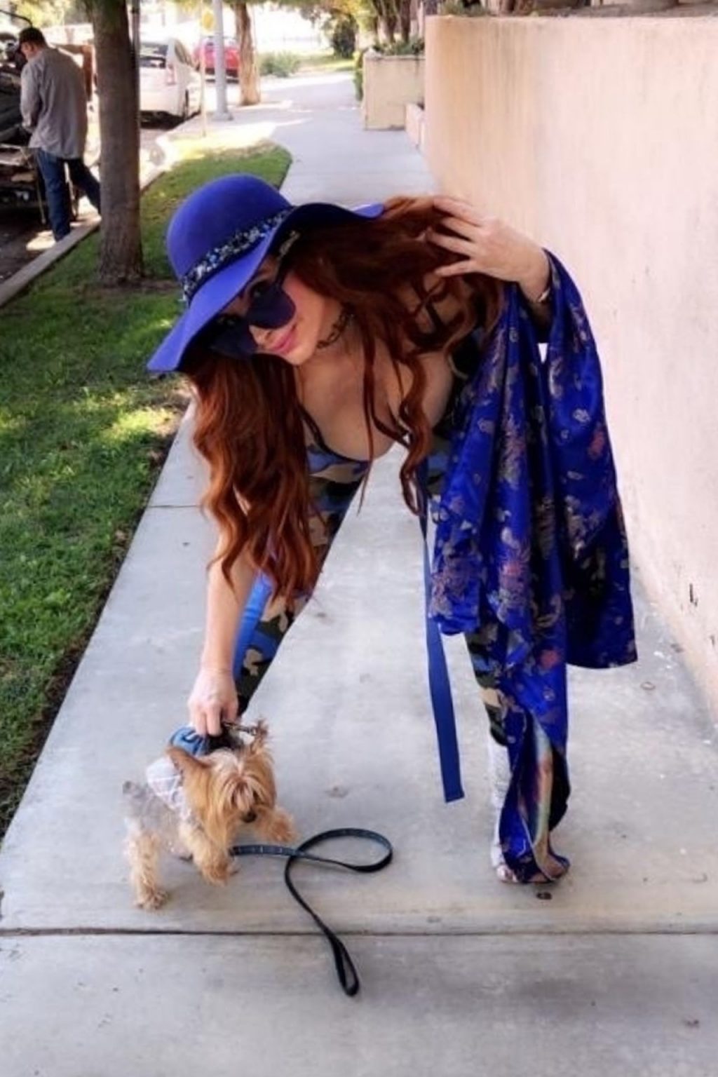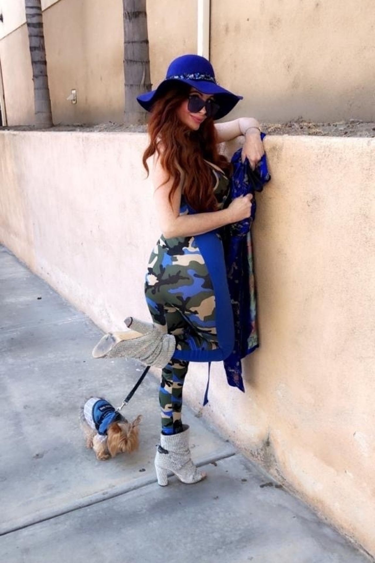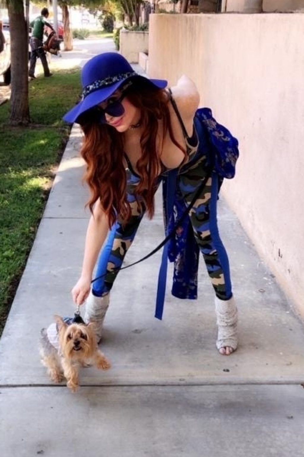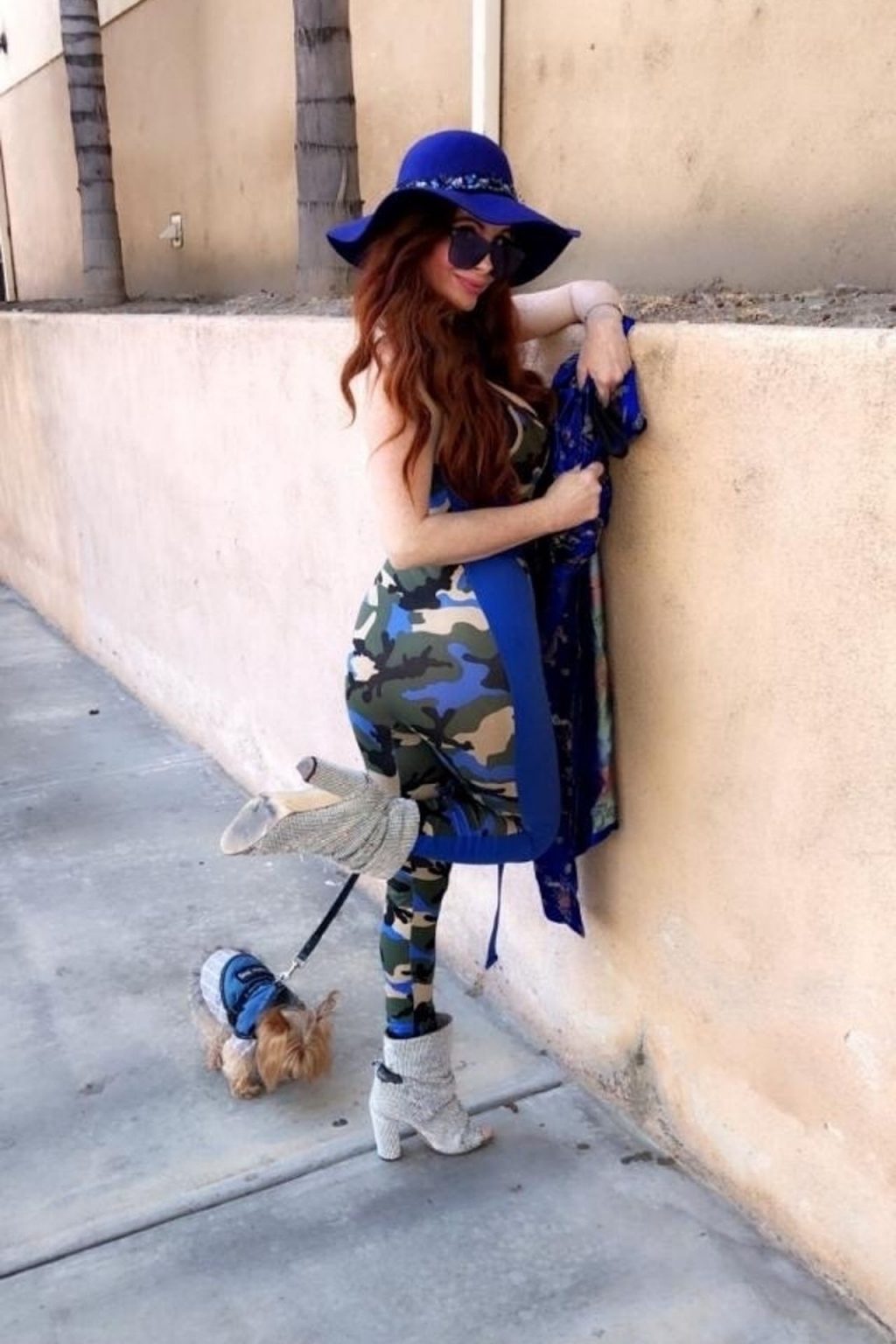 L’attrice Phoebe Price indossa un completo mimetico blu mentre porta a spasso il suo cane a Beverly Hills, 18/11/2019.