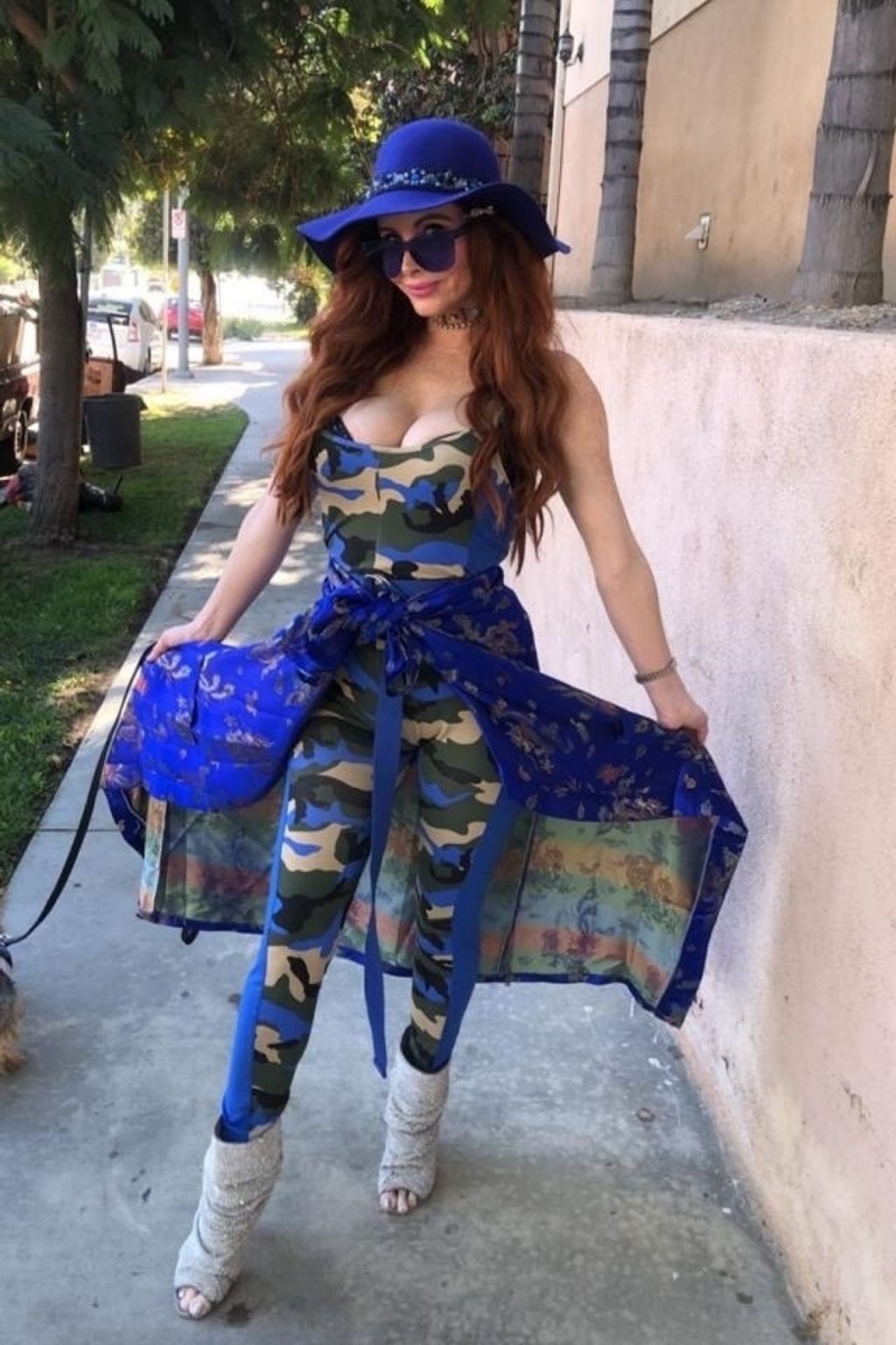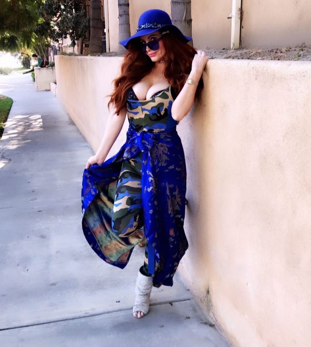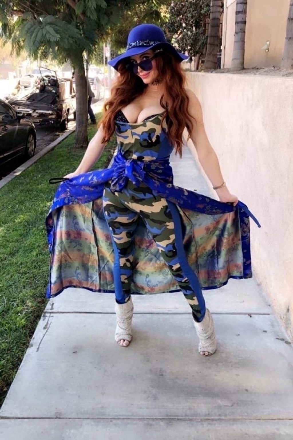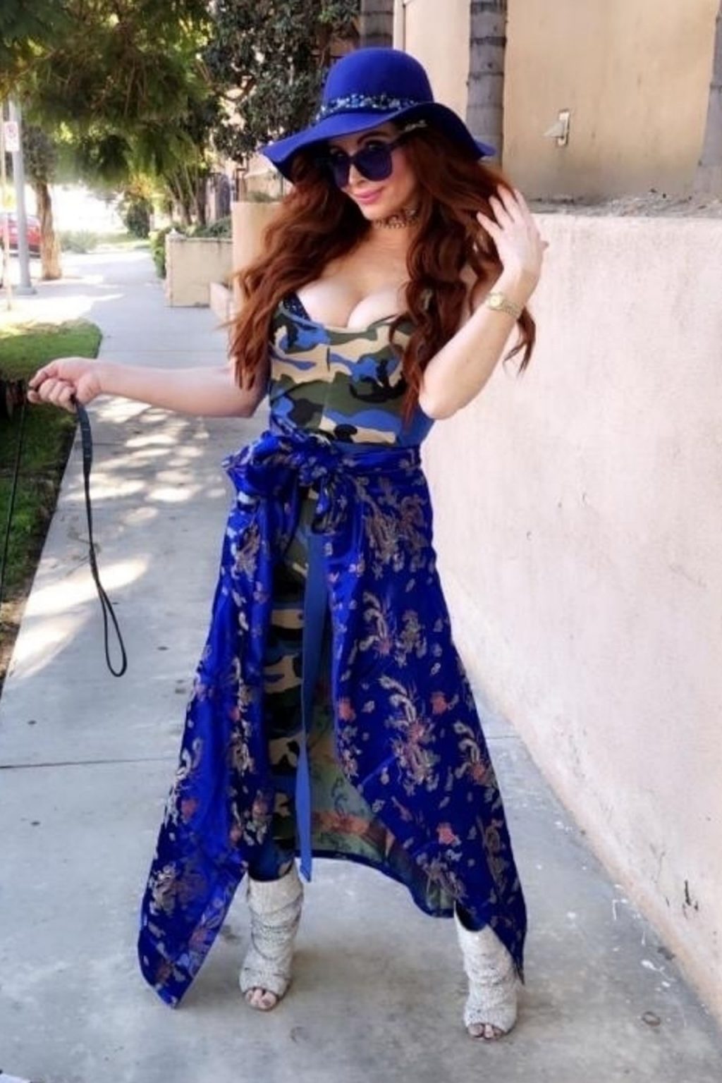 L’attrice Phoebe Price indossa un completo mimetico blu mentre porta a spasso il suo cane a Beverly Hills, 18/11/2019.