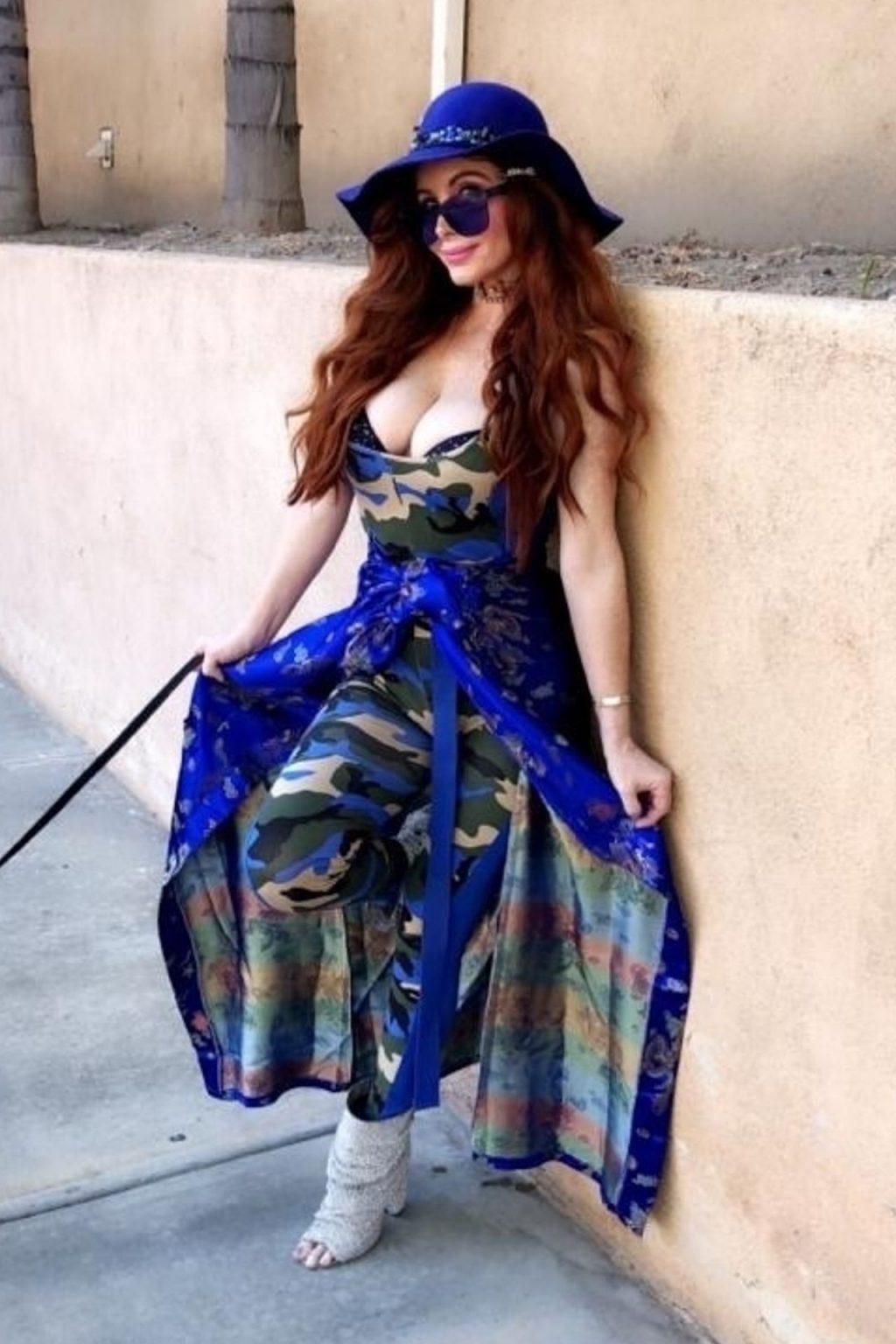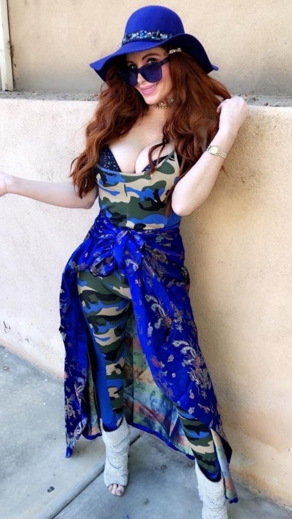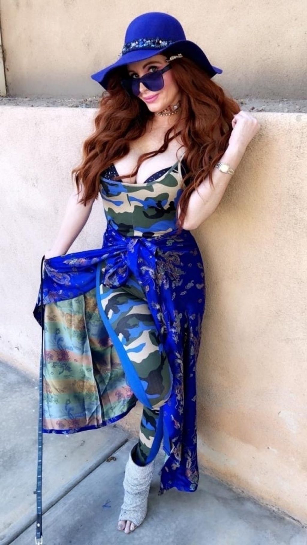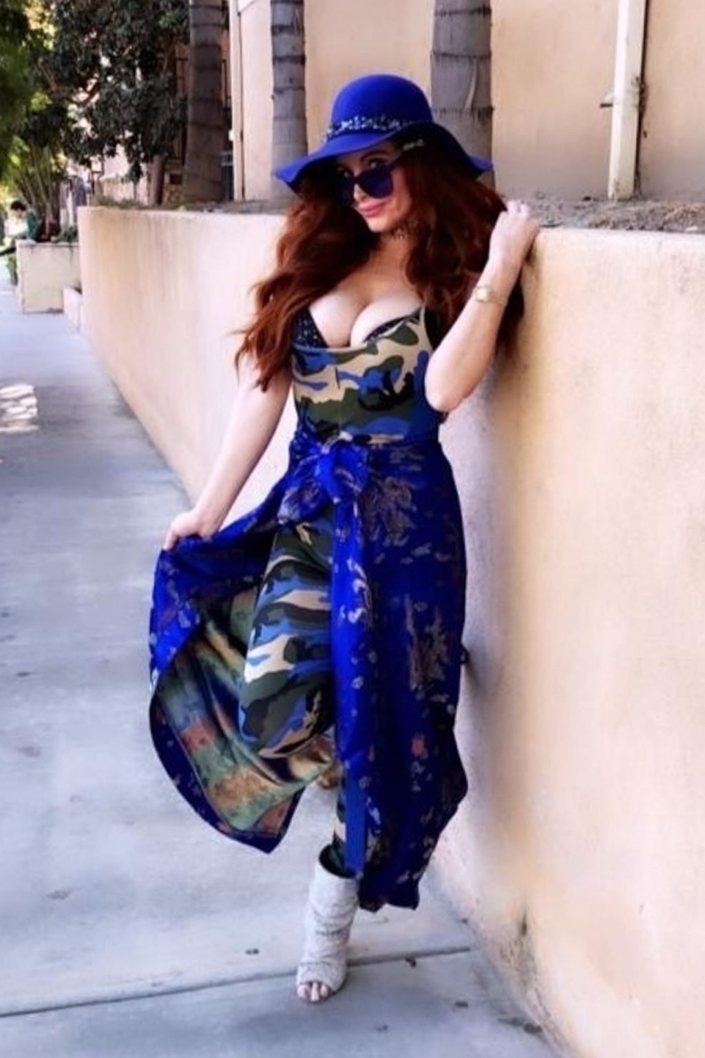 L’attrice Phoebe Price indossa un completo mimetico blu mentre porta a spasso il suo cane a Beverly Hills, 18/11/2019.