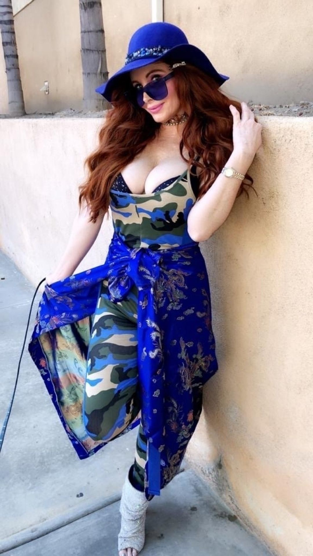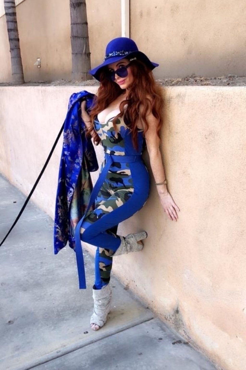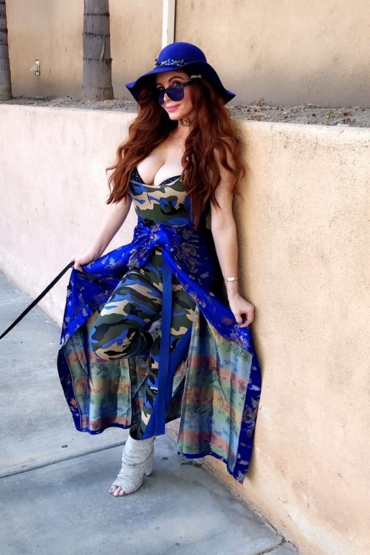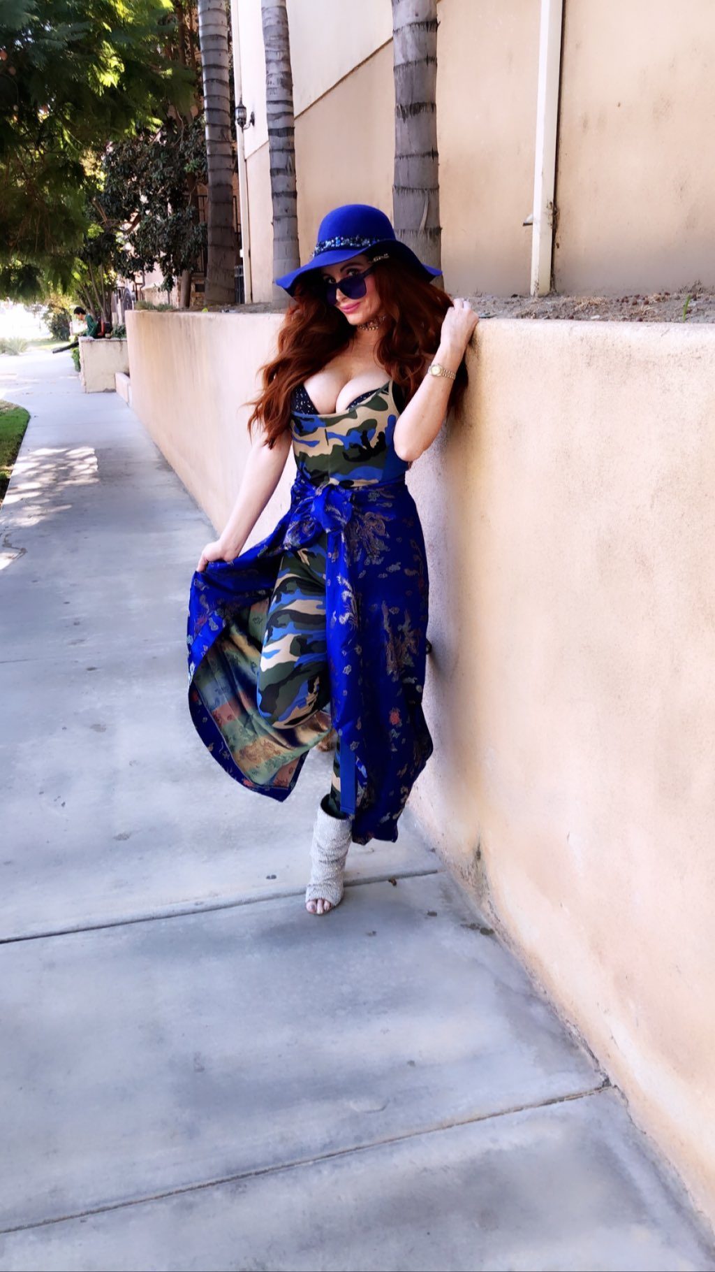 L’attrice Phoebe Price indossa un completo mimetico blu mentre porta a spasso il suo cane a Beverly Hills, 18/11/2019.