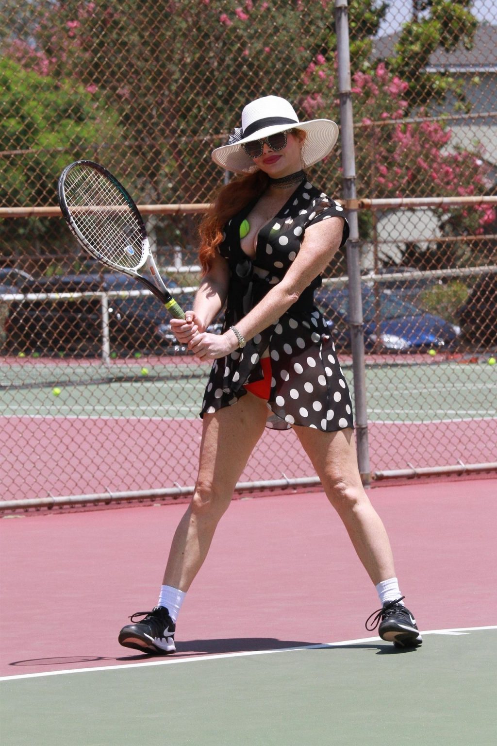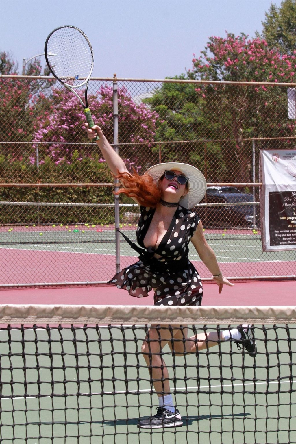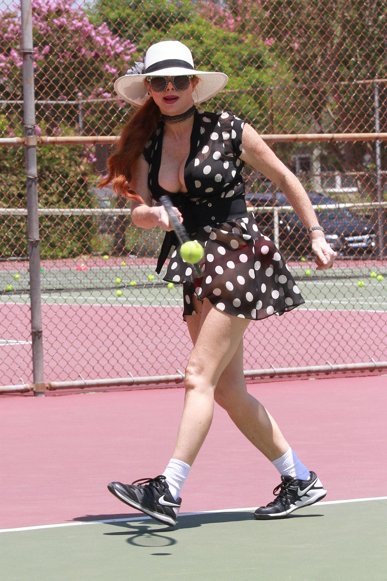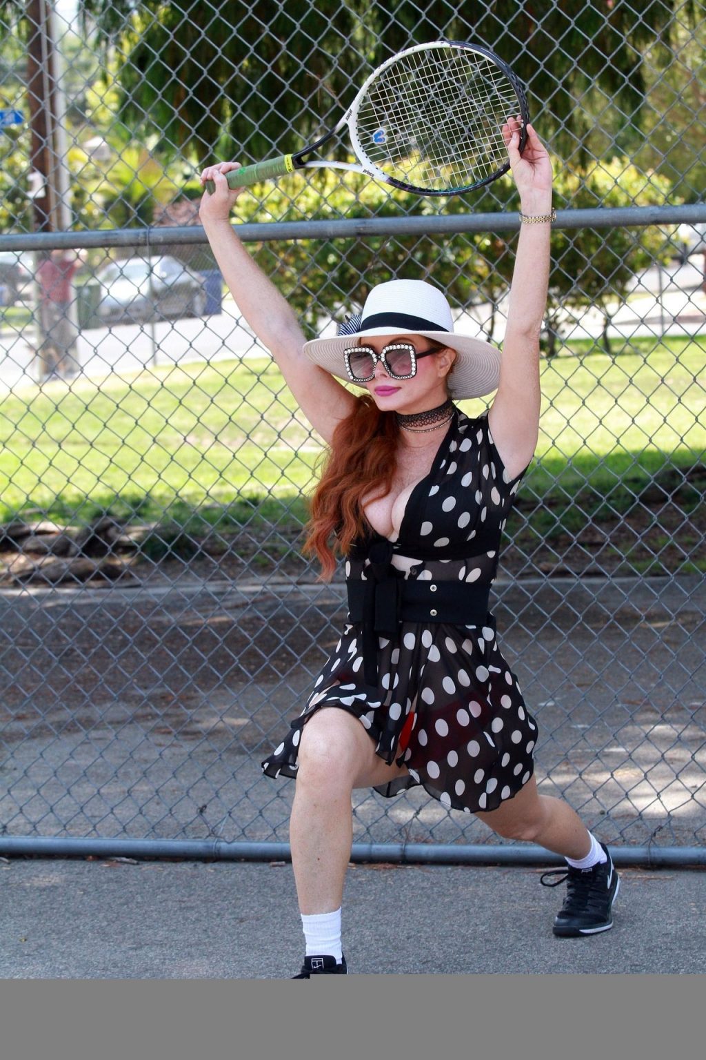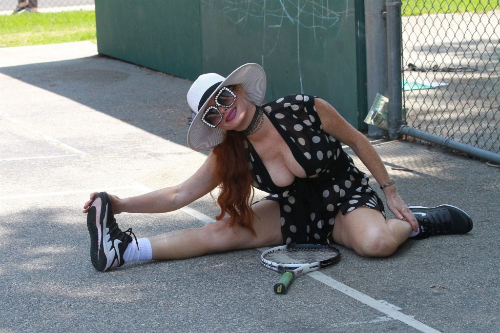 L’attrice sfoggia un nuovo outfit per i campi e un bel décolleté. Si diverte a colpire le palline e si allena.