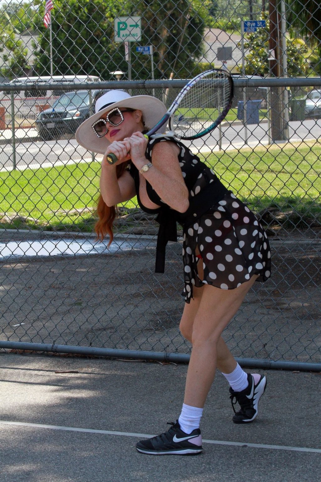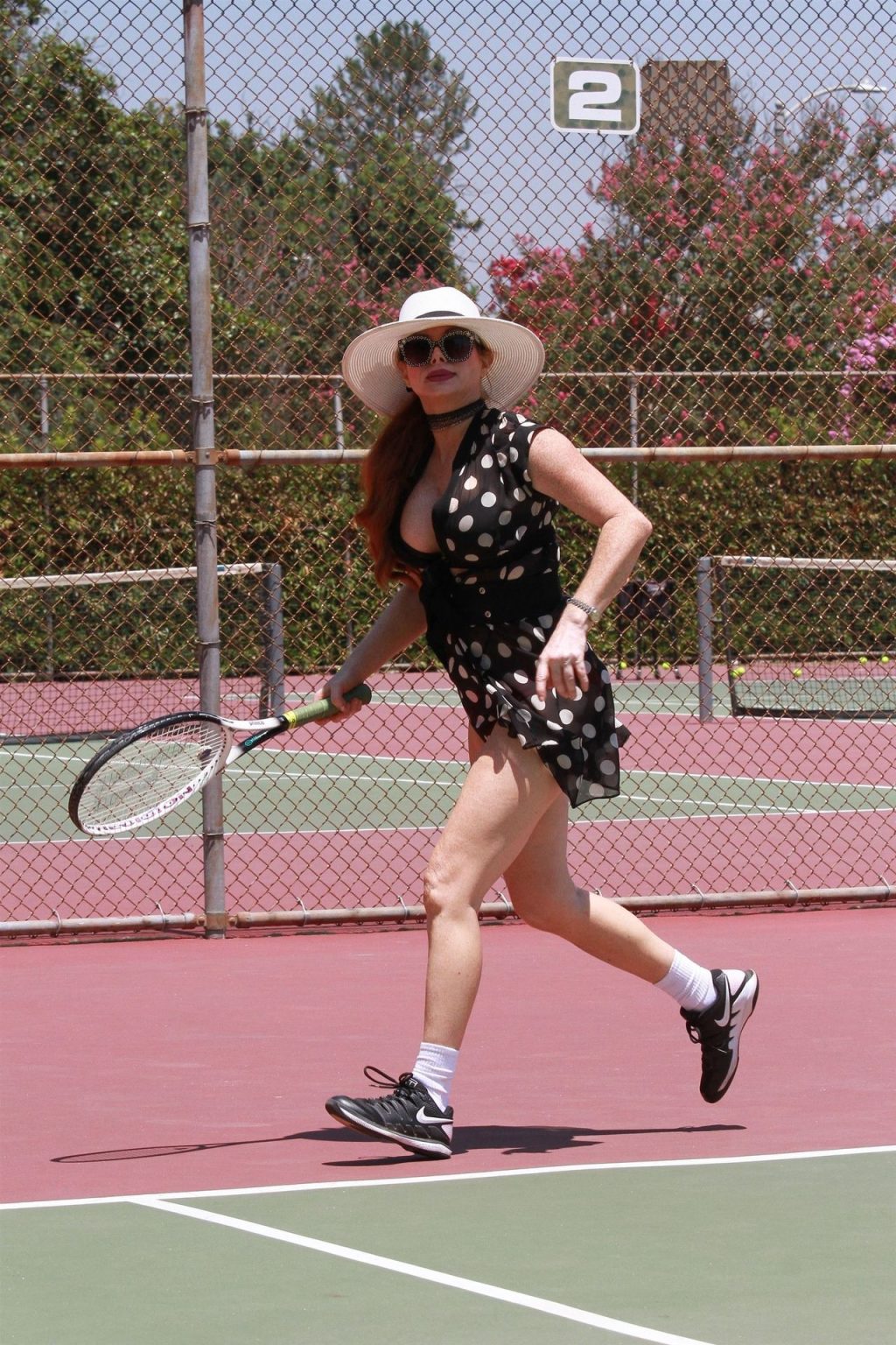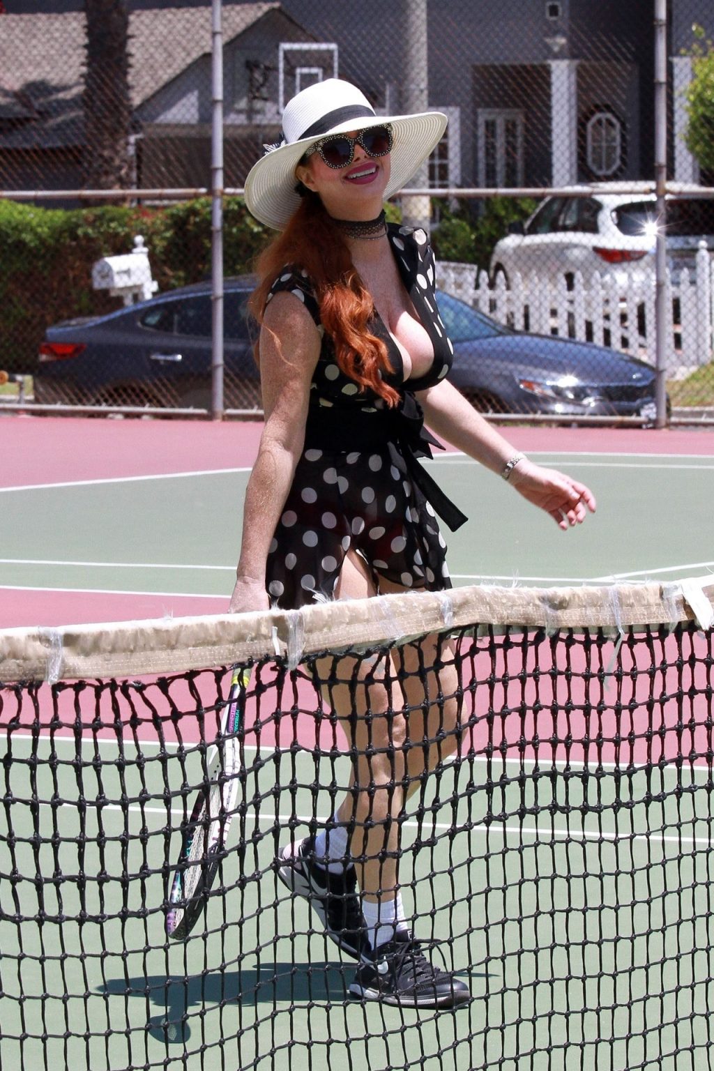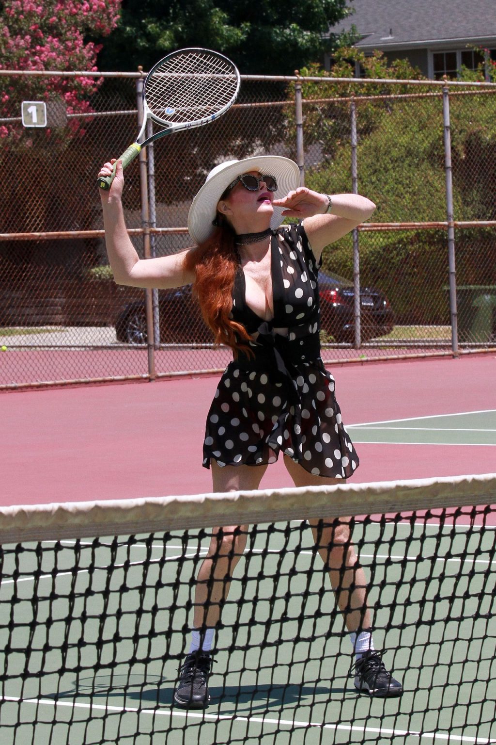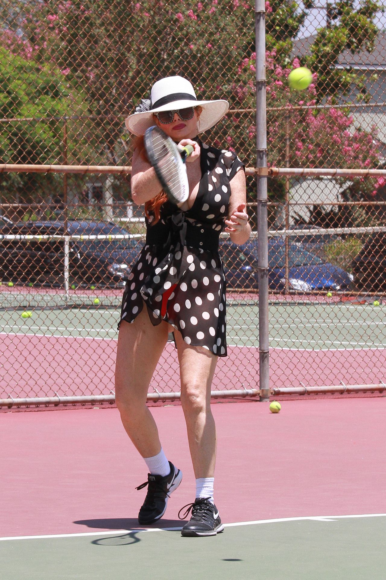 L’attrice sfoggia un nuovo outfit per i campi e un bel décolleté. Si diverte a colpire le palline e si allena.