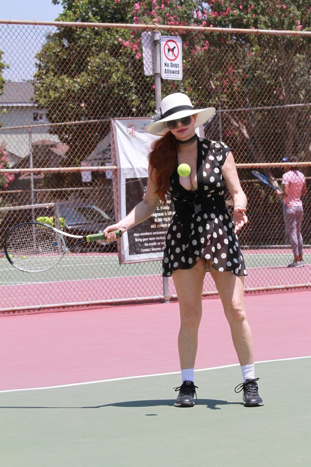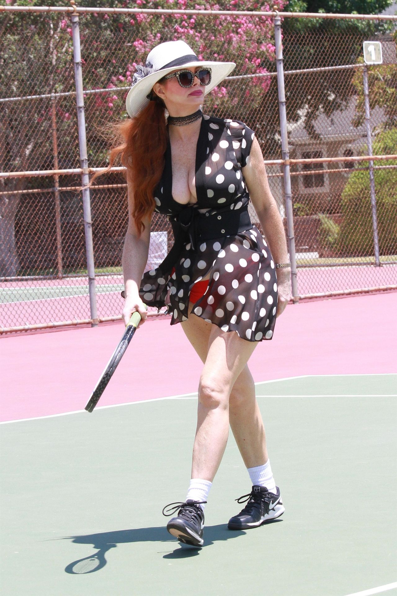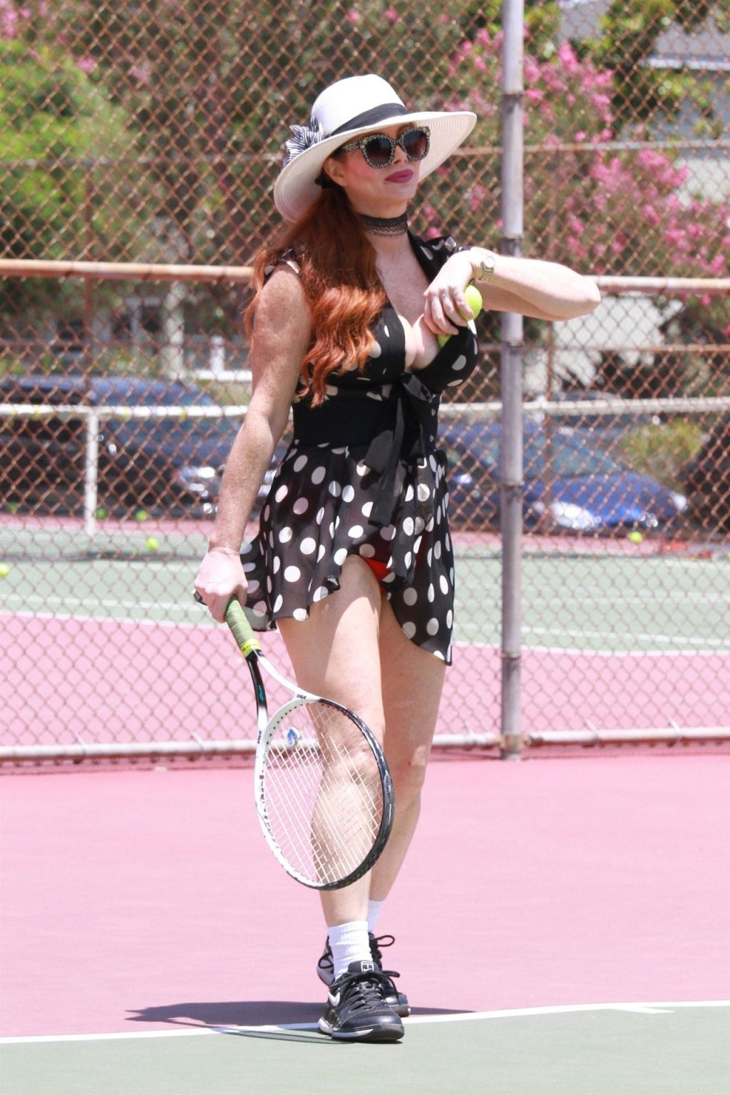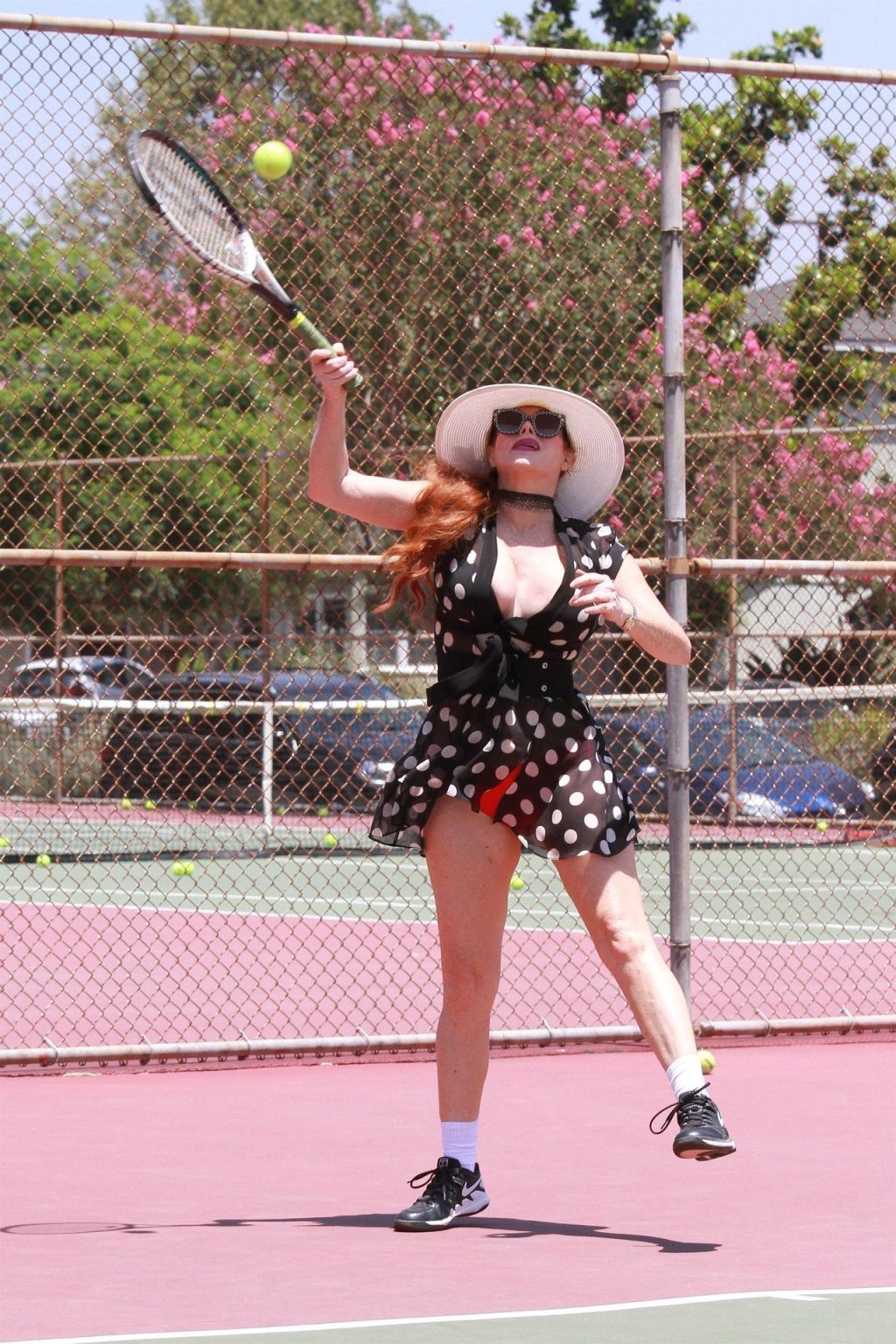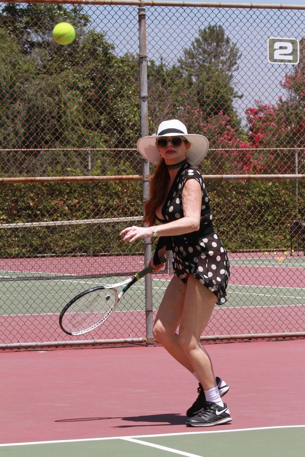 L’attrice sfoggia un nuovo outfit per i campi e un bel décolleté. Si diverte a colpire le palline e si allena.