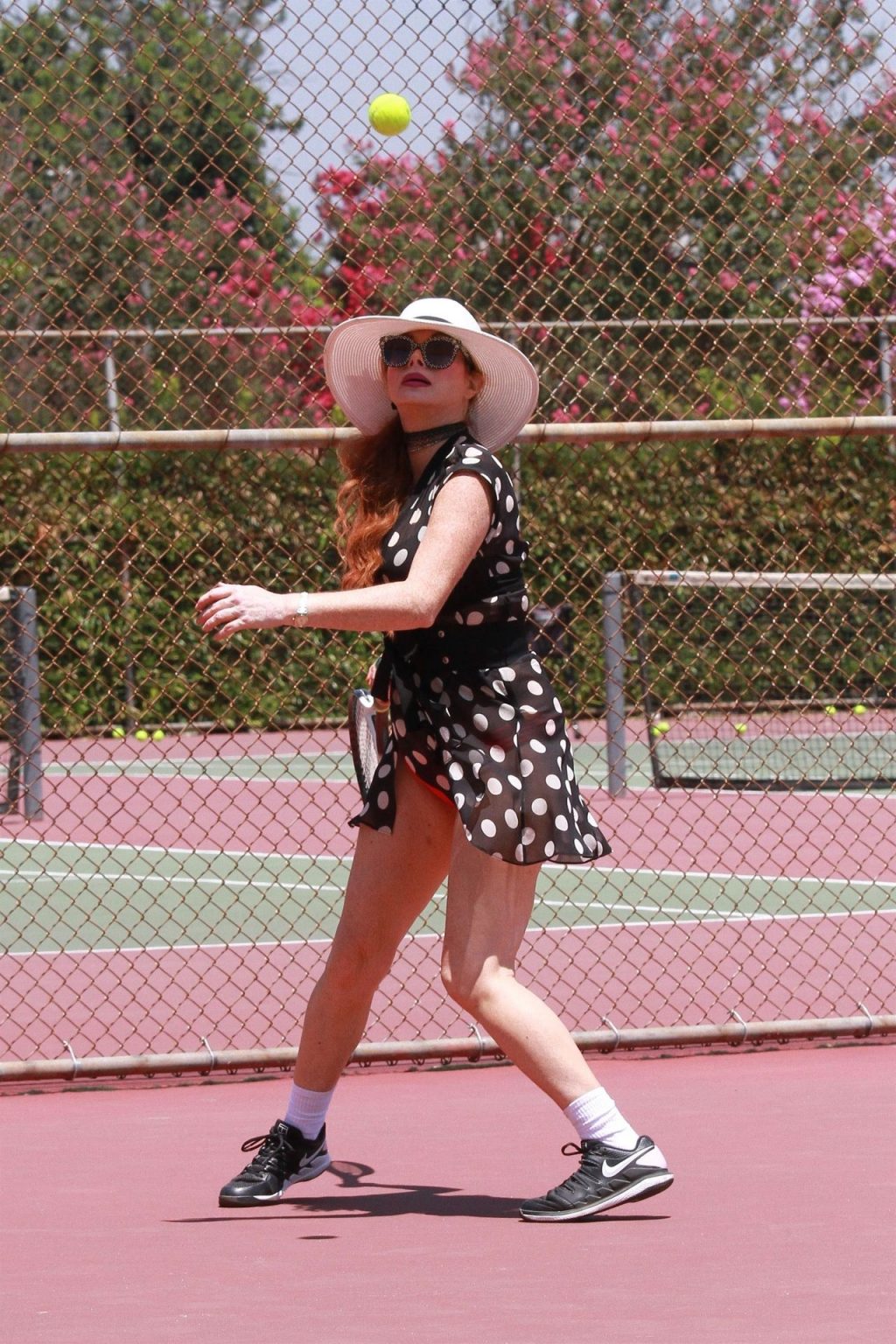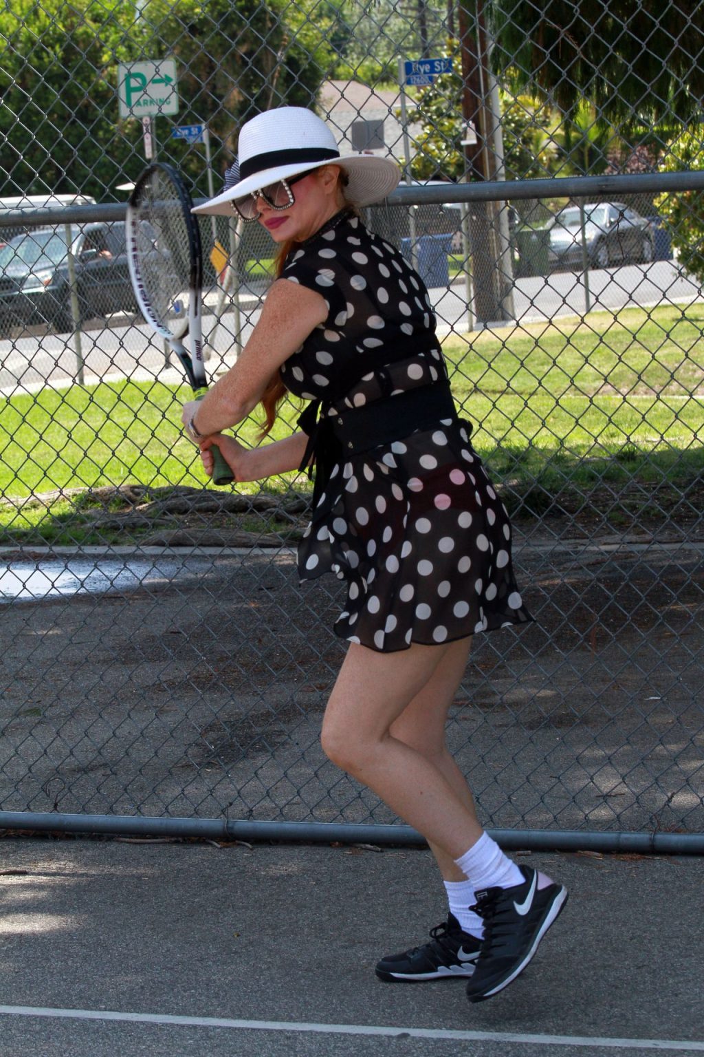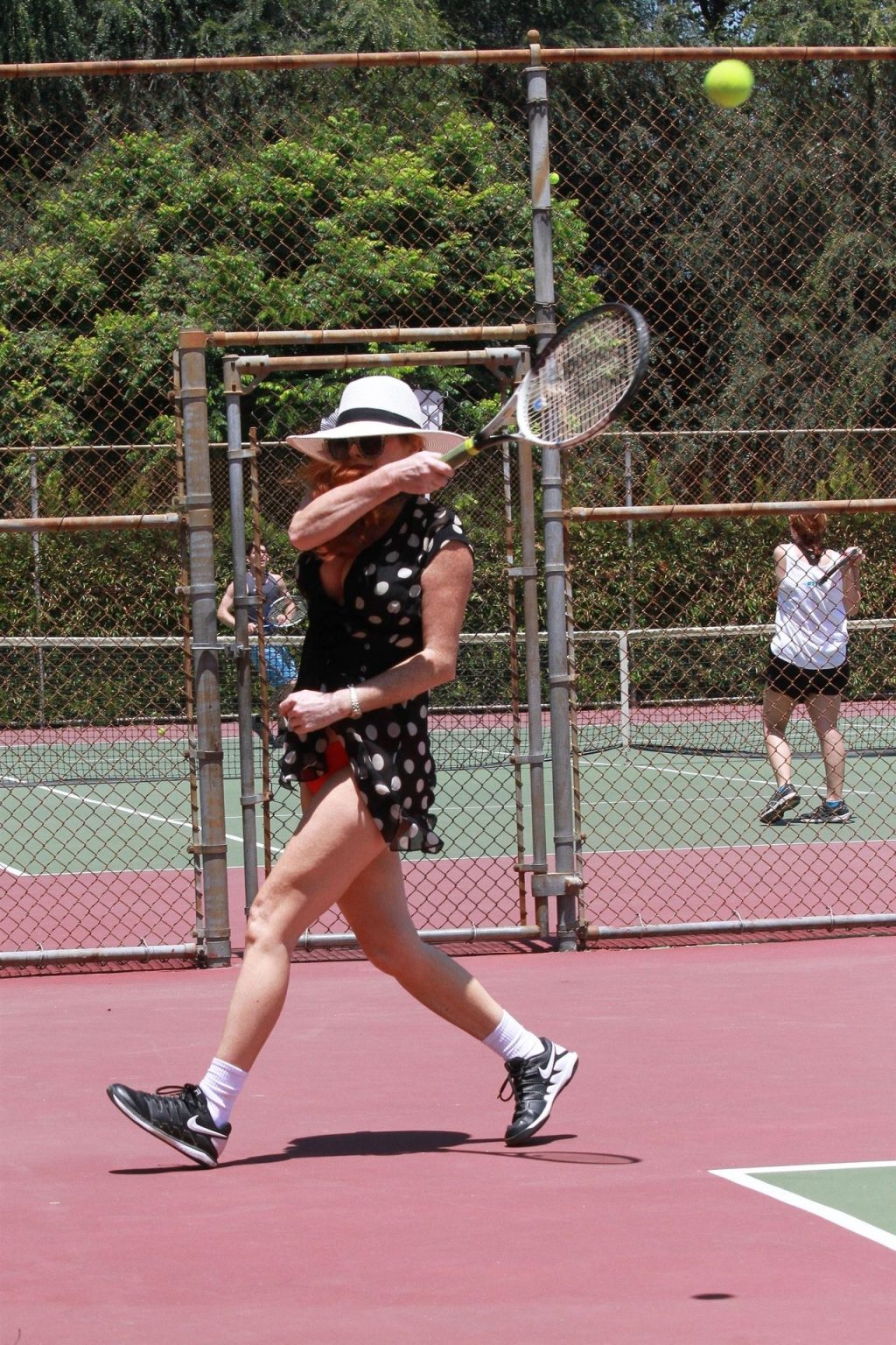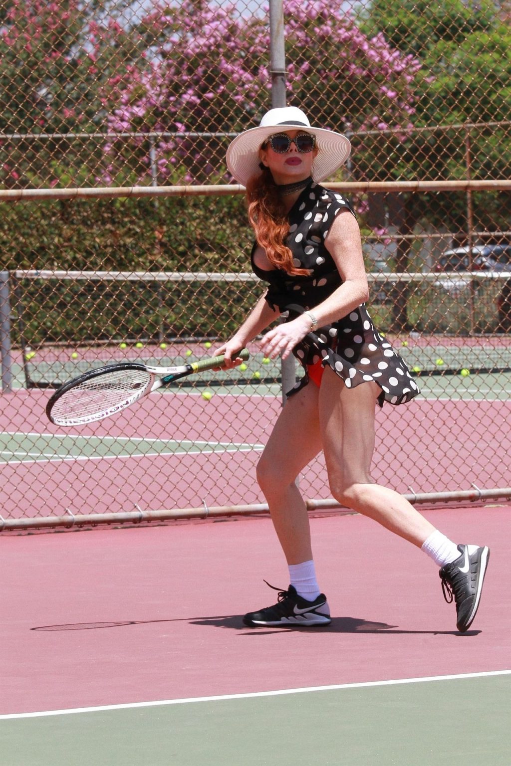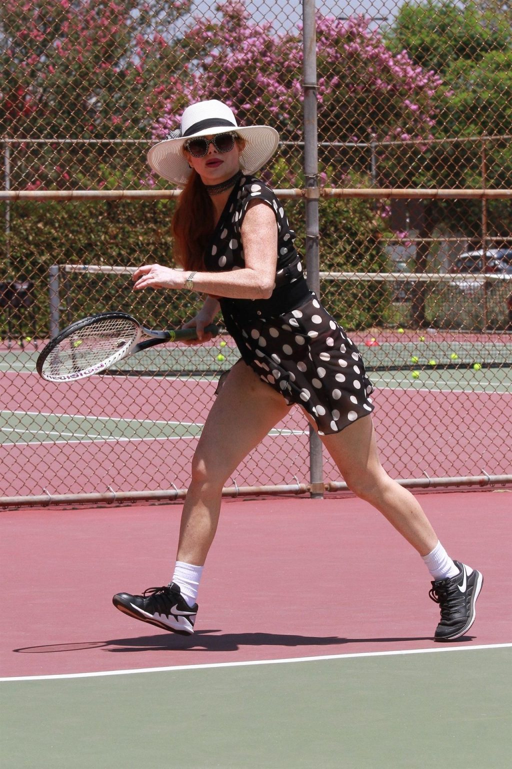 L’attrice sfoggia un nuovo outfit per i campi e un bel décolleté. Si diverte a colpire le palline e si allena.