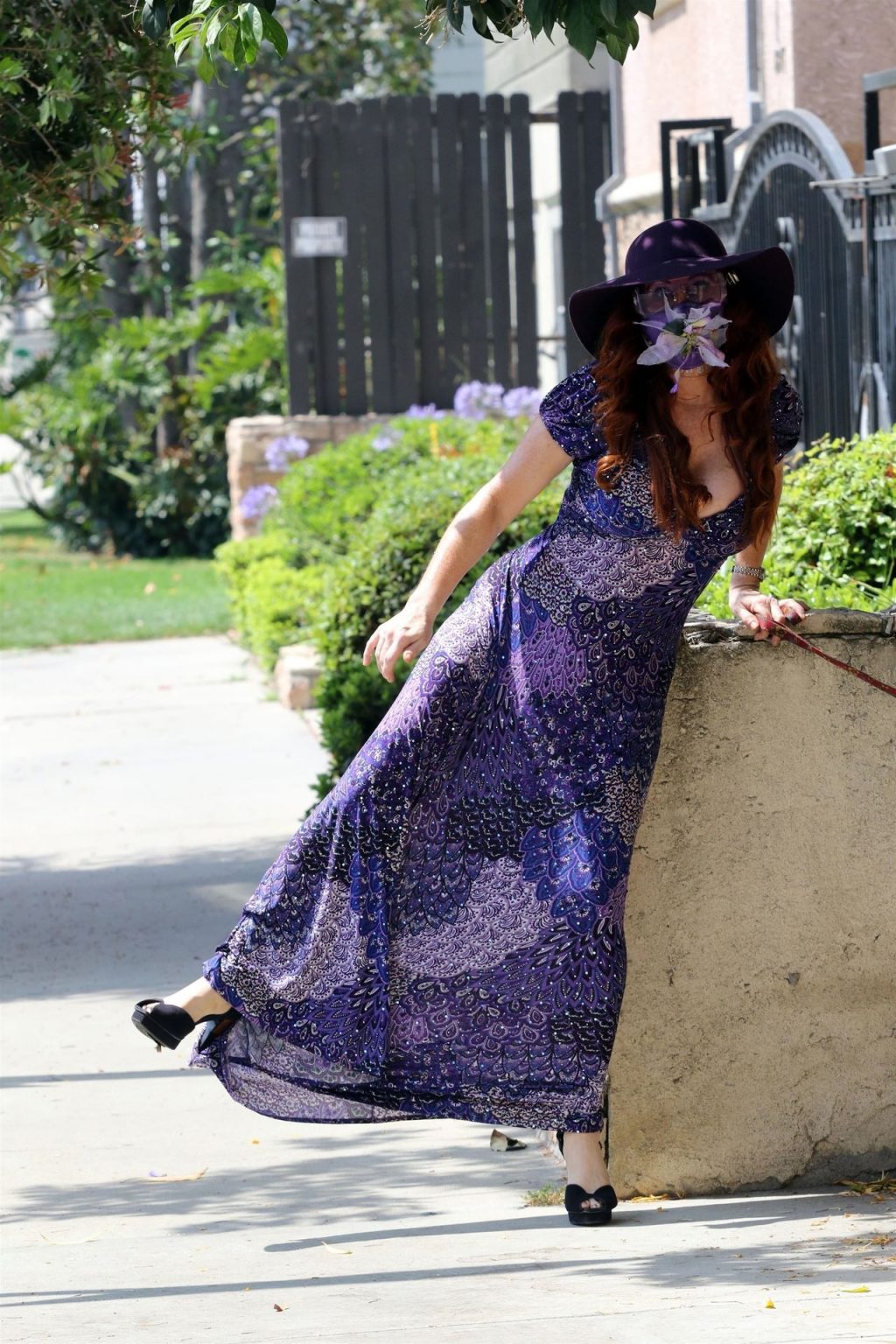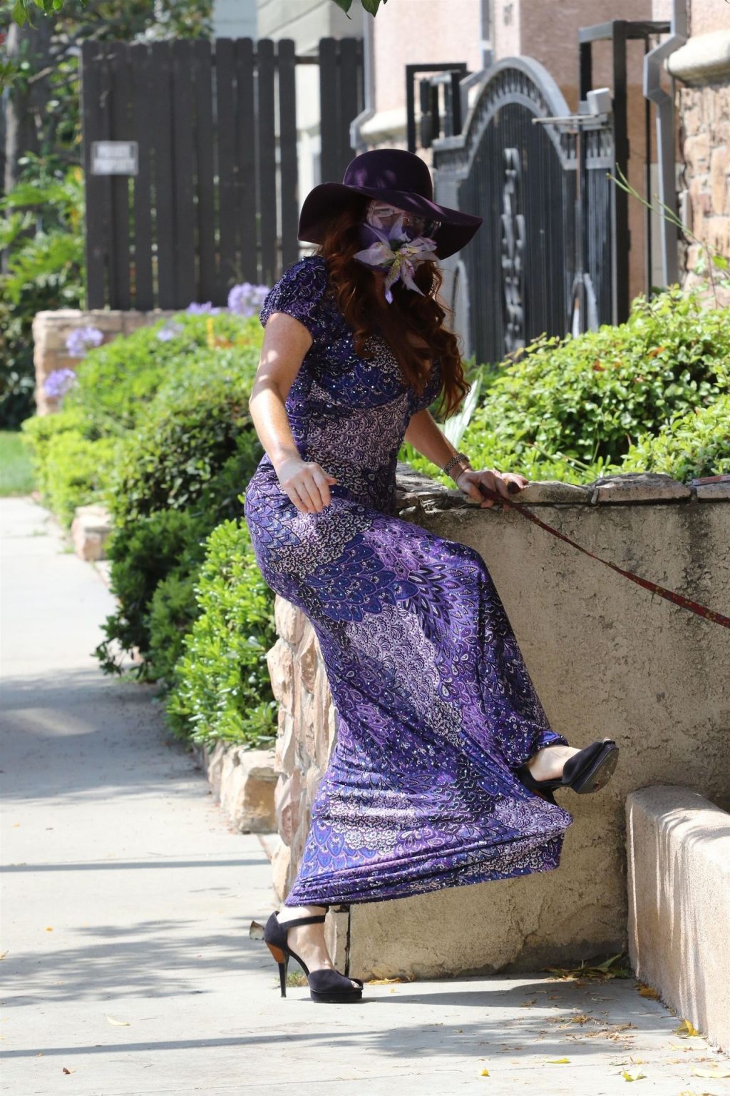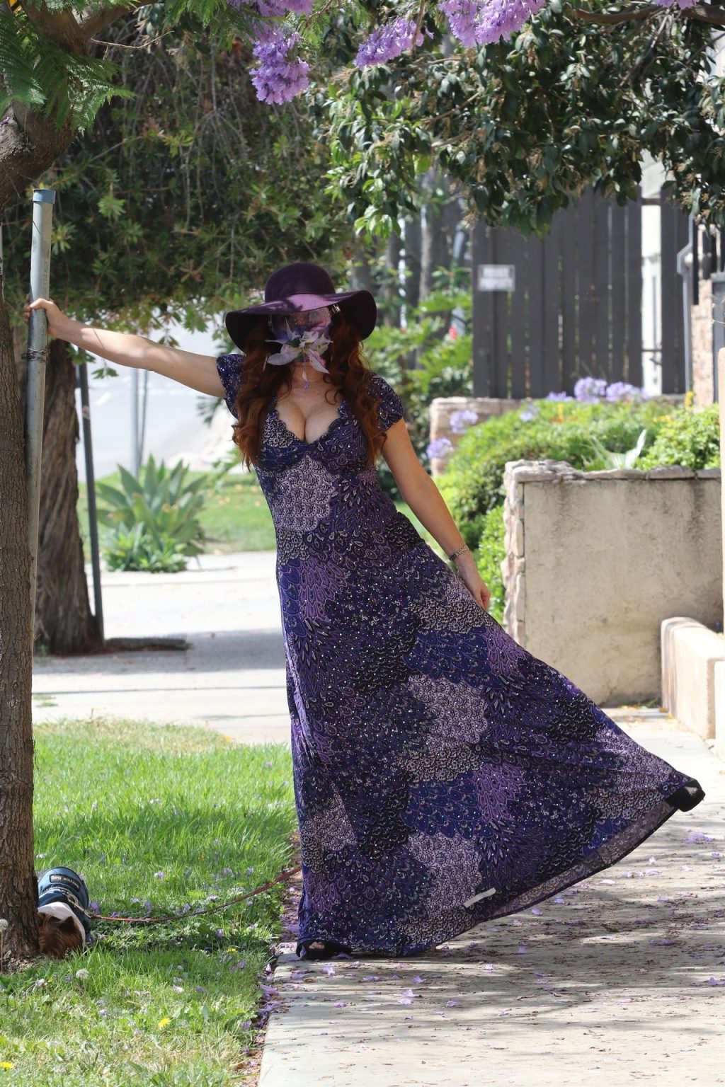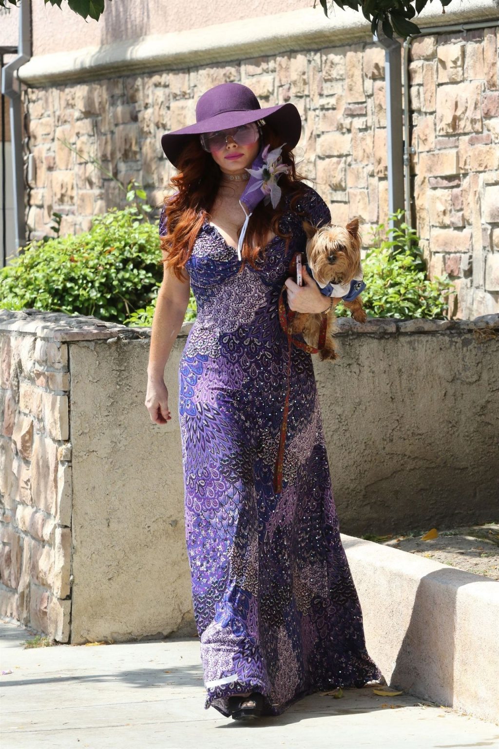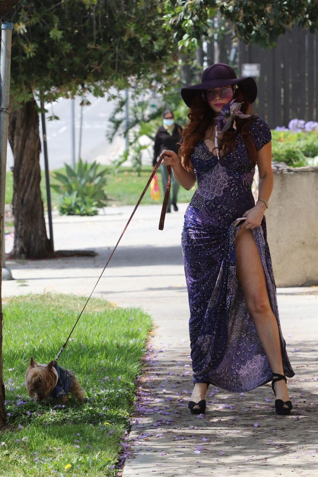 La prosperosa Phoebe Price è stata vista mentre passeggiava con il suo cane indossando un vestito completamente viola e si è stiracchiata prima di dirigersi a Los Angeles, 22/06/2020.