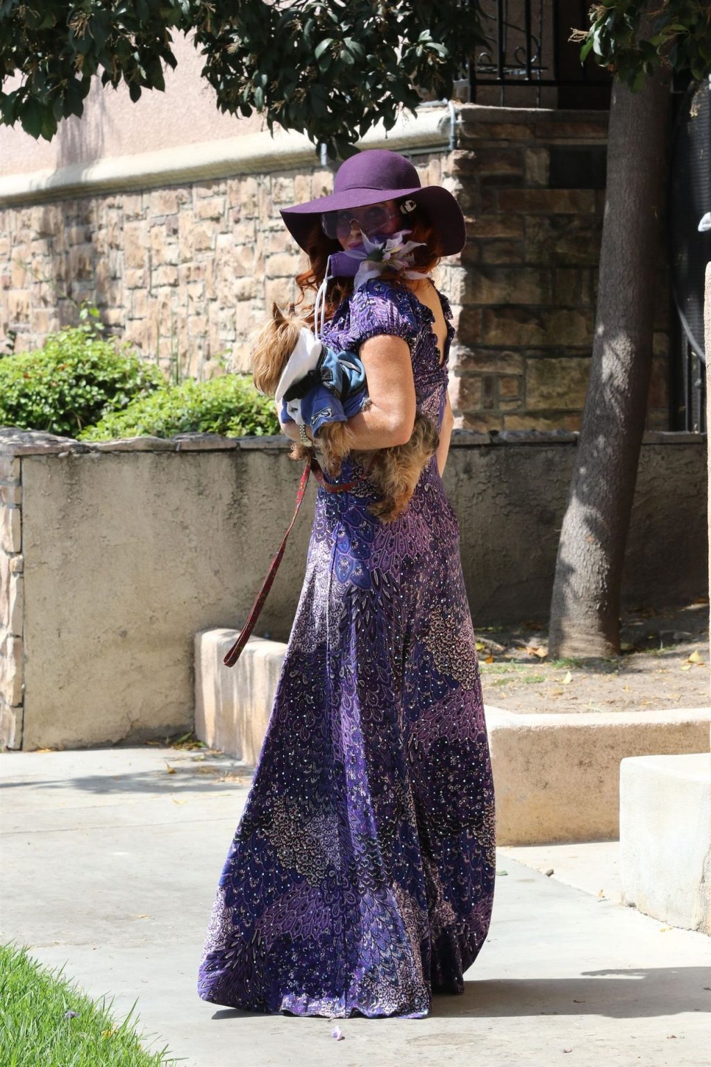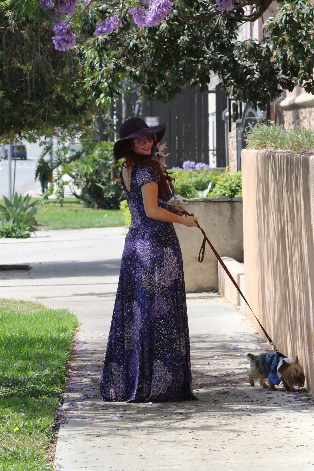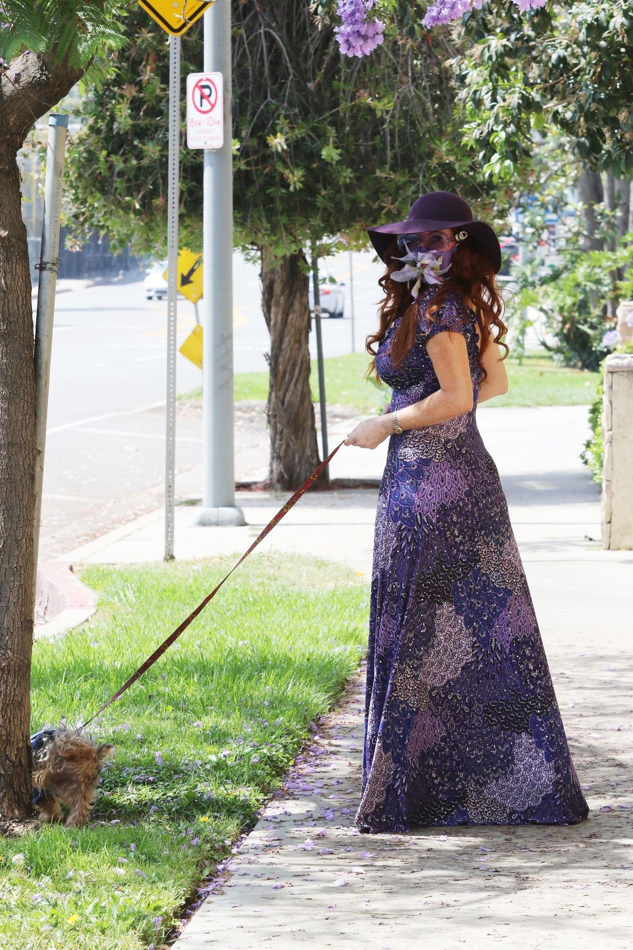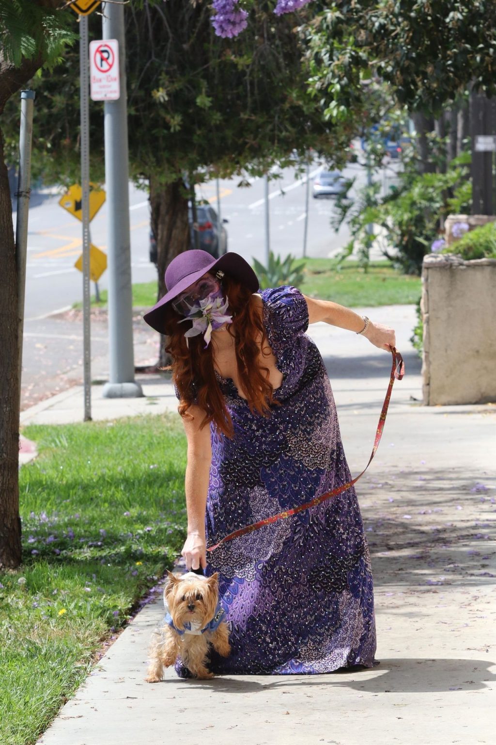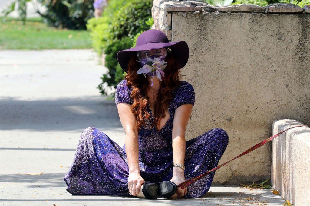 La prosperosa Phoebe Price è stata vista mentre passeggiava con il suo cane indossando un vestito completamente viola e si è stiracchiata prima di dirigersi a Los Angeles, 22/06/2020.