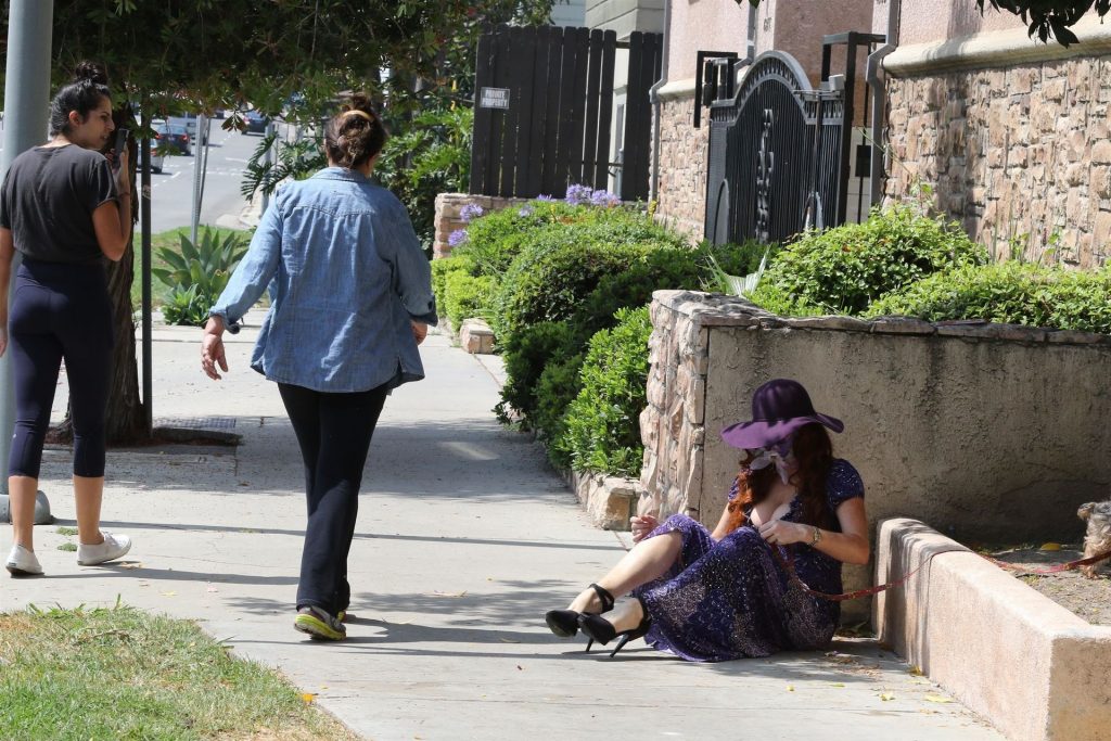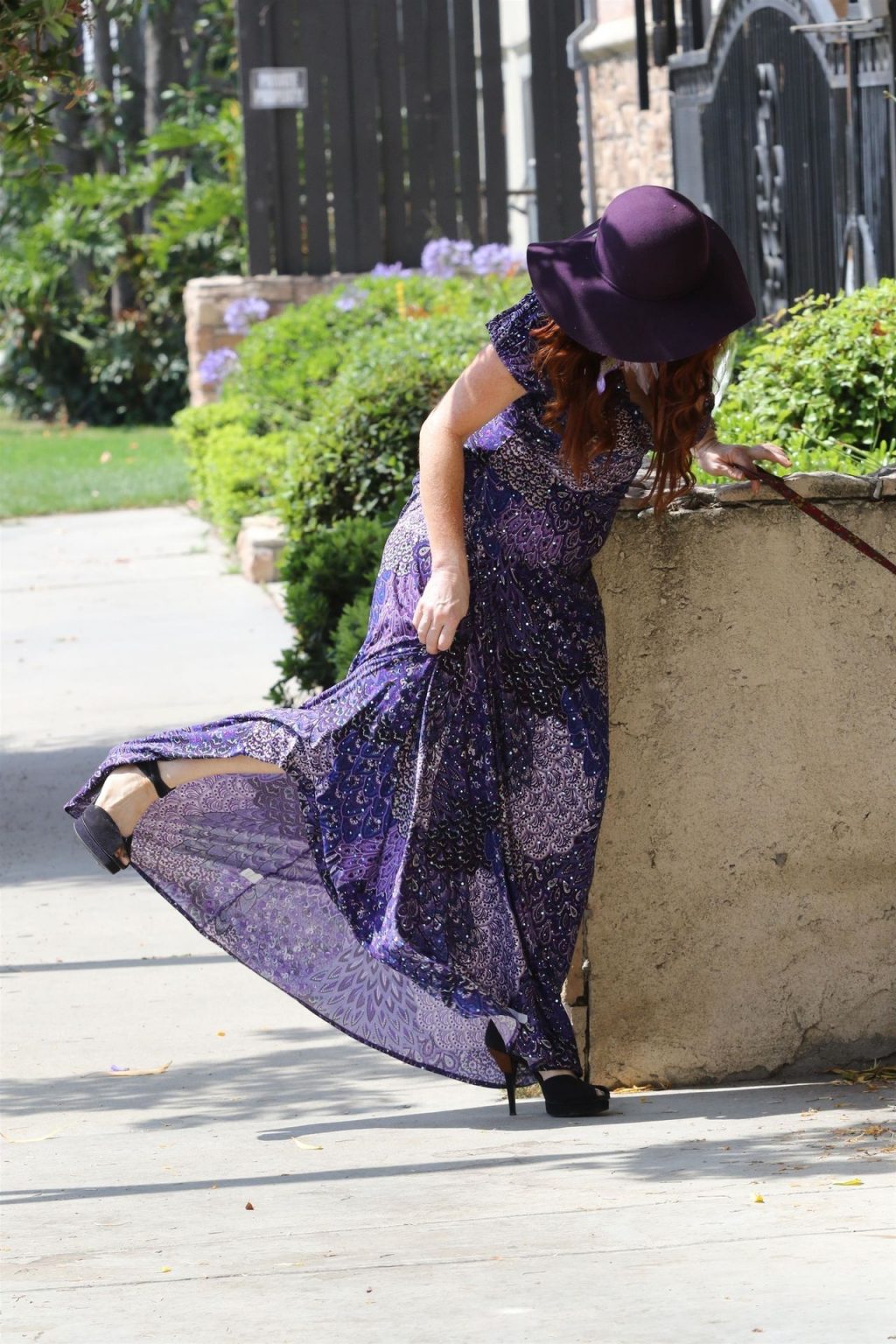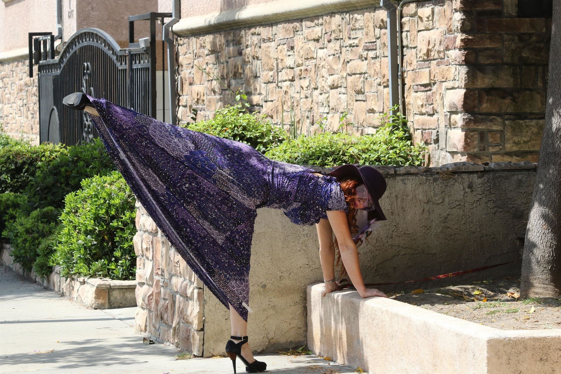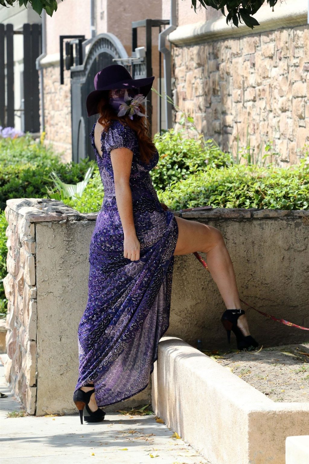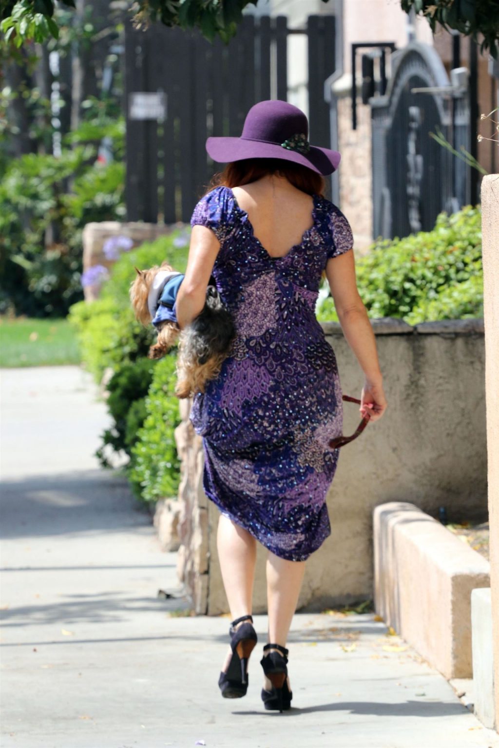 La prosperosa Phoebe Price è stata vista mentre passeggiava con il suo cane indossando un vestito completamente viola e si è stiracchiata prima di dirigersi a Los Angeles, 22/06/2020.