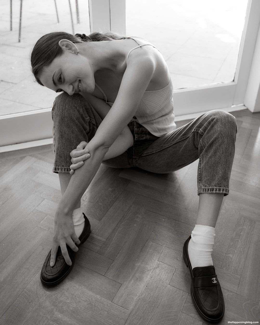L’attrice Phoebe Tonkin posa senza reggiseno in un servizio fotografico in bianco e nero sui social media, mostrando le sue tettine (luglio 2021).