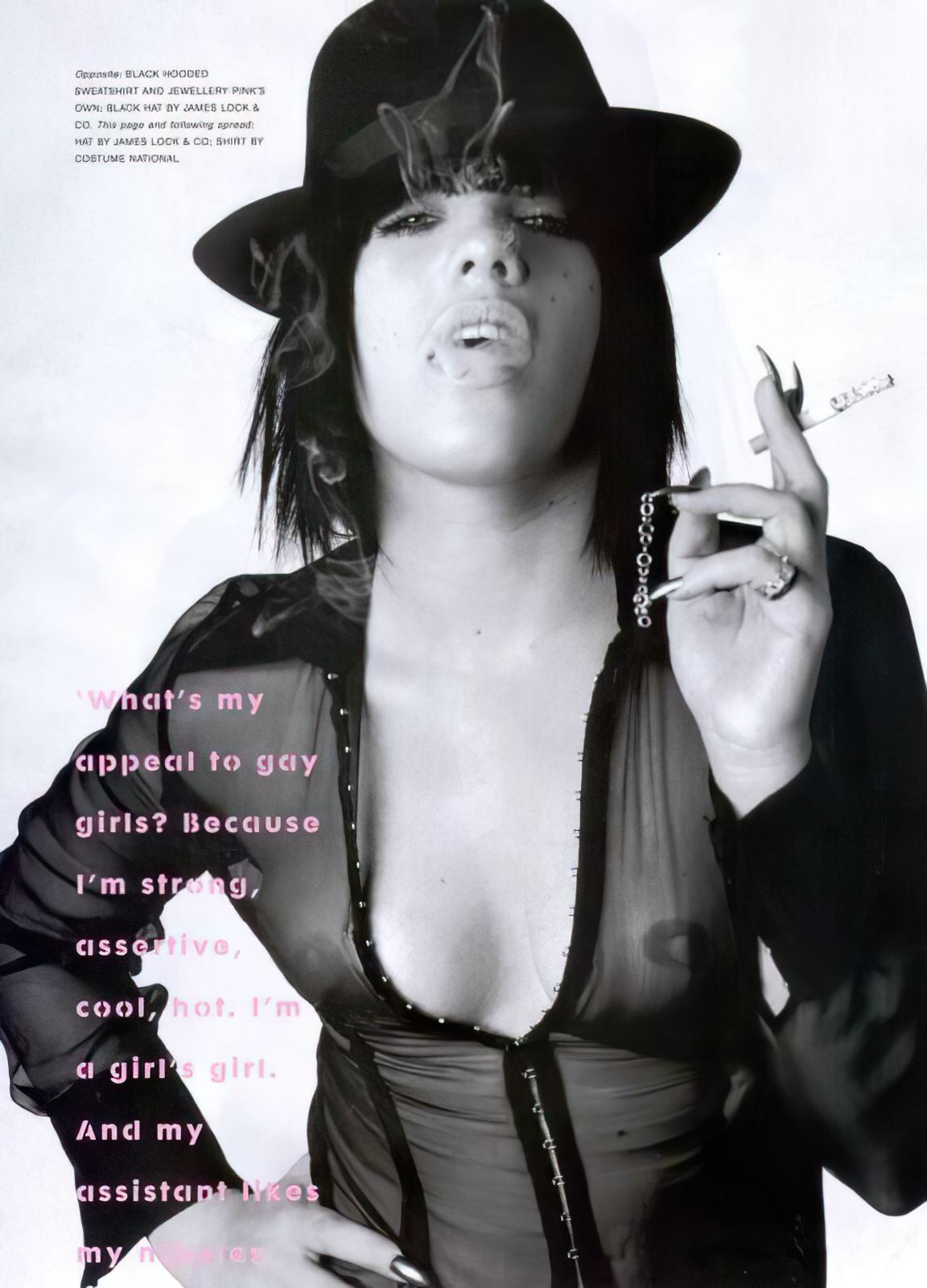La cantante americana Alecia Beth Moore (nota come Pink) è stata fotografata con una camicetta trasparente, mentre fuma e mostra i suoi piccoli seni per la rivista “The Face” (2006).