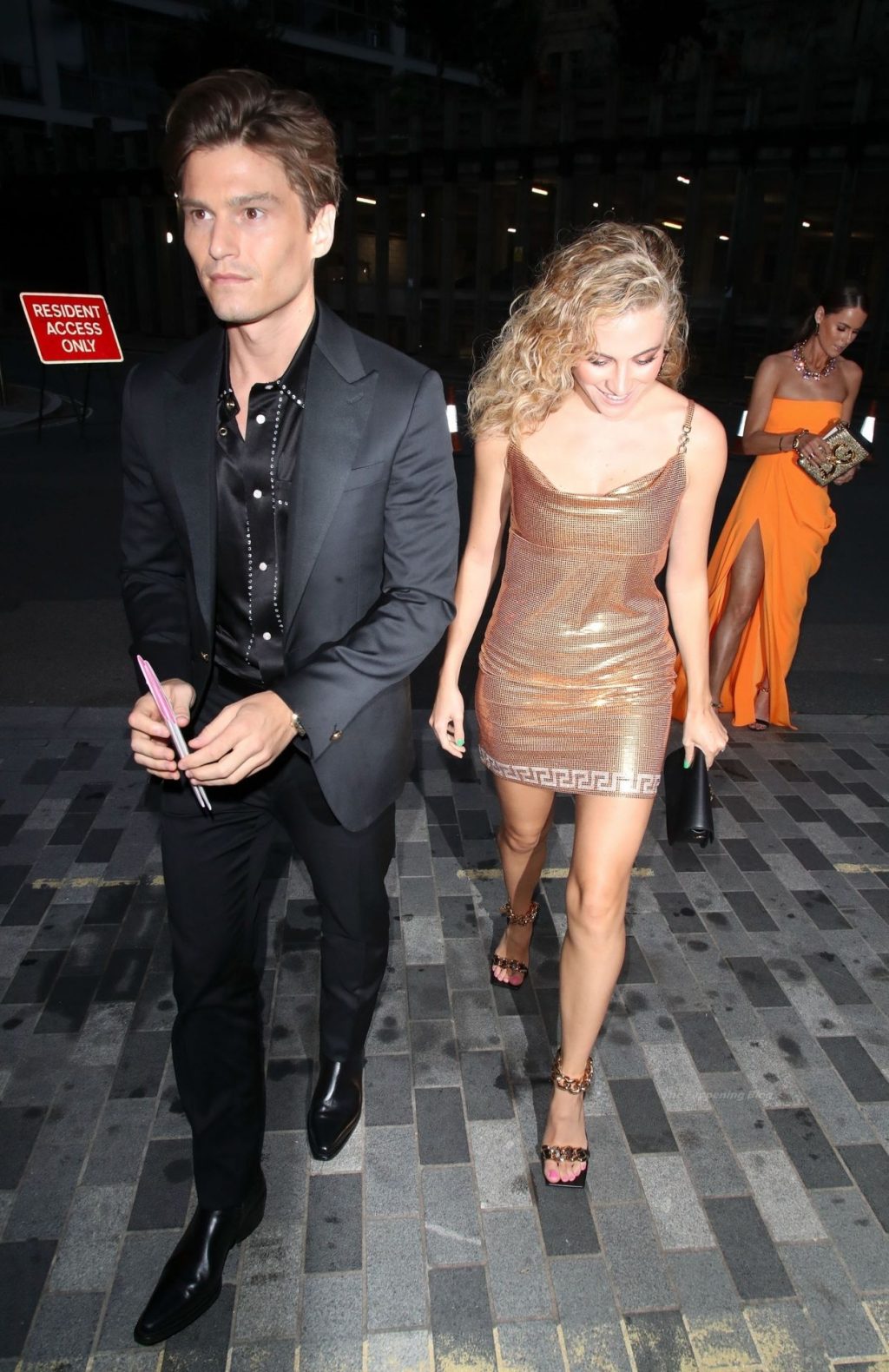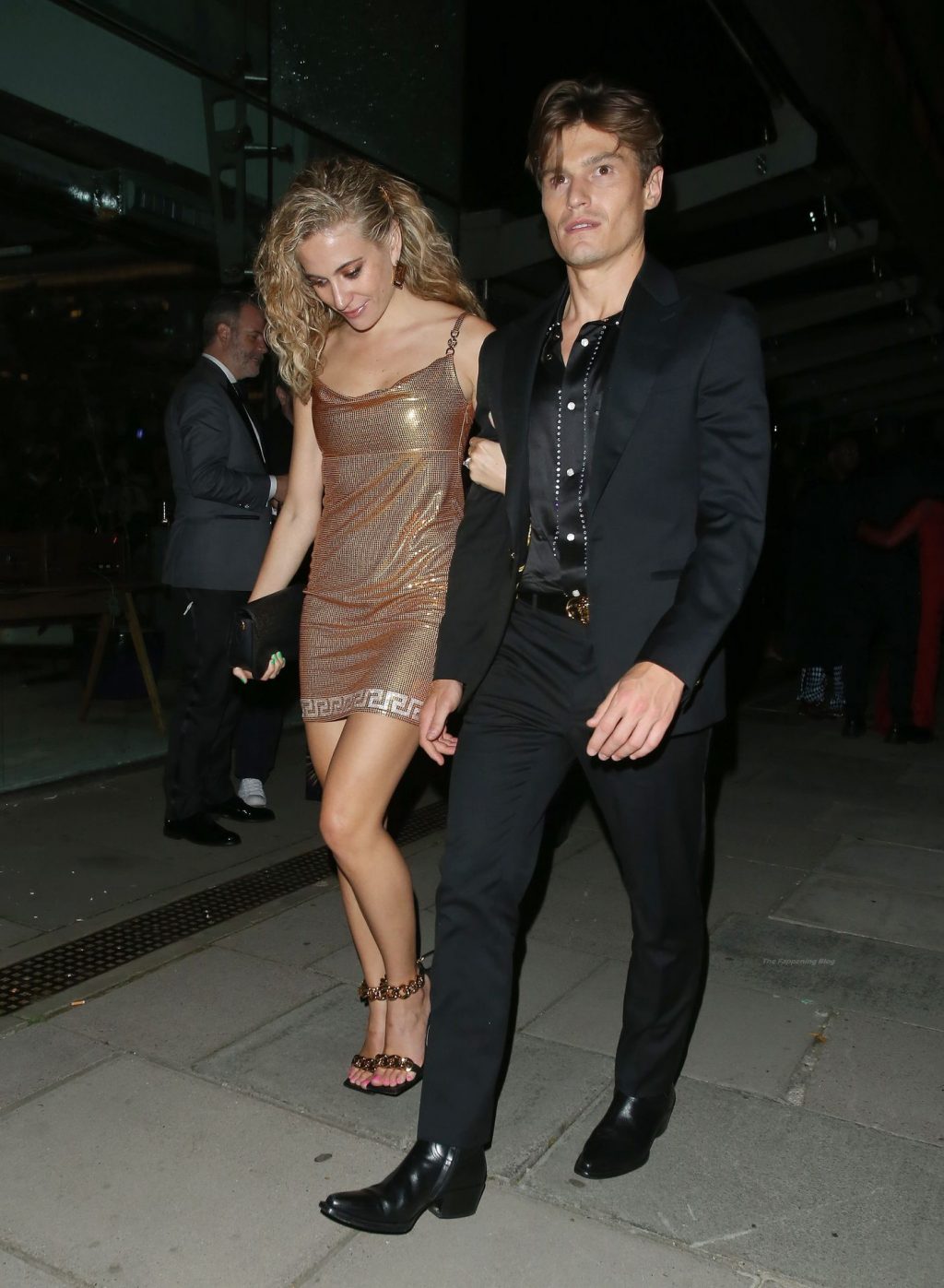 Stupisce con un abito dorato che sfiora la coscia e condivide un bacio con il suo affascinante fidanzato modello Oliver Cheshire sul red carpet. Pixie appare provata nel taxi con il suo partner dopo l’evento.