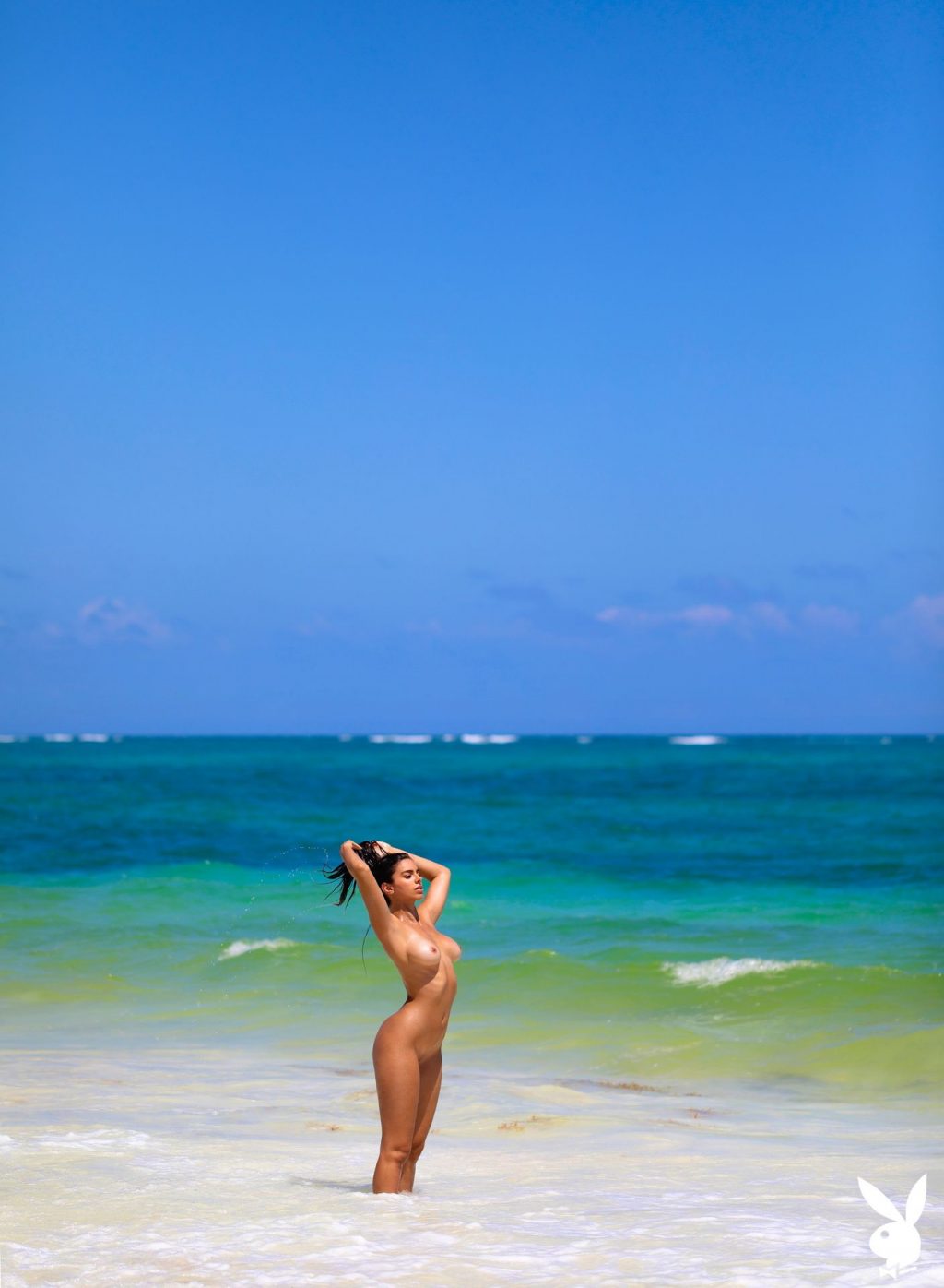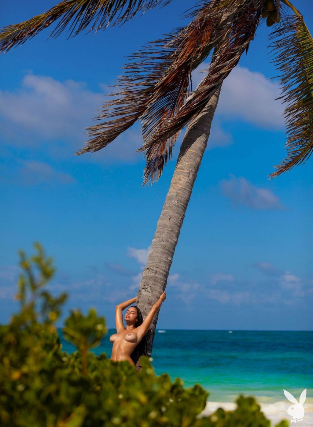 Priscilla Huggins Ortiz mostra il suo corpo nudo e sexy sulla spiaggia di Tulum, Messico, in un servizio fotografico di Ana Dias per Playboy (2020).