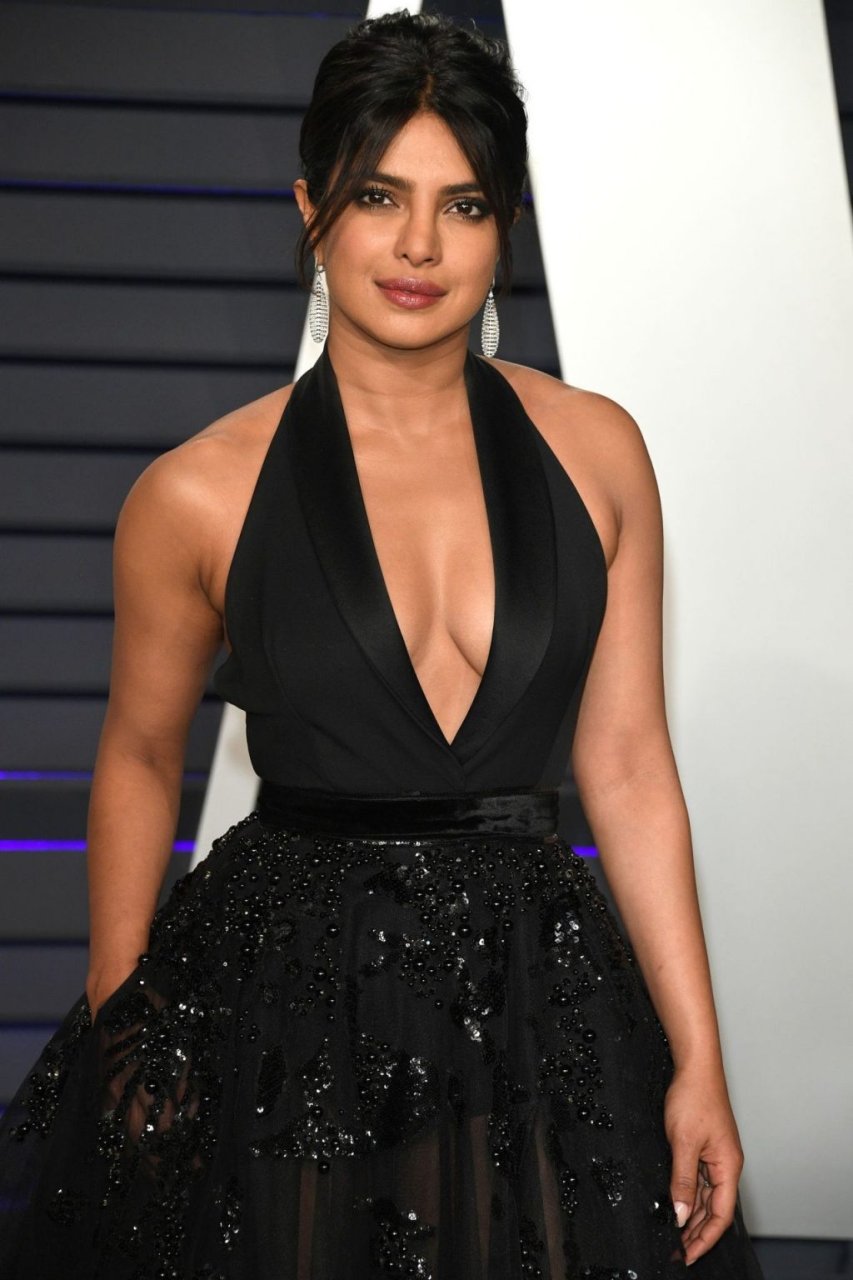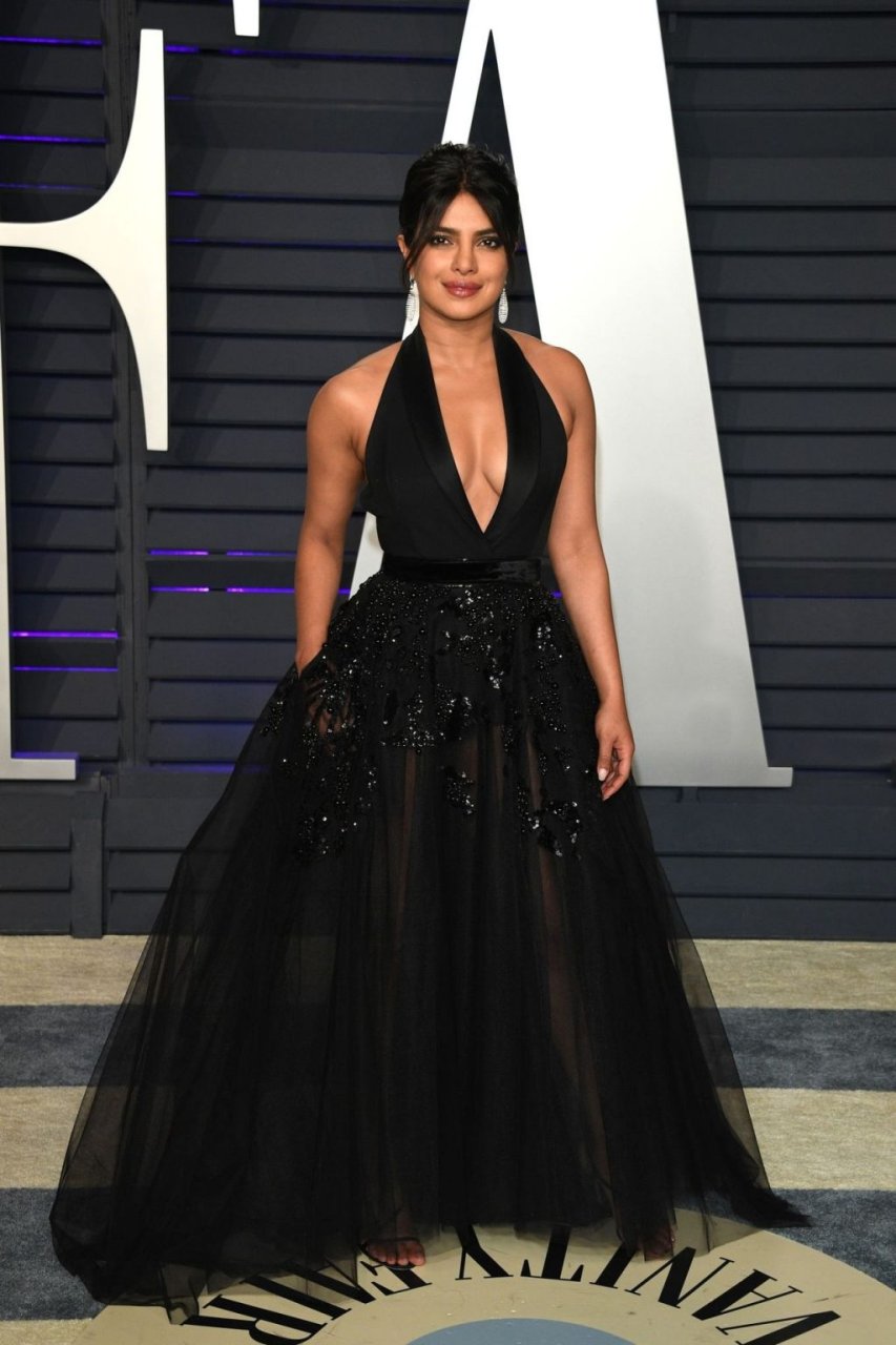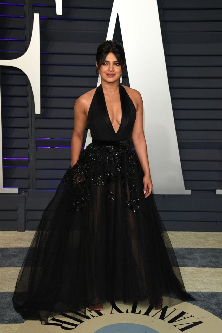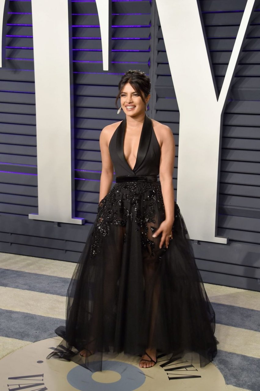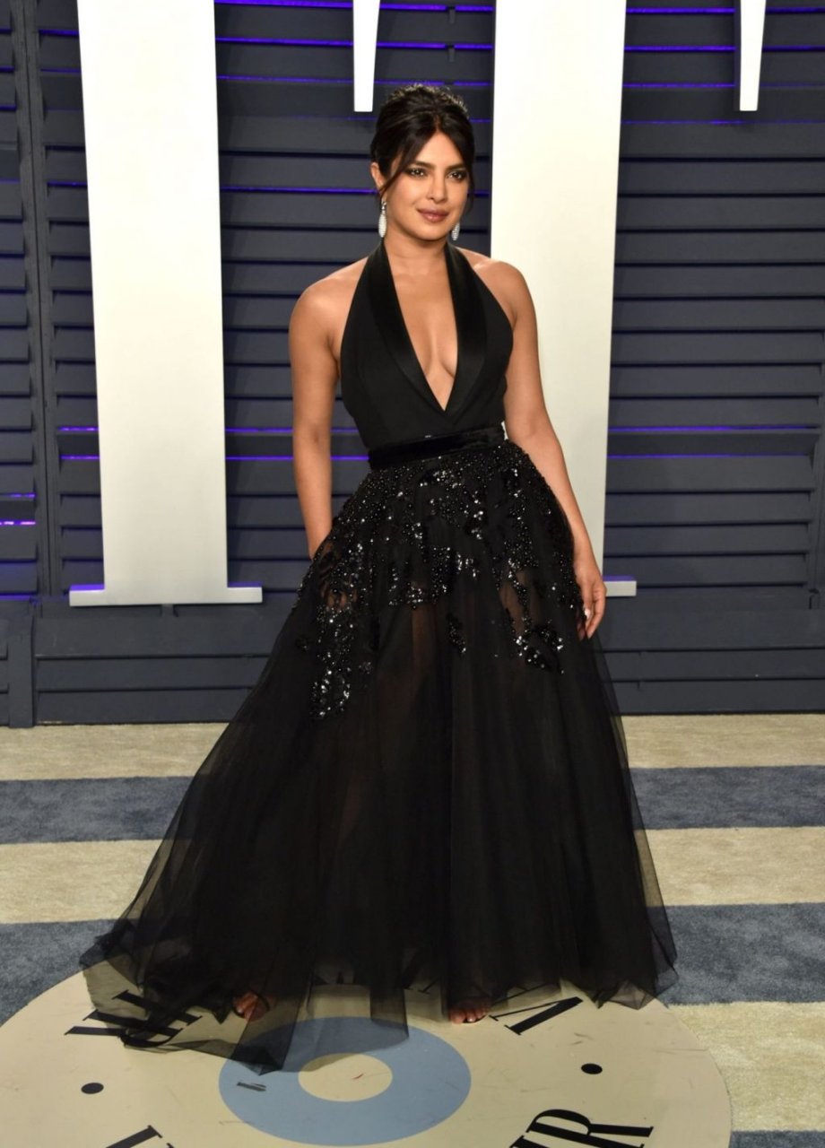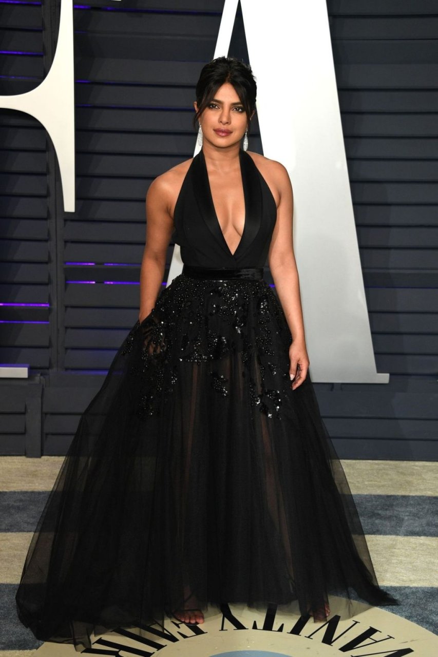 Attrice Priyanka Chopra mostra il suo décolleté indossando un vestito nero alla Vanity Fair Oscar Party 2019 a Beverly Hills, 24/02/2019.