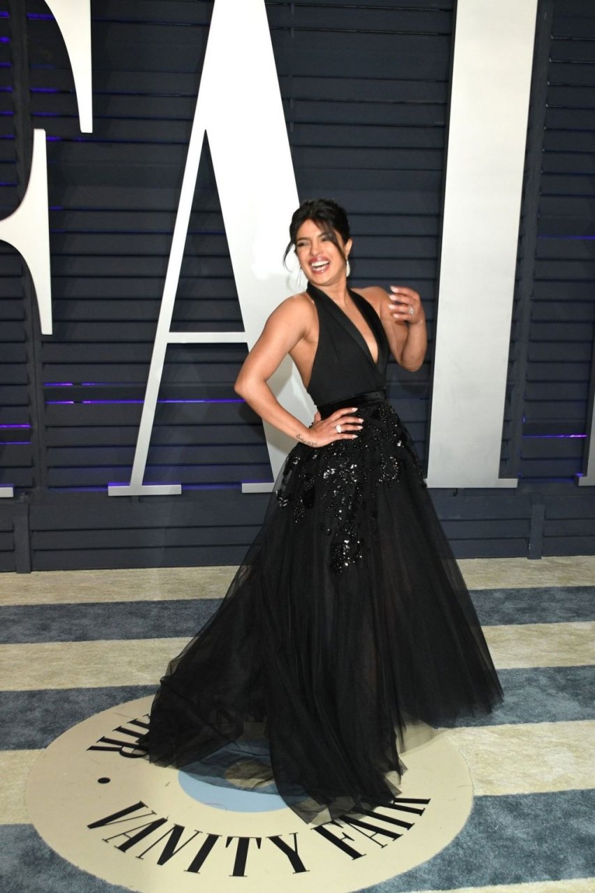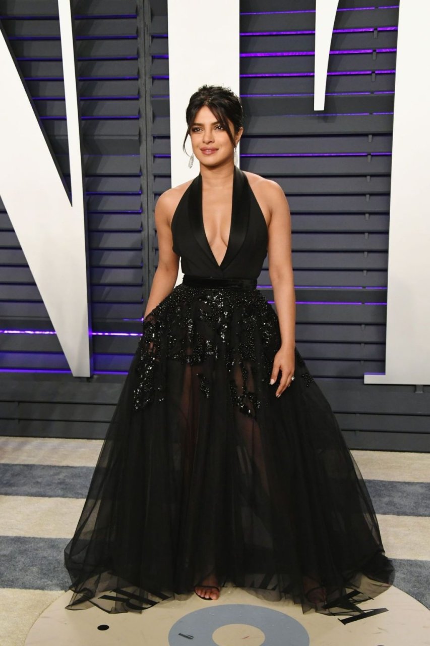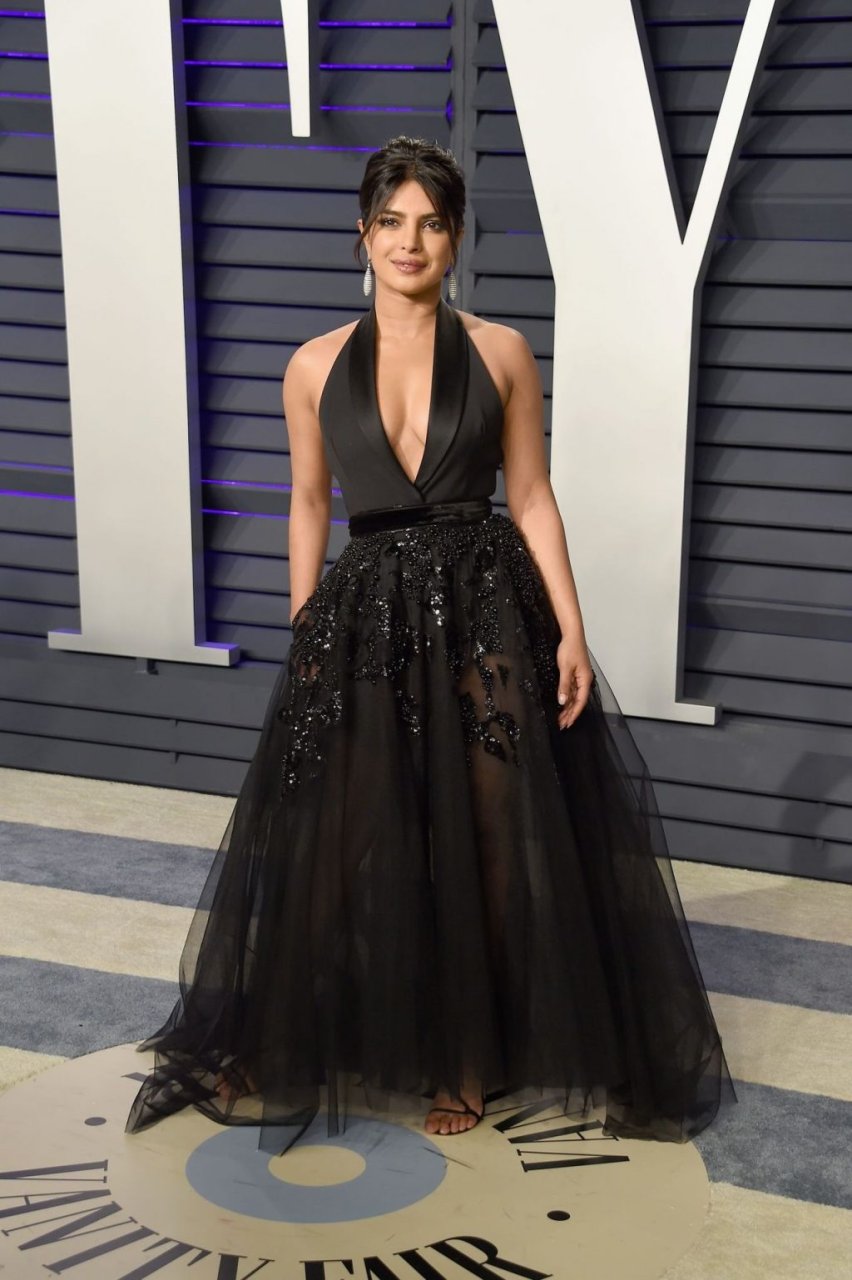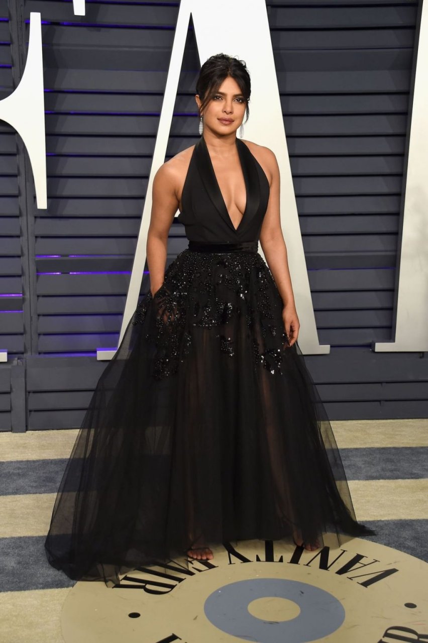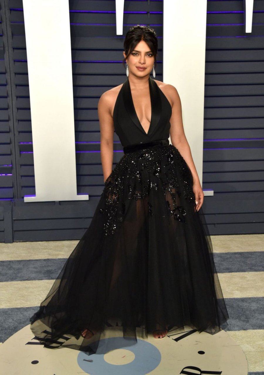 Attrice Priyanka Chopra mostra il suo décolleté indossando un vestito nero alla Vanity Fair Oscar Party 2019 a Beverly Hills, 24/02/2019.