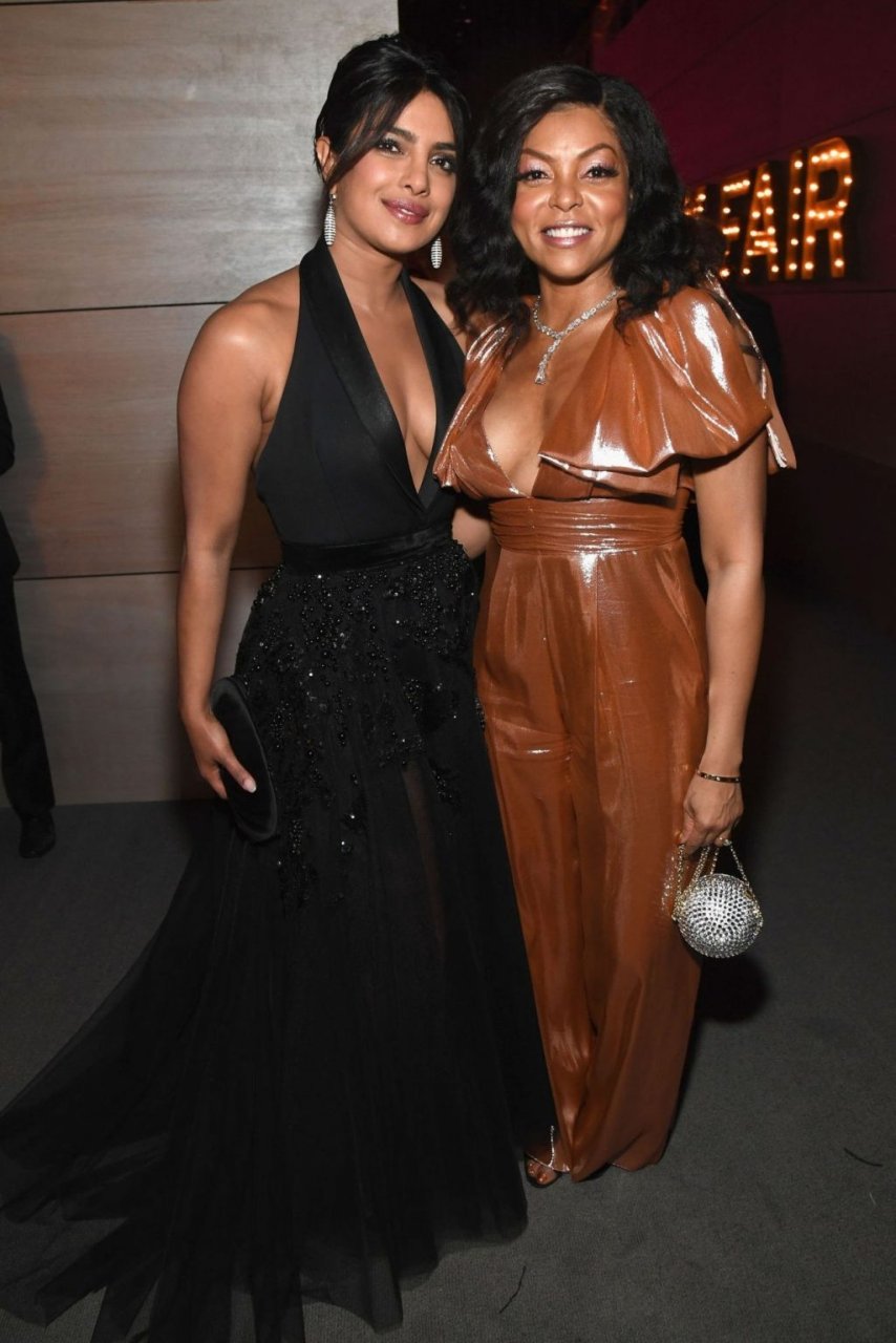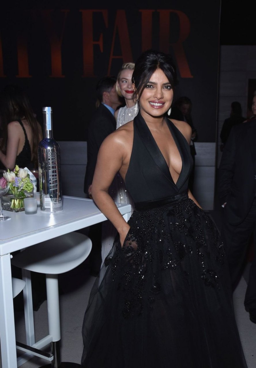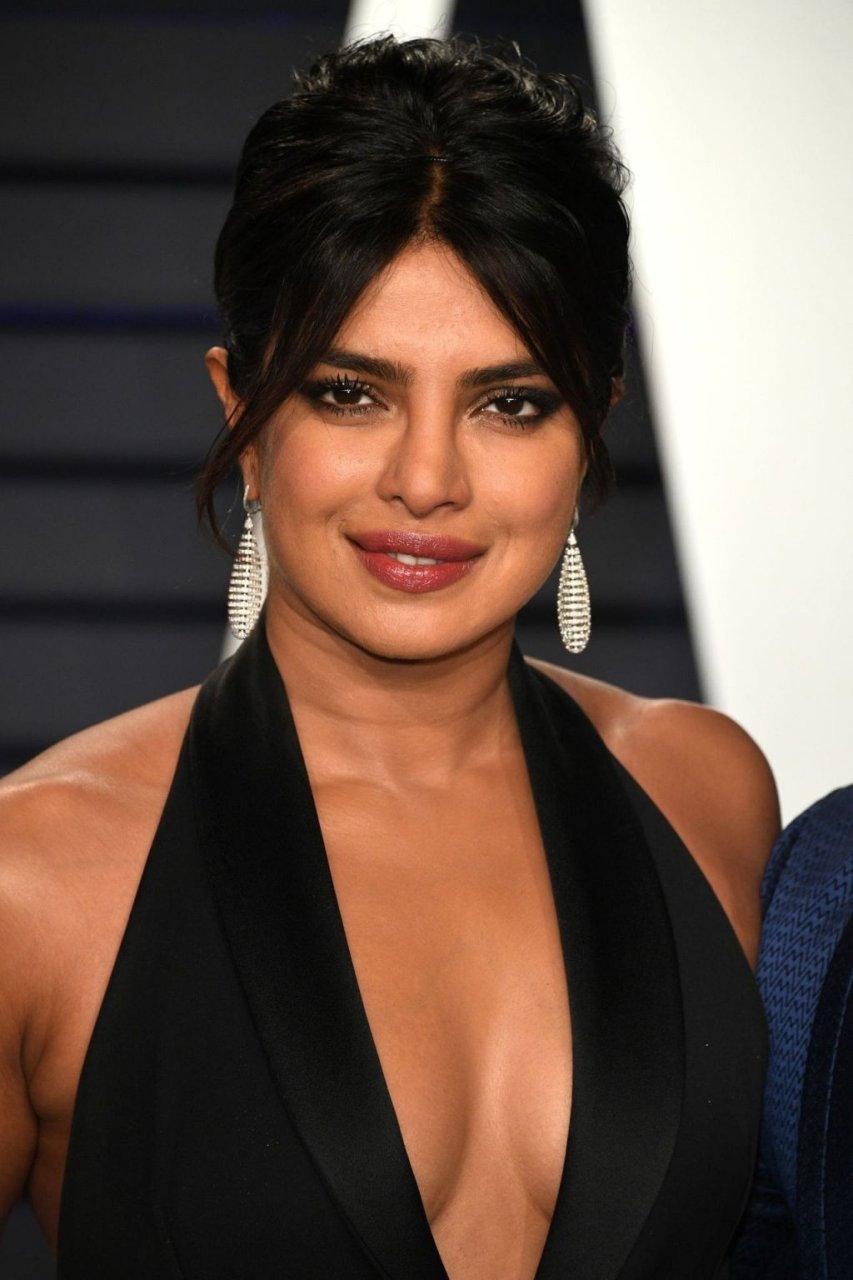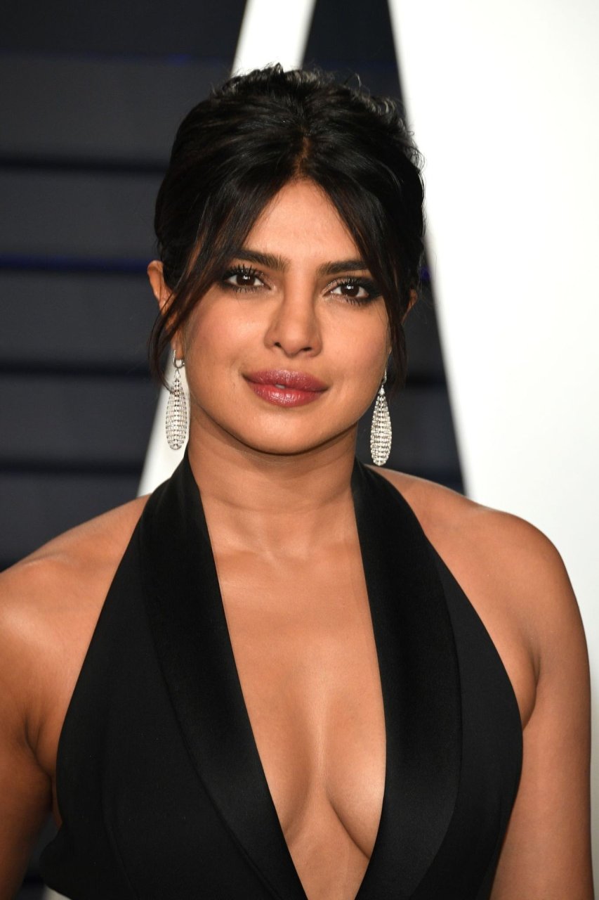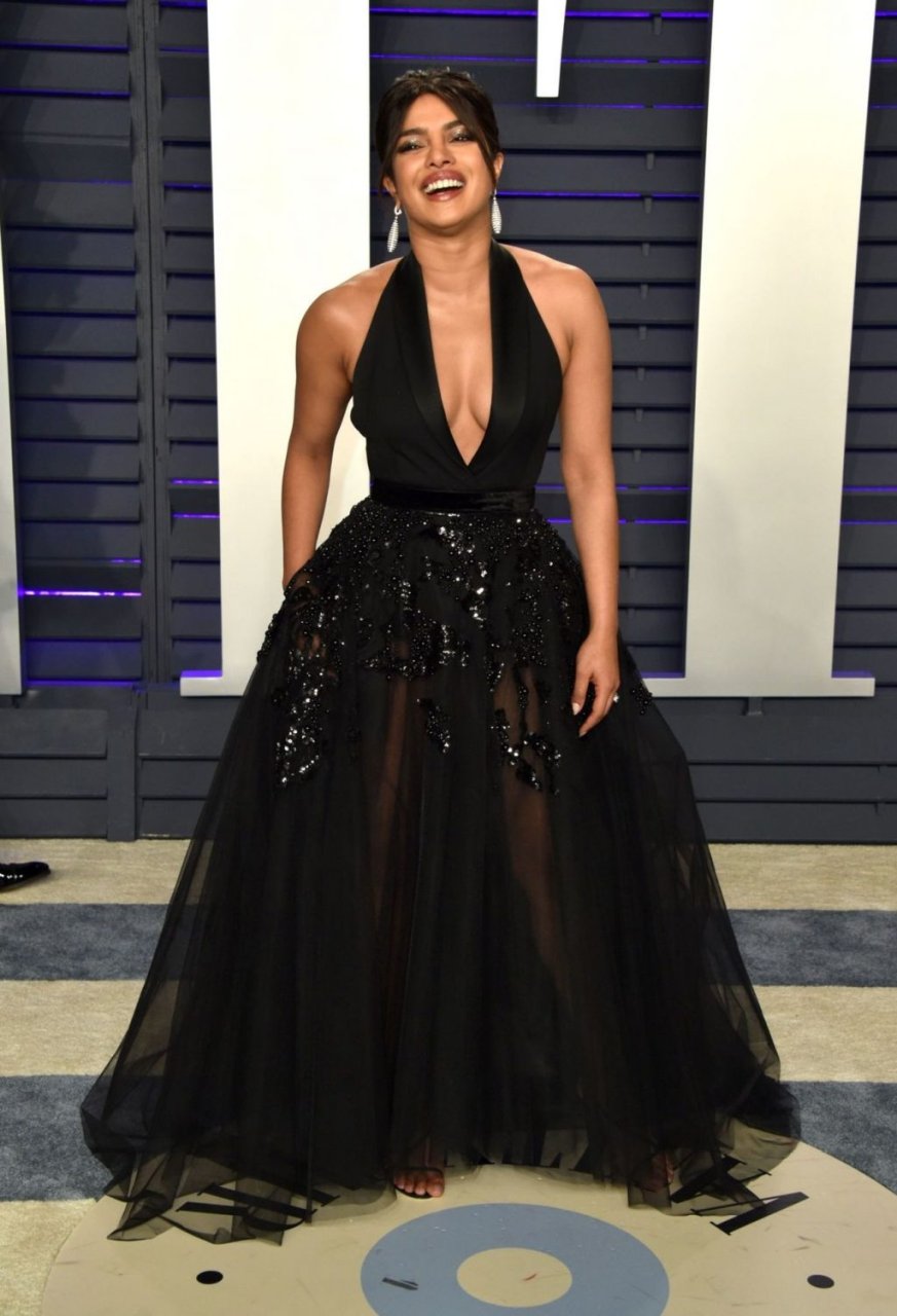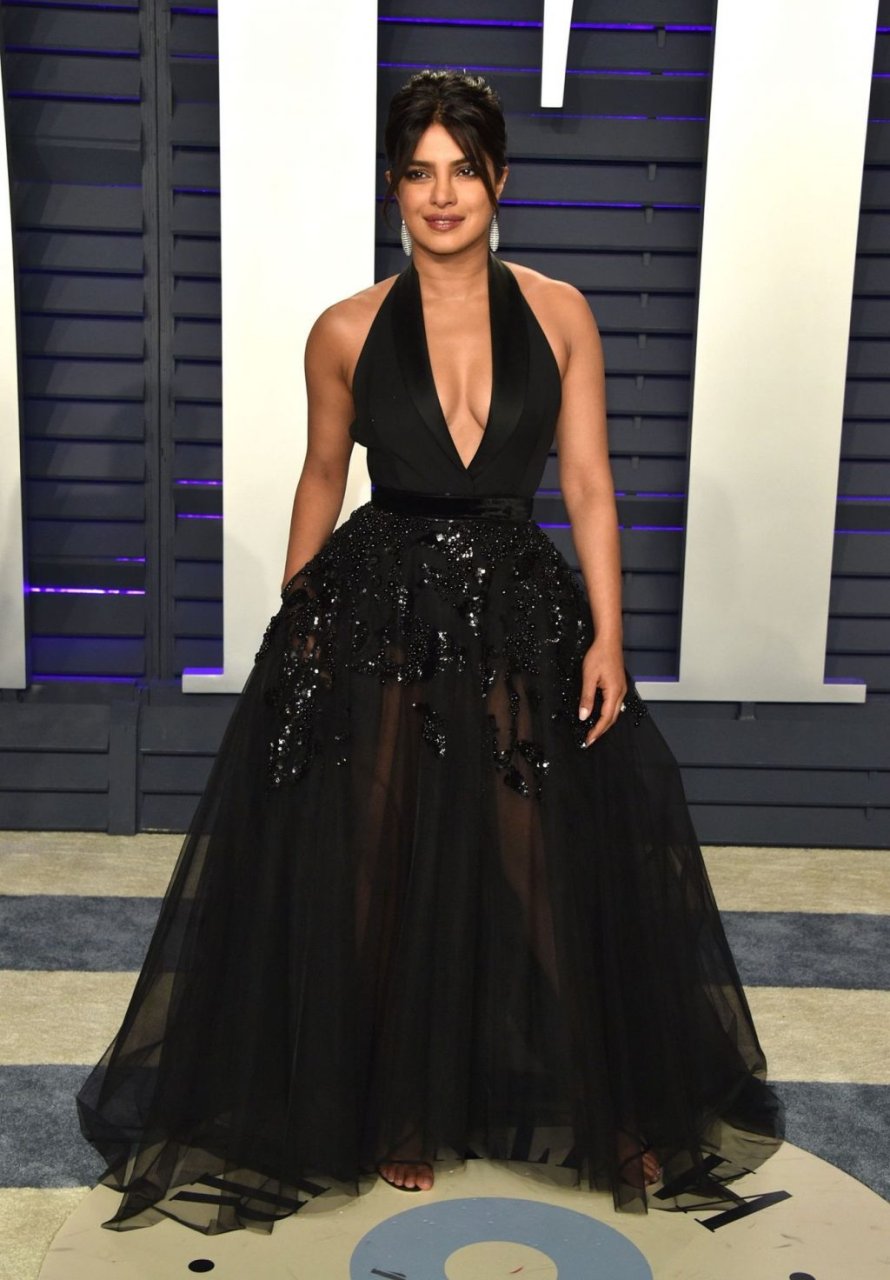 Attrice Priyanka Chopra mostra il suo décolleté indossando un vestito nero alla Vanity Fair Oscar Party 2019 a Beverly Hills, 24/02/2019.