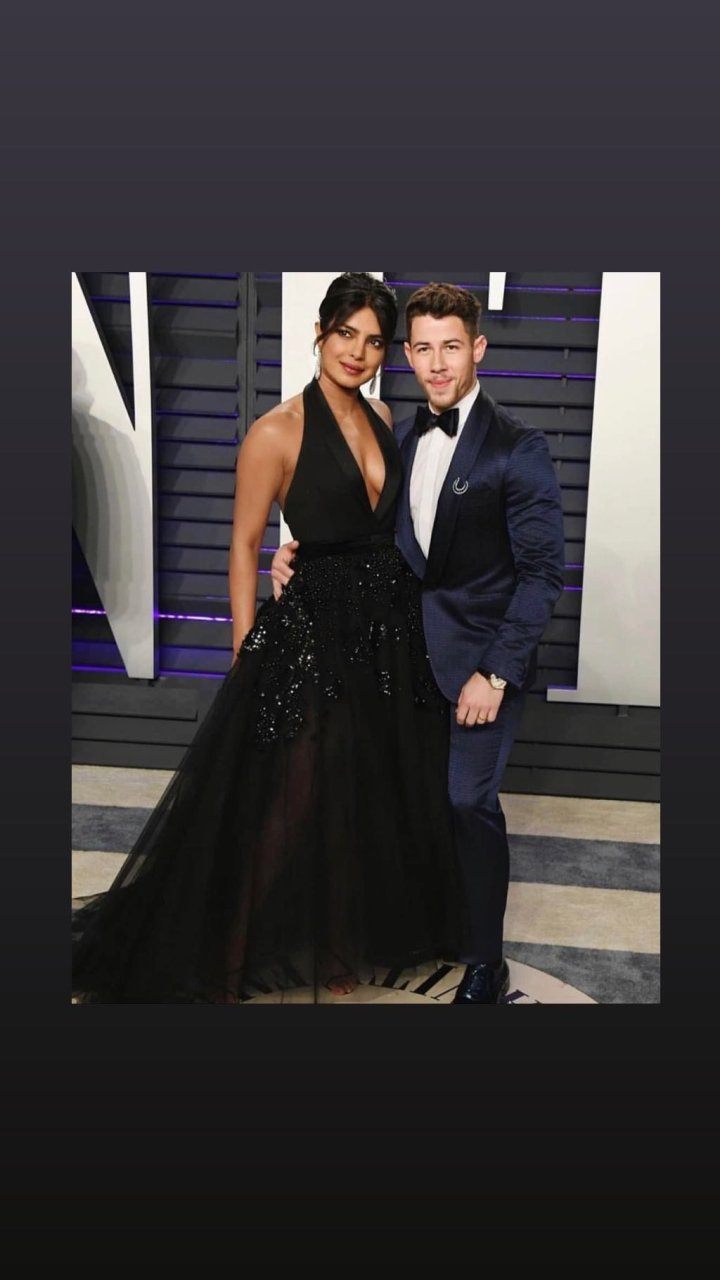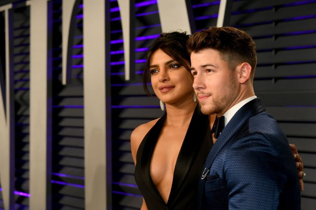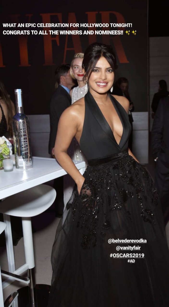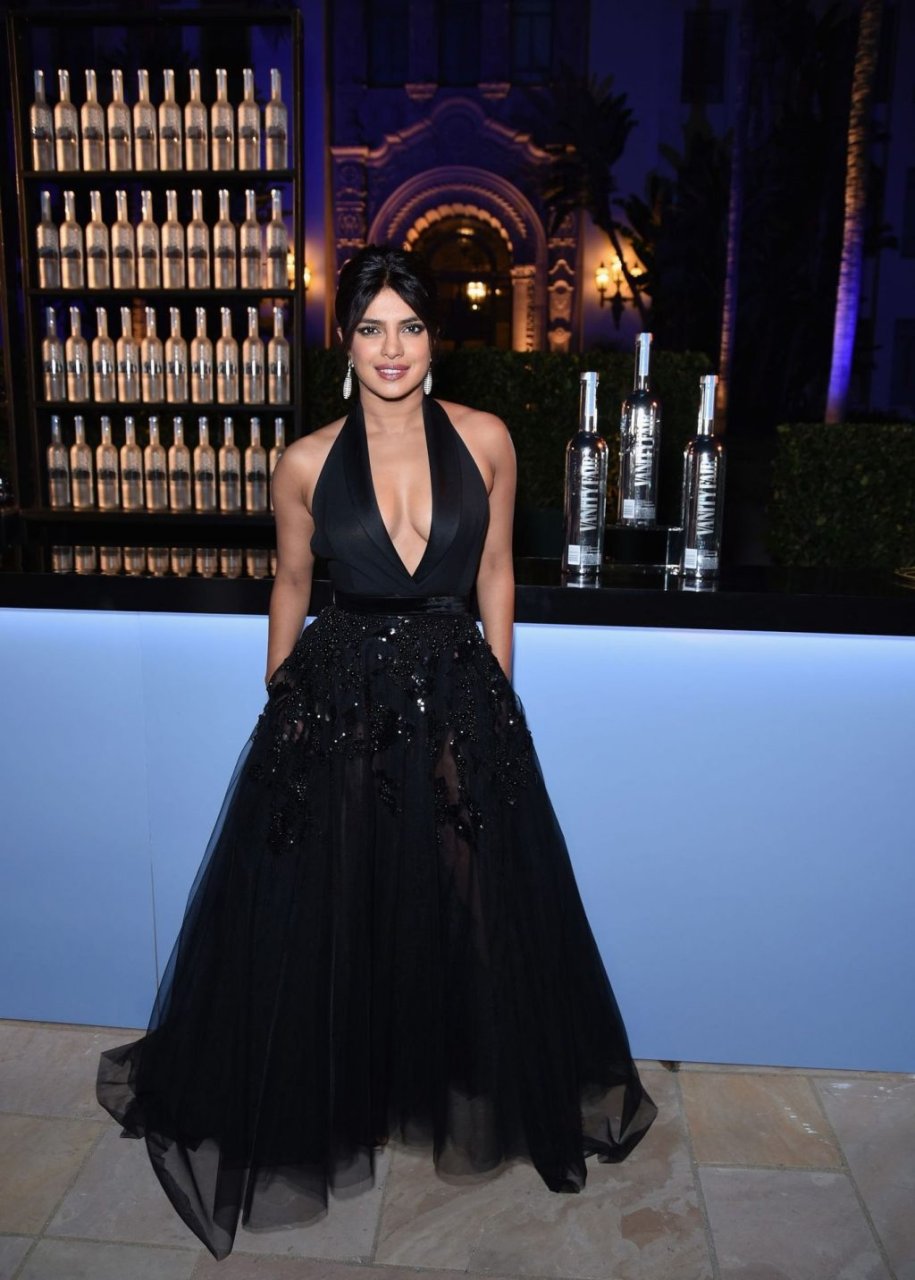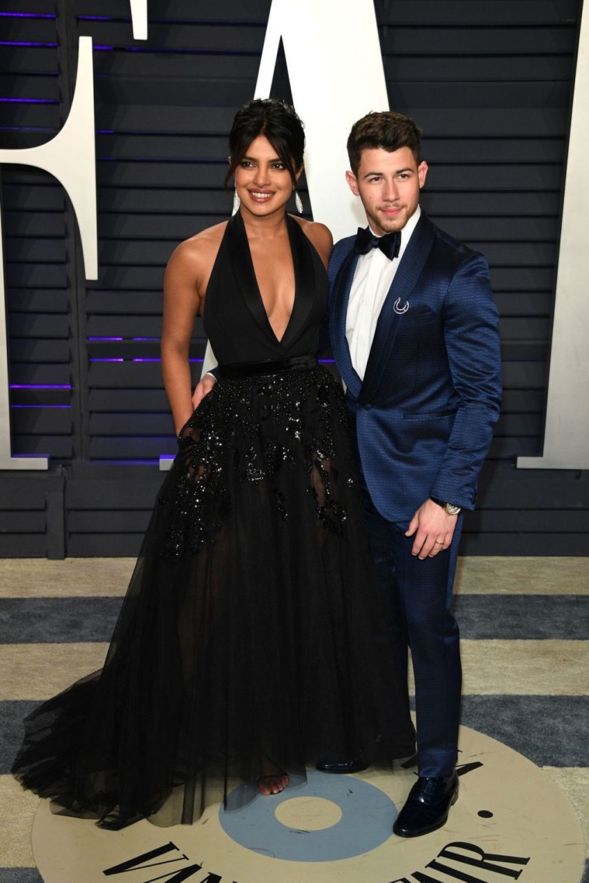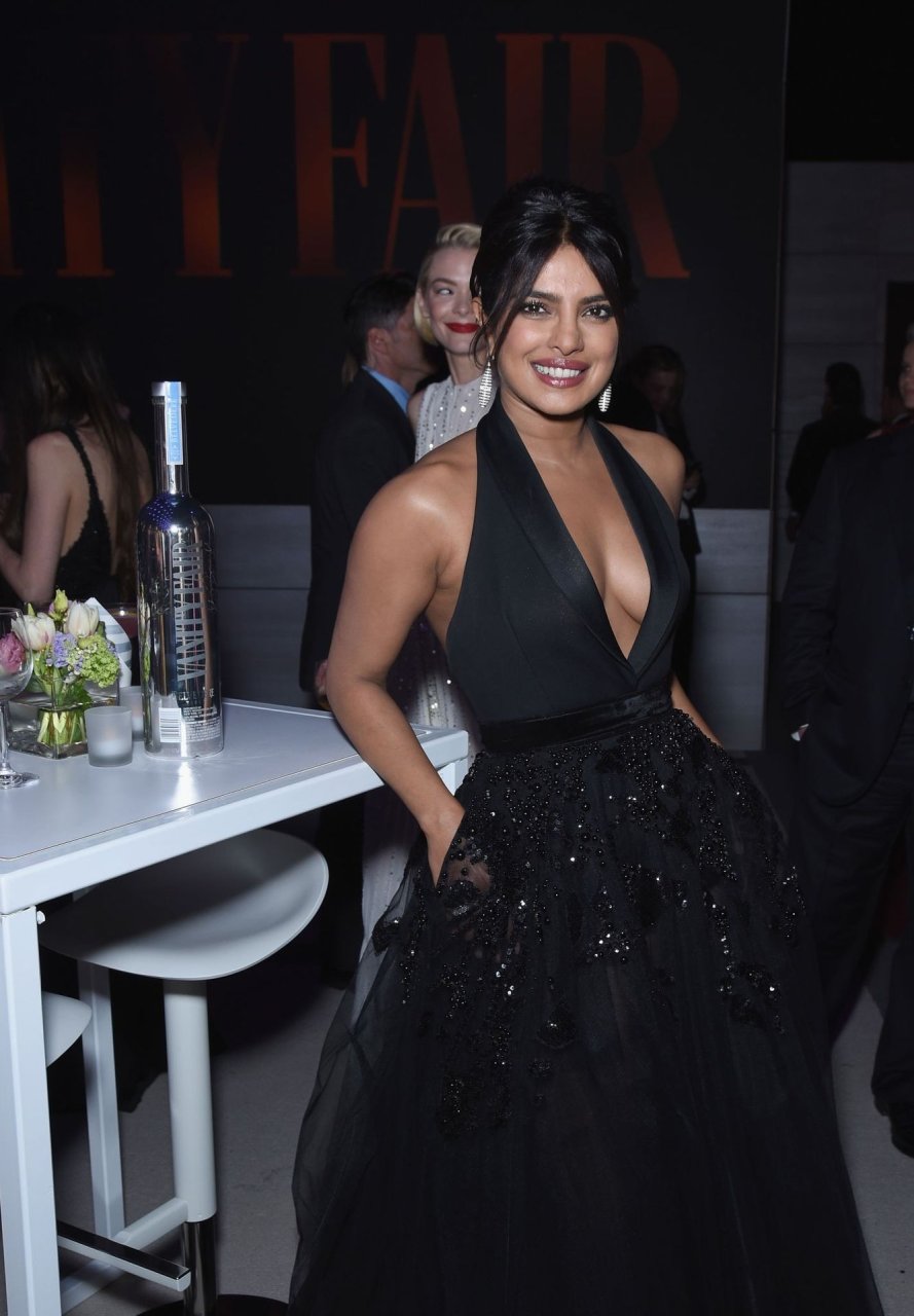Attrice Priyanka Chopra mostra il suo décolleté indossando un vestito nero alla Vanity Fair Oscar Party 2019 a Beverly Hills, 24/02/2019.