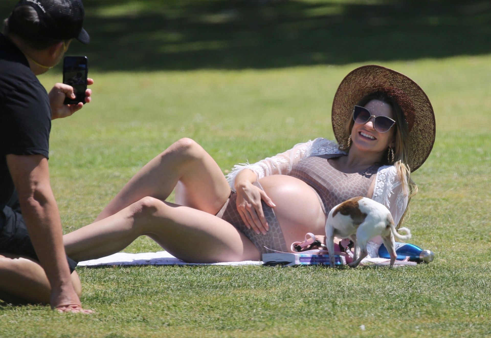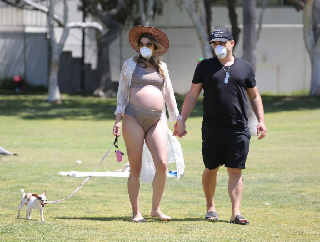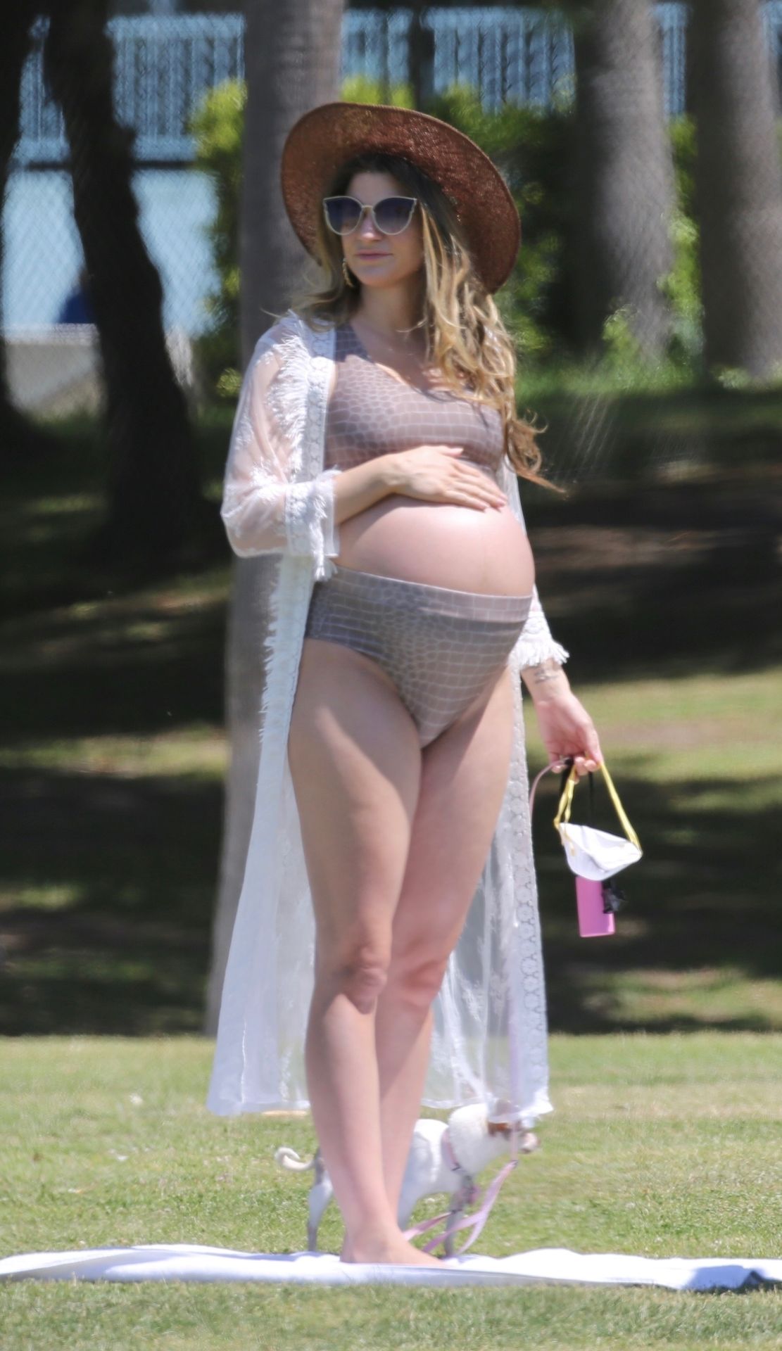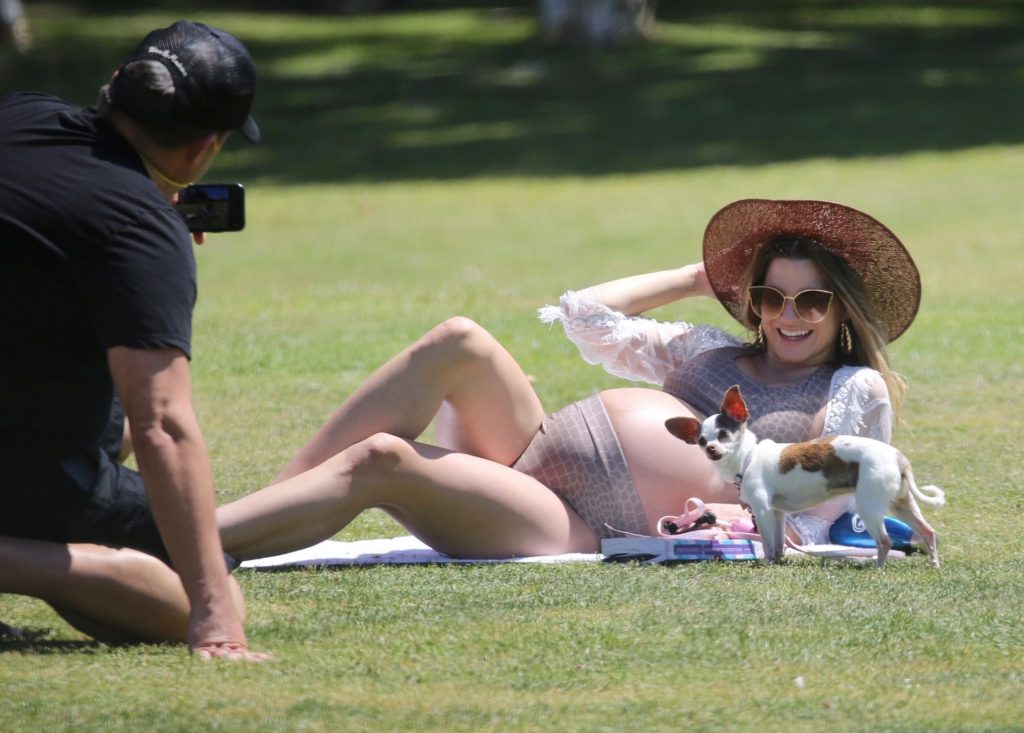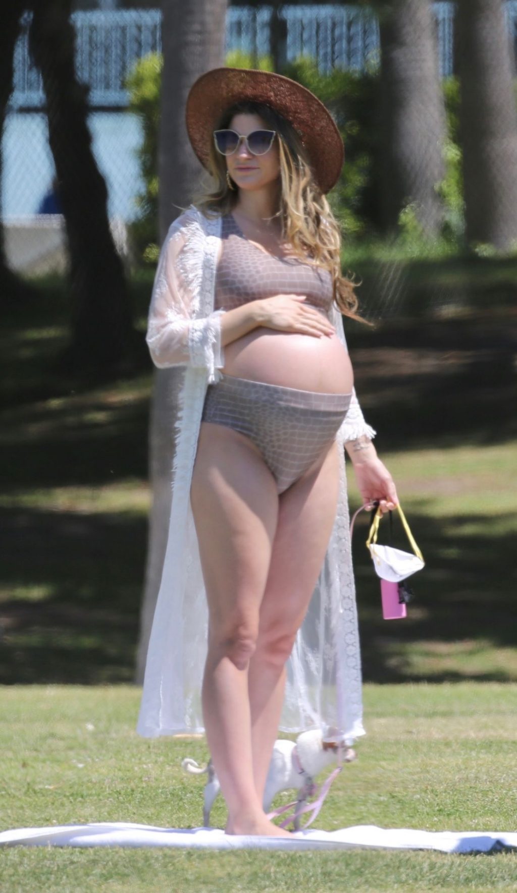La futura mamma è stata vista in un parco aperto vicino alla spiaggia in bikini. Il bikini con stampa serpente era abbinato a un accappatoio bianco da sole, un cappello da sole marrone e la famosa maschera N95. È stata vista con suo marito Rick Shirmer mentre prendevano il sole, giocava con il suo cucciolo e leggeva un libro sulla gravidanza.