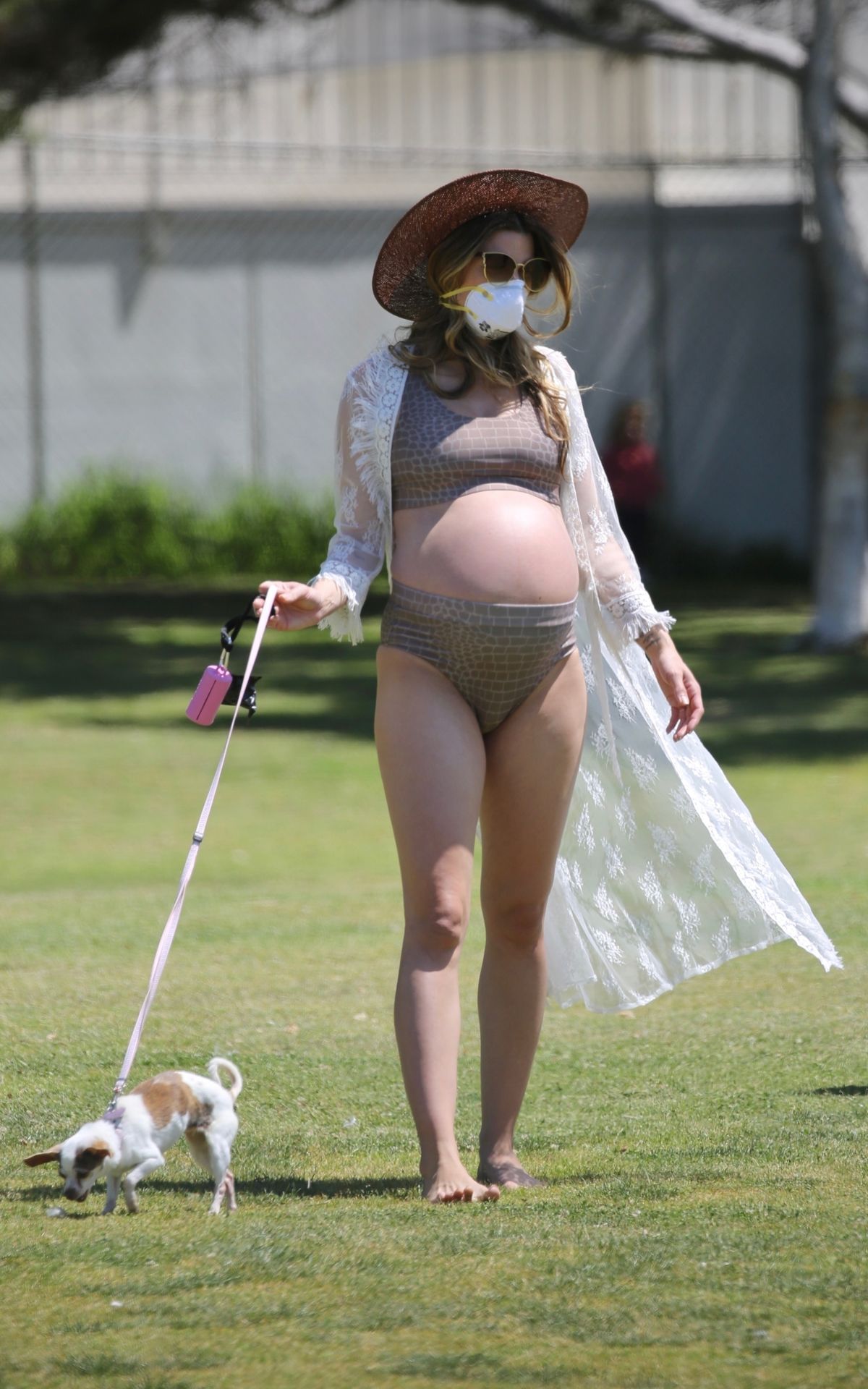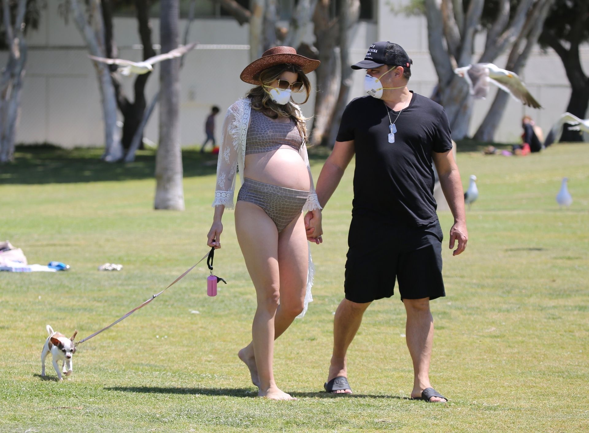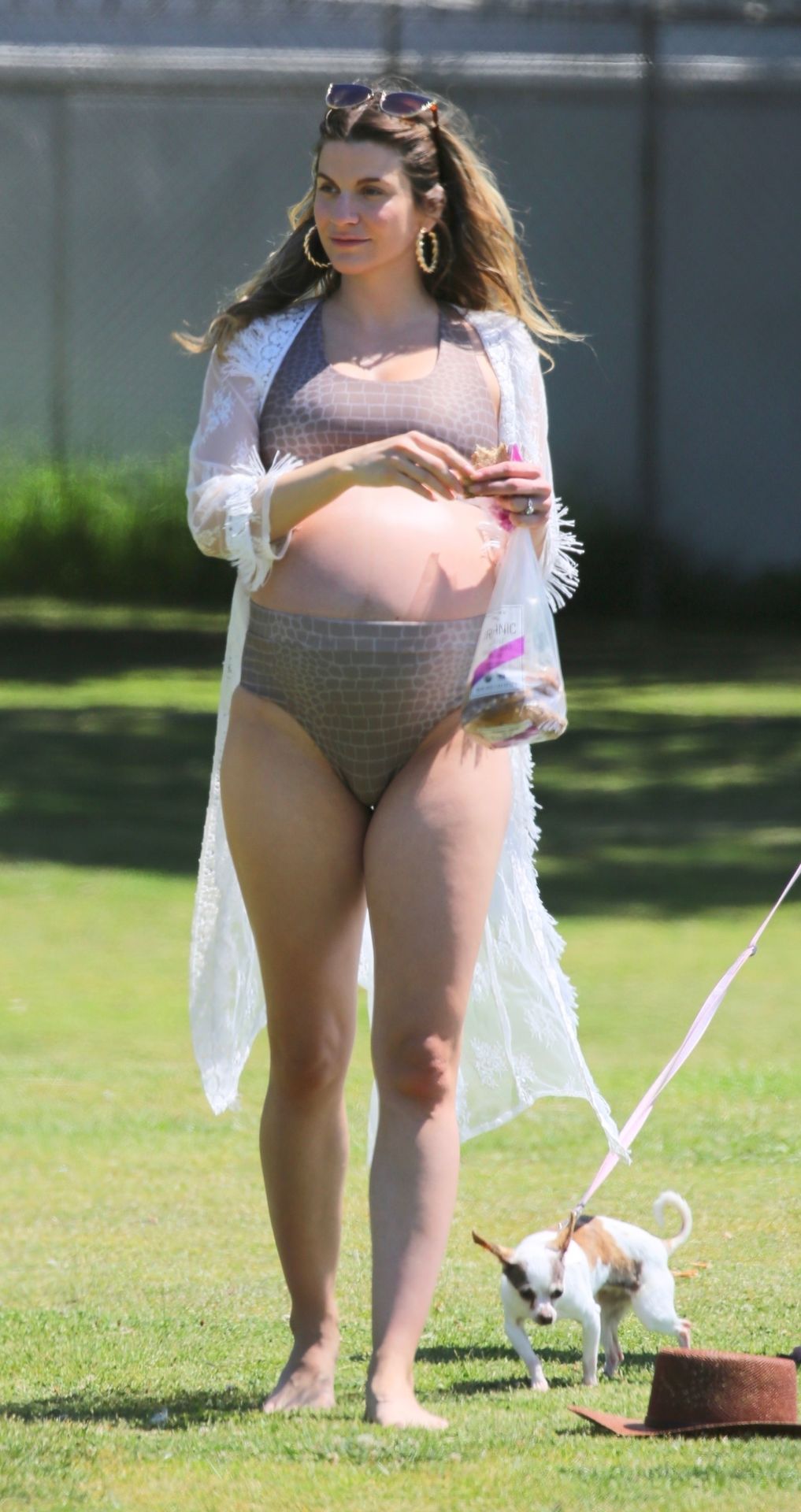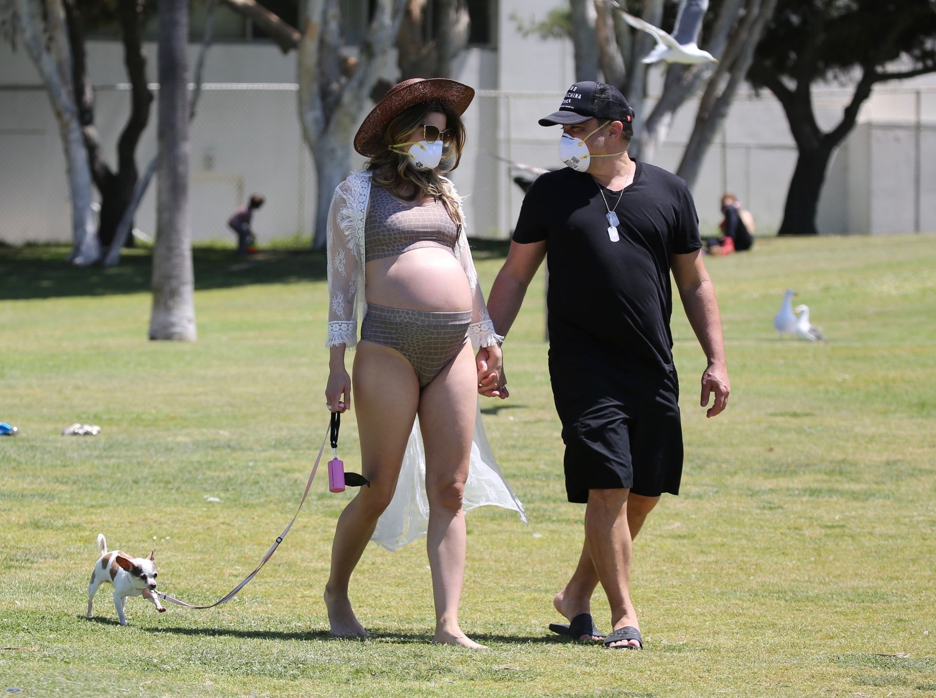 La futura mamma è stata vista in un parco aperto vicino alla spiaggia in bikini. Il bikini con stampa serpente era abbinato a un accappatoio bianco da sole, un cappello da sole marrone e la famosa maschera N95. È stata vista con suo marito Rick Shirmer mentre prendevano il sole, giocava con il suo cucciolo e leggeva un libro sulla gravidanza.