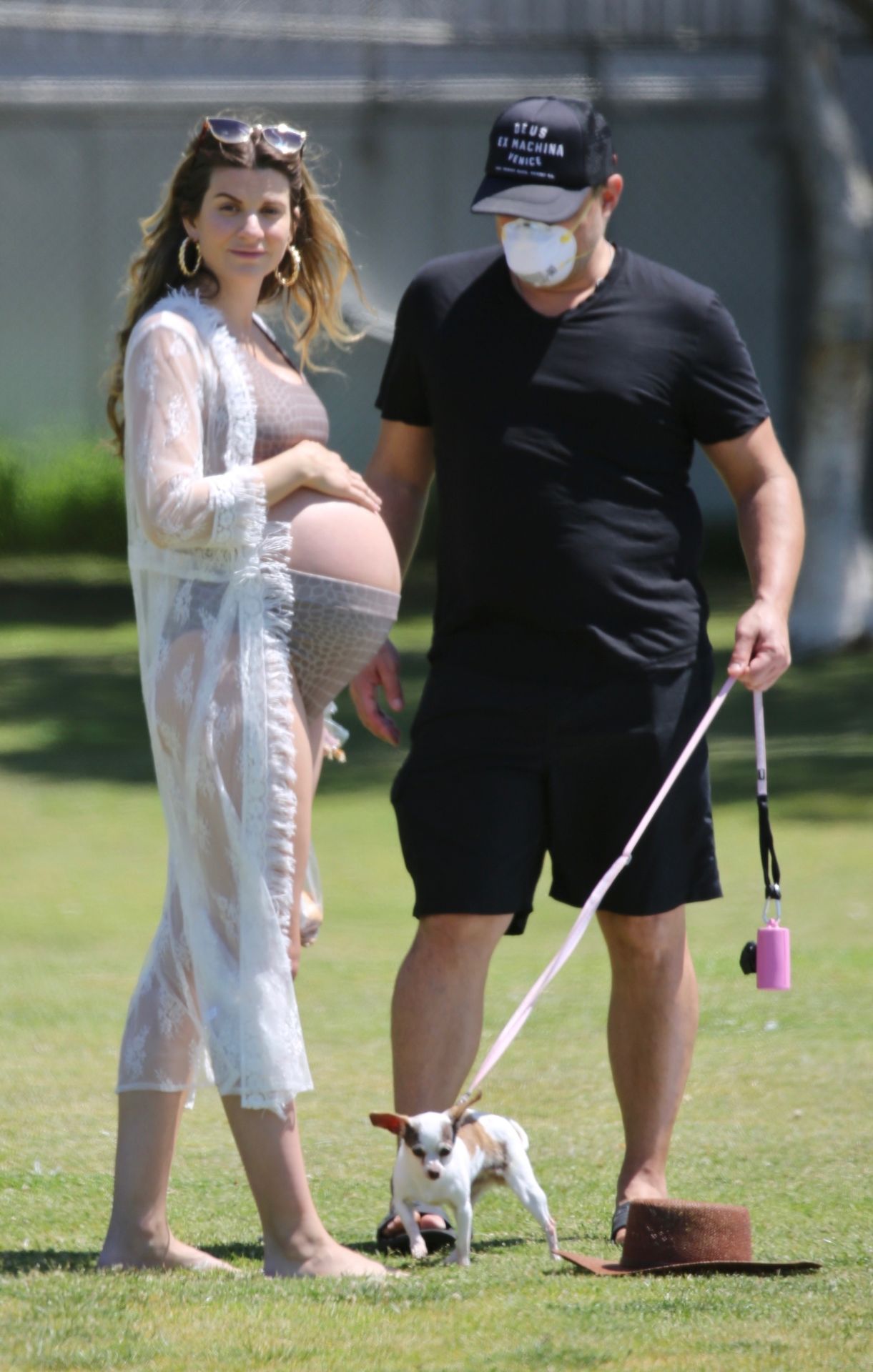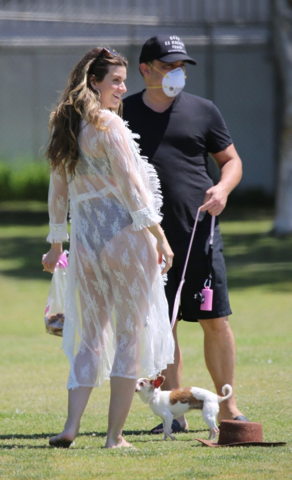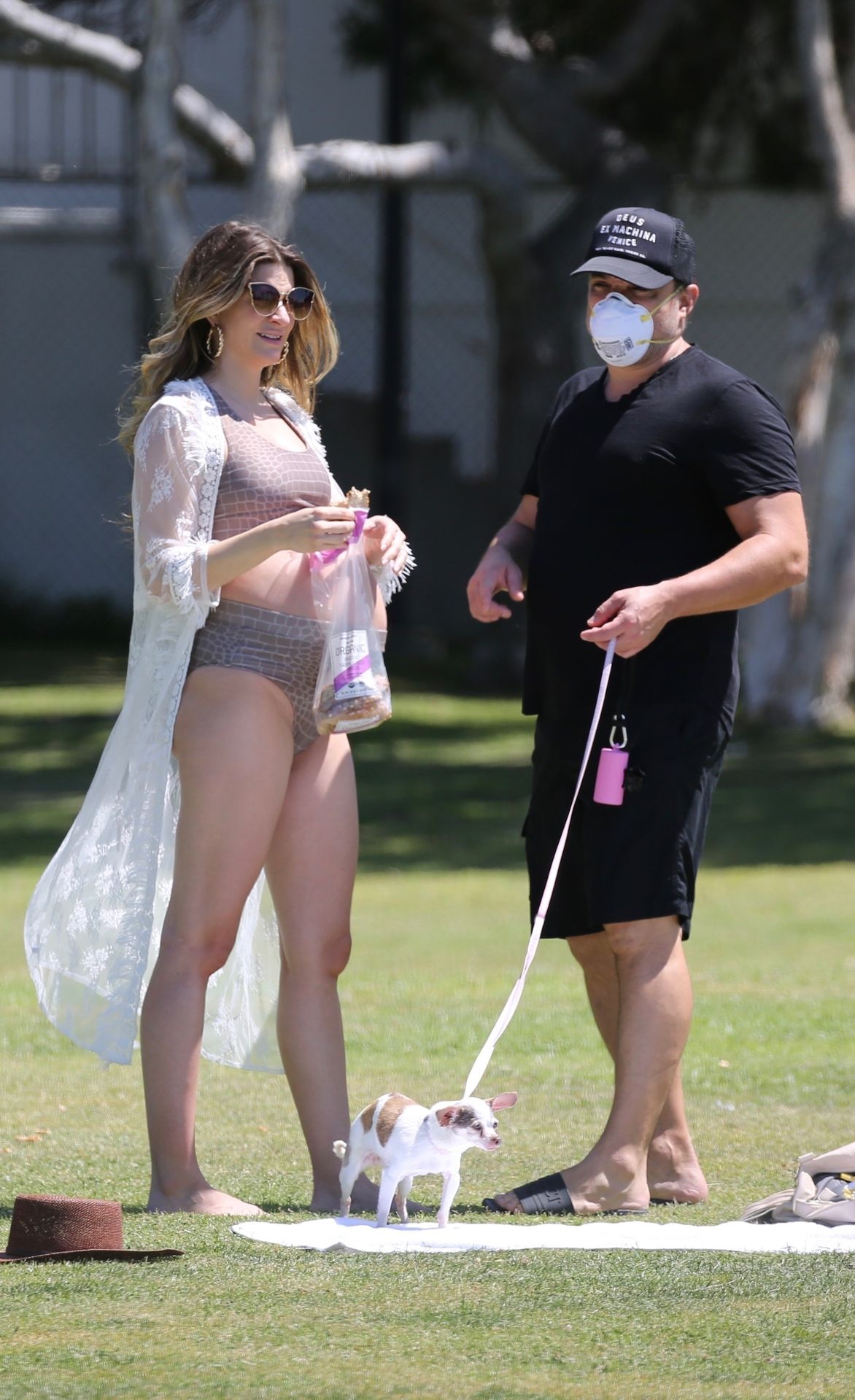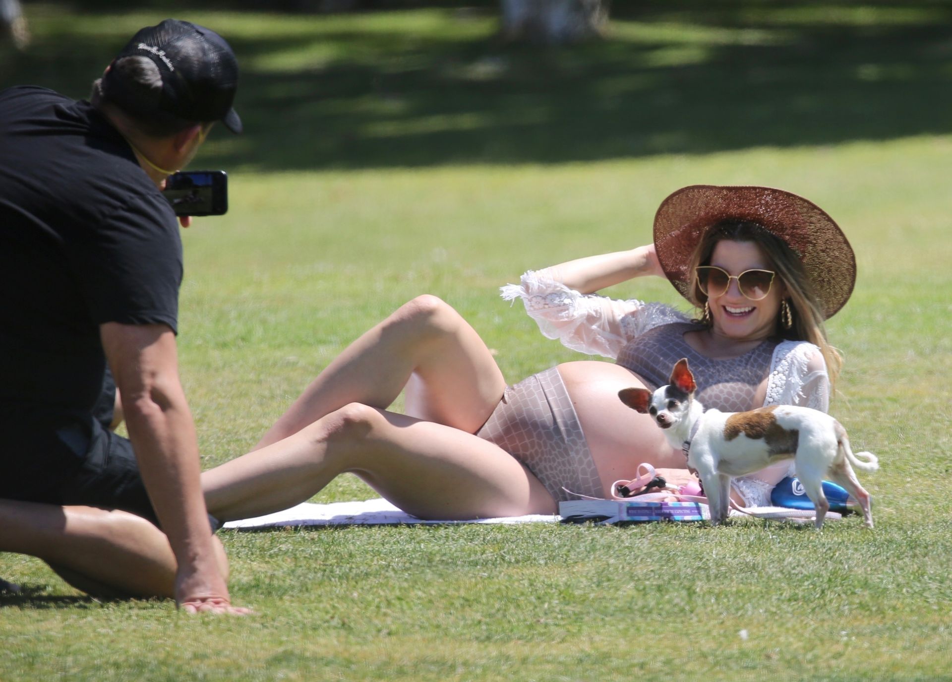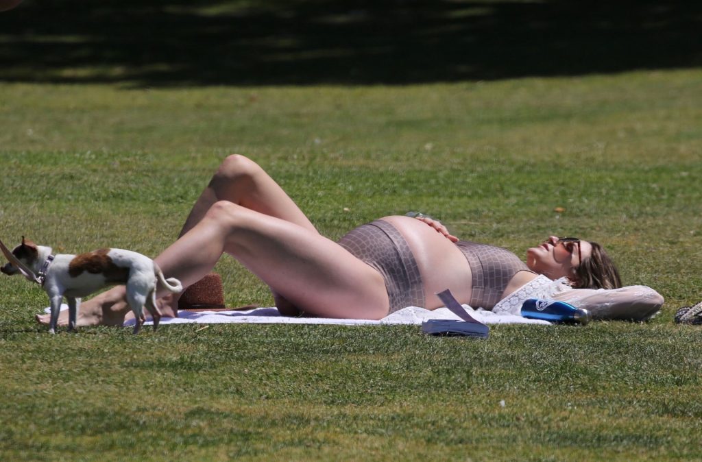 La futura mamma è stata vista in un parco aperto vicino alla spiaggia in bikini. Il bikini con stampa serpente era abbinato a un accappatoio bianco da sole, un cappello da sole marrone e la famosa maschera N95. È stata vista con suo marito Rick Shirmer mentre prendevano il sole, giocava con il suo cucciolo e leggeva un libro sulla gravidanza.
