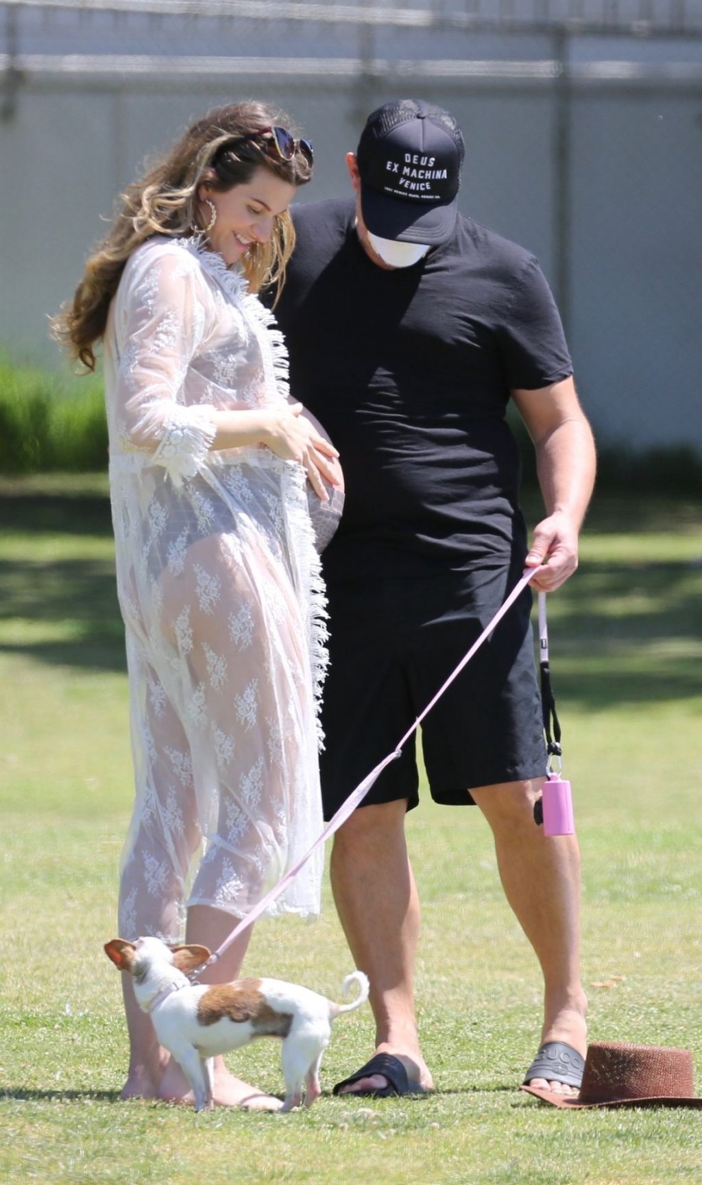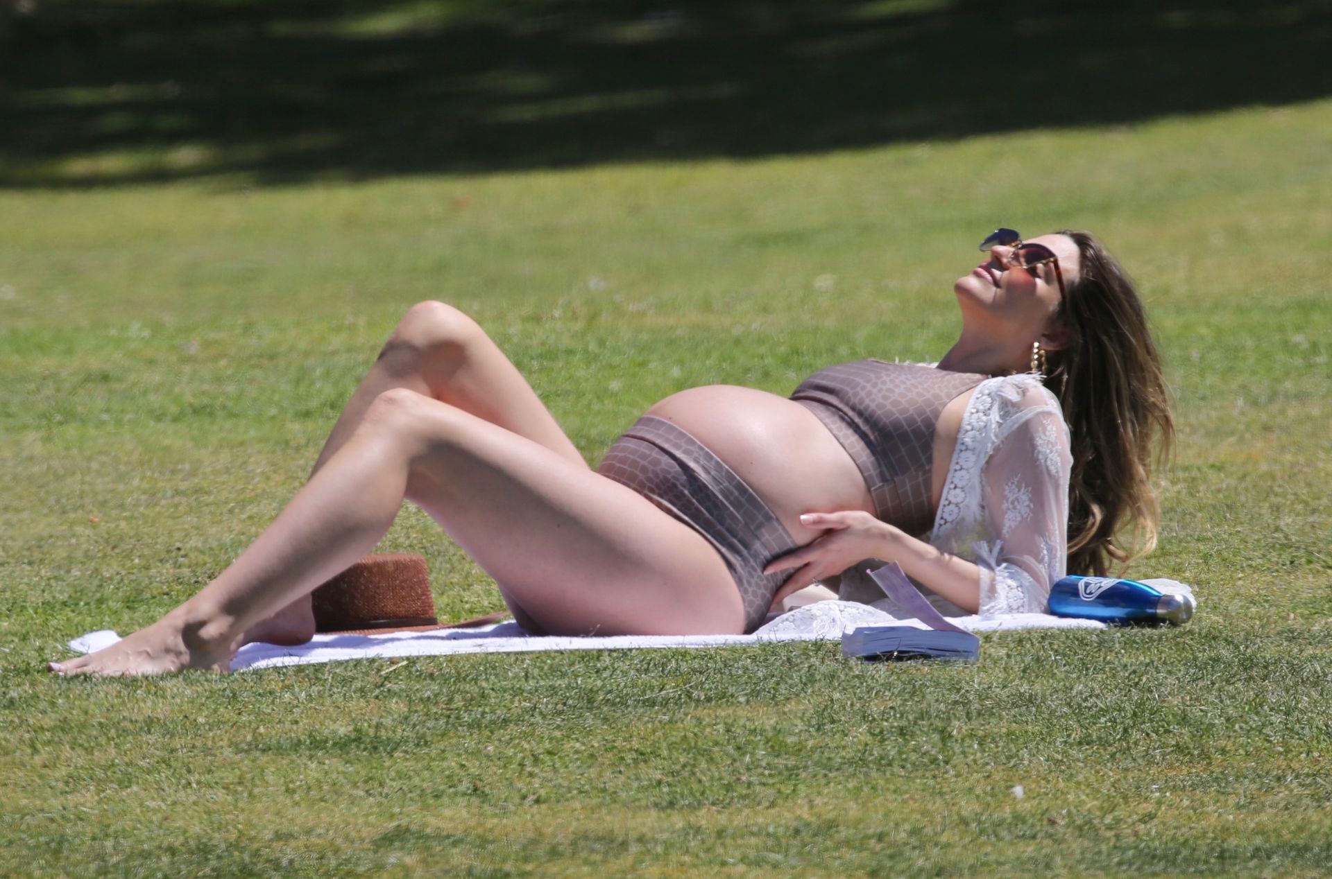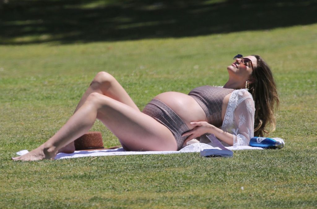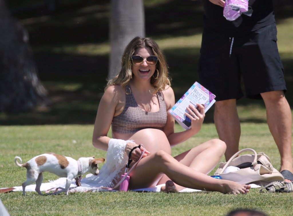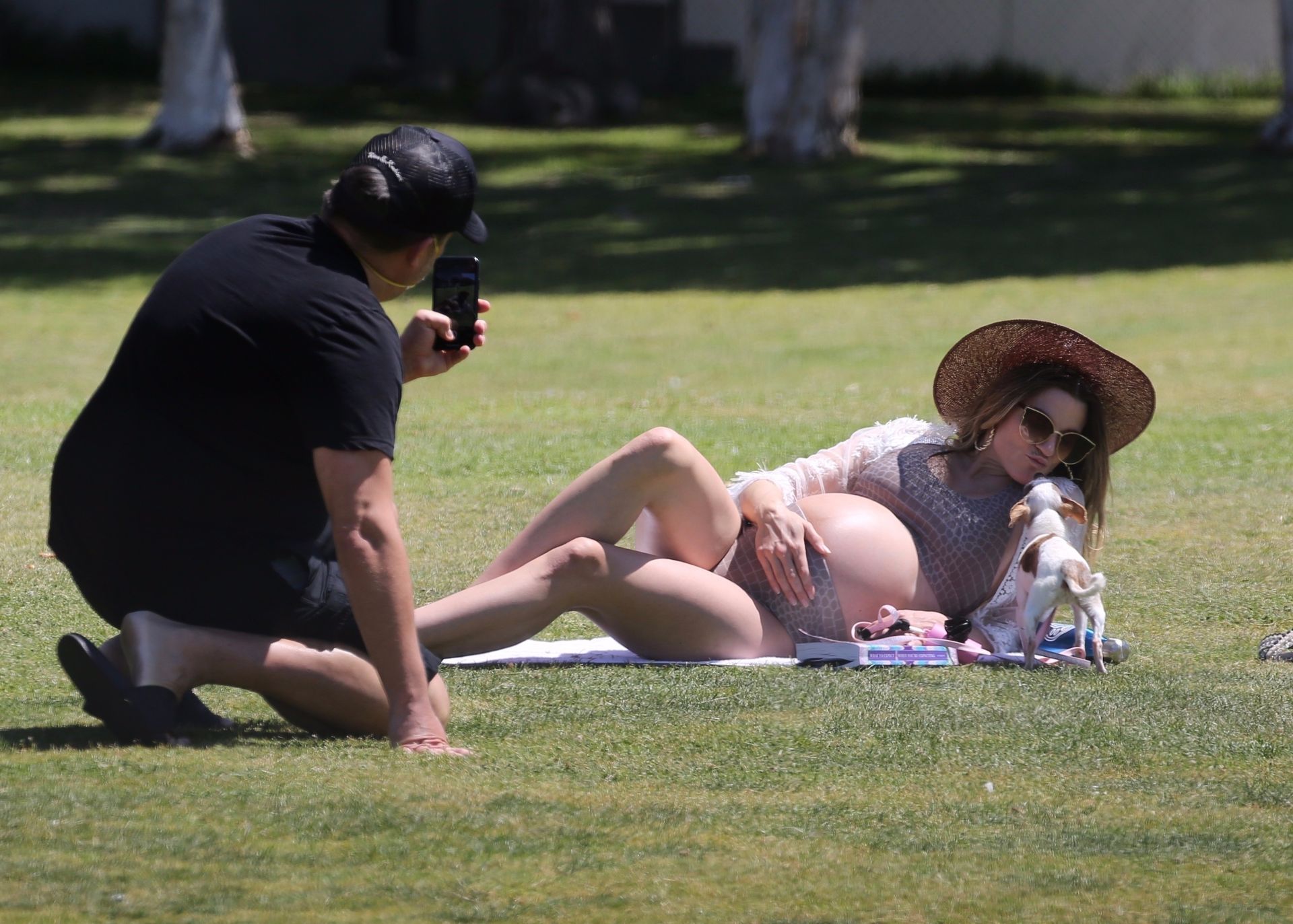La futura mamma è stata vista in un parco aperto vicino alla spiaggia in bikini. Il bikini con stampa serpente era abbinato a un accappatoio bianco da sole, un cappello da sole marrone e la famosa maschera N95. È stata vista con suo marito Rick Shirmer mentre prendevano il sole, giocava con il suo cucciolo e leggeva un libro sulla gravidanza.