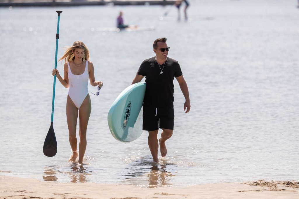 Rachel McCord mostra il suo corpo mozzafiato sulla spiaggia di Santa Monica, 31/08/2018. La blogger di 28 anni indossava un costume da bagno bianco mentre si godeva il paddleboarding.