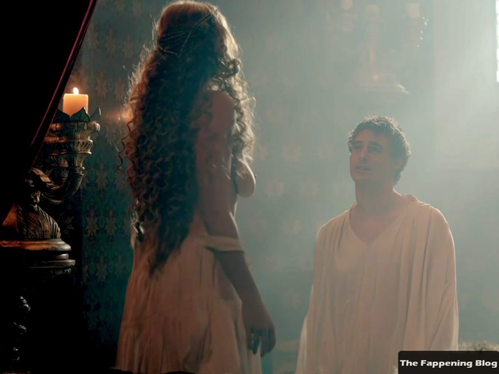 Rebecca Ferguson è seduta in una vasca da bagno con i seni sopra l’acqua e i capezzoli che spuntano tra i capelli. Poi si alza senza maglietta circondata dalle sue assistenti, che la avvolgono dopo il bagno.