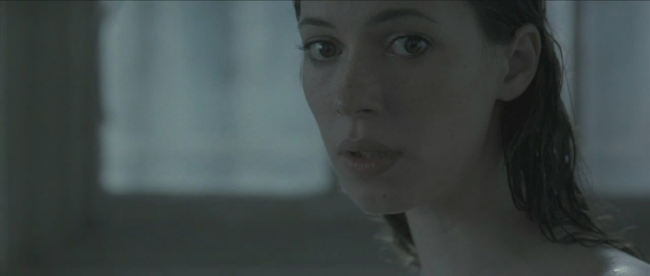 Rebecca Hall pulls herself up out of a bathtub and briefly shows her left breast when she drops her towel. She then walks toward a hole in the wall and kneels to peek in, showing her bareback.