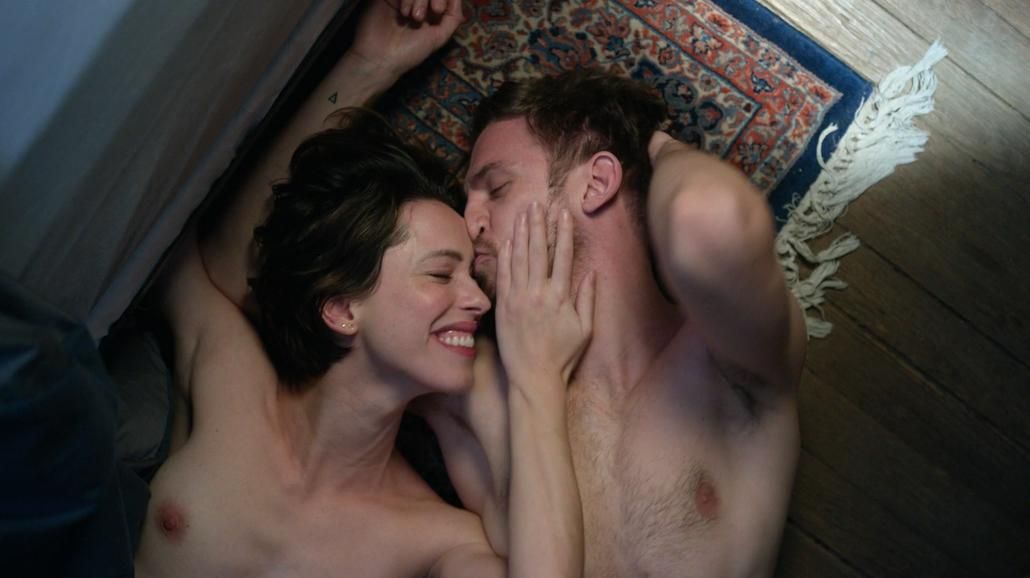 Rebecca Hall is lying topless on her back on the floor next to a bed, her right breast in view as a guy lies next to her and leans over to kiss her. From Permission.