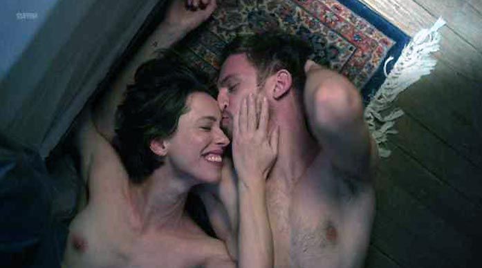 Bella Heathcote is nude underneath a see-through white dress. Showing her nipples through before she and Rebecca Hall roll around on the floor together and lesbian kiss. Bella then opens Rebecca’s coat and bares her breasts, kissing Rebecca on the chest. A guy then gets involved for a threesome, Bella having sex on top of him as Rebecca leans over to kiss Bella at the same time.