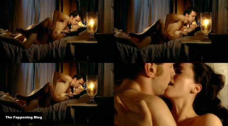 Rebecca Hall is rolling over on a bed and lesbian kissing Bella Heathcoate. We see her standing by the bed, undressing and showing a see-through bra with her nipples visible underneath. We then see her in a nightie leading Bella and a guy downstairs, Bella wearing a nurse’s outfit. The girls kiss some more as Bella ties Rebecca and the guy up with some rope.