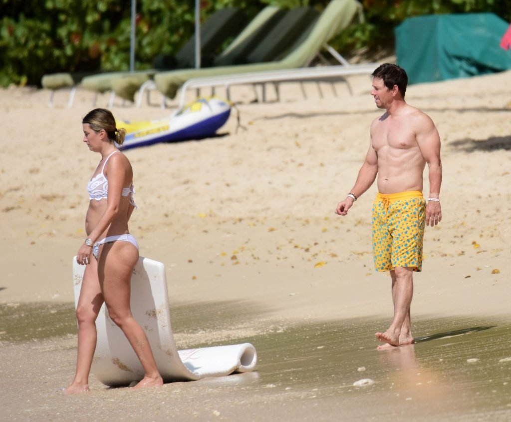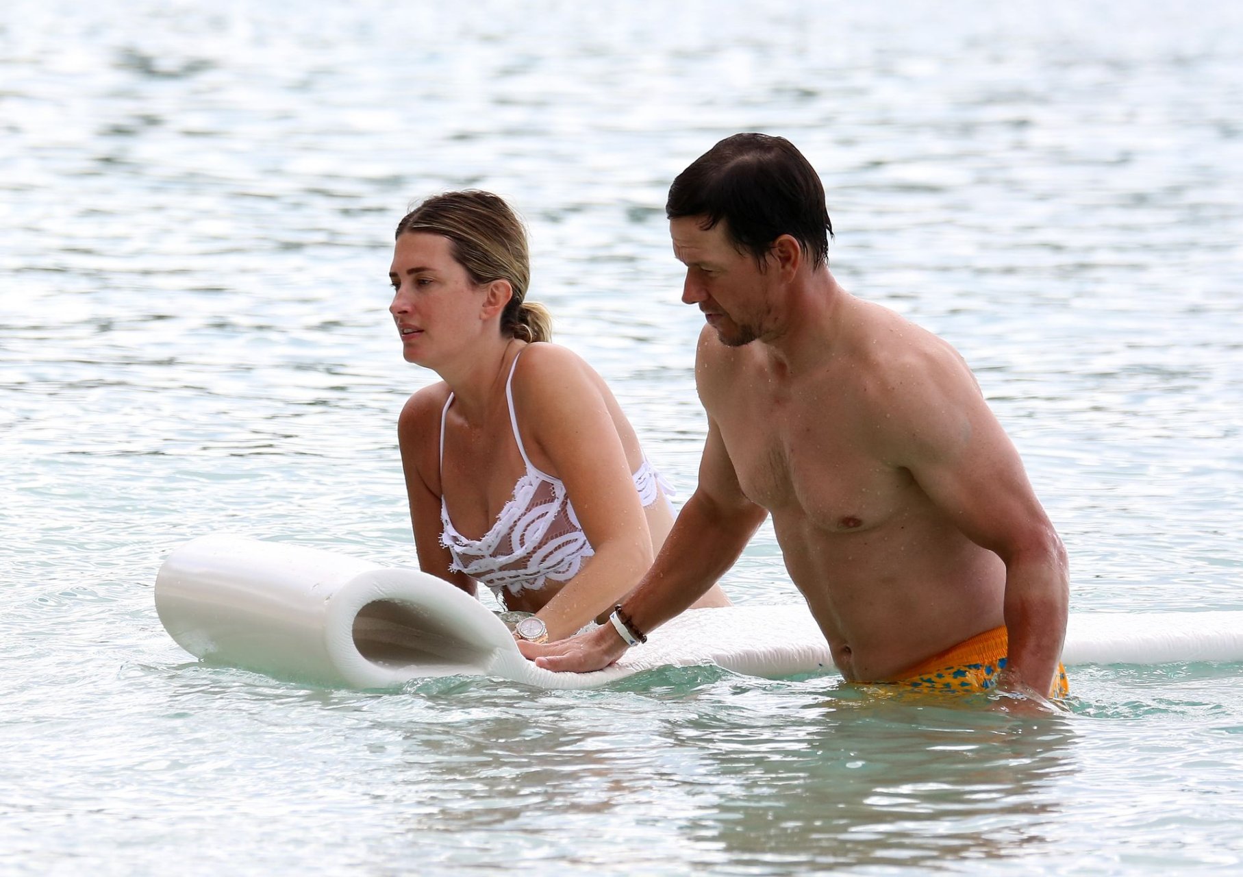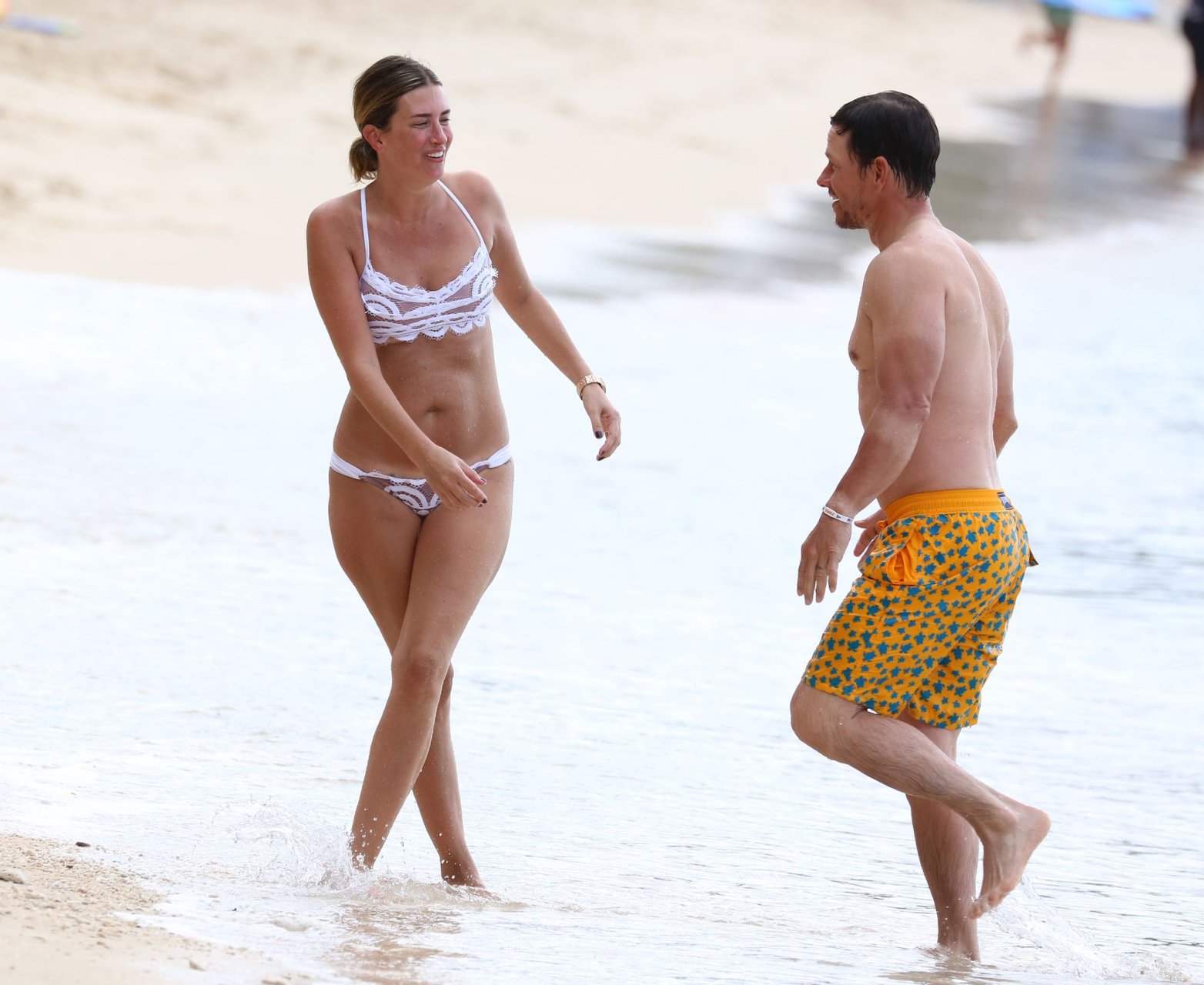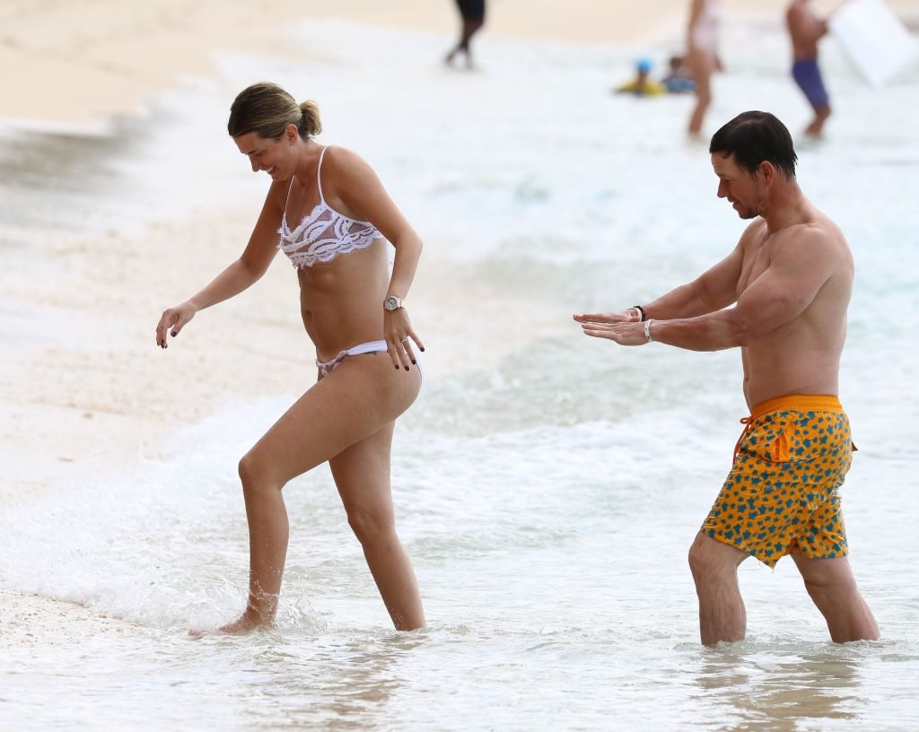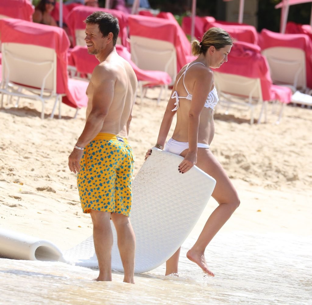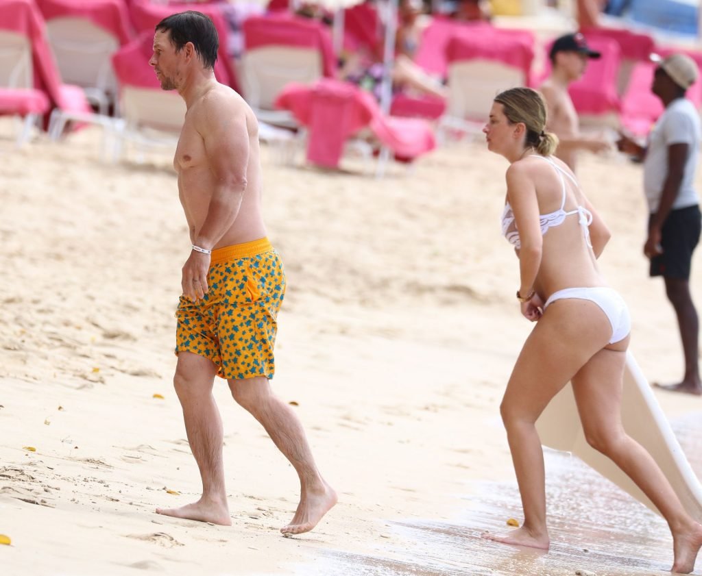 Mark Wahlberg e sua moglie Rhea Durham condividono un momento romantico mentre nuotano durante la loro vacanza a Barbados, 01/03/2019. Rhea è stata vista in bikini bianco sulla spiaggia.