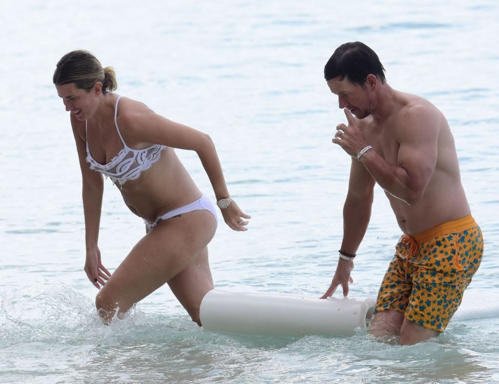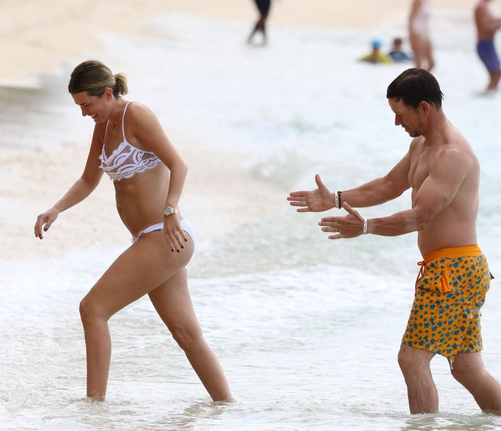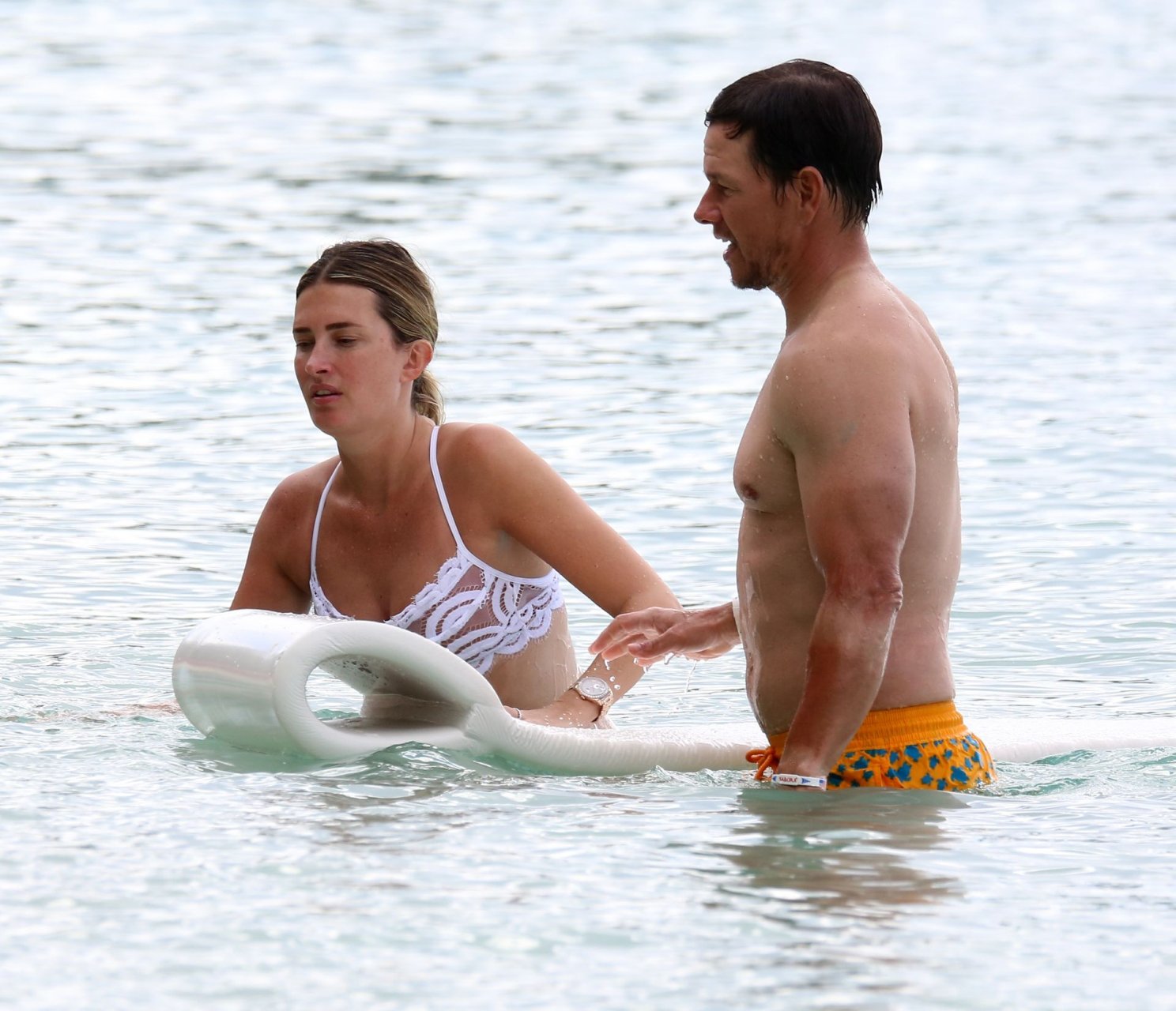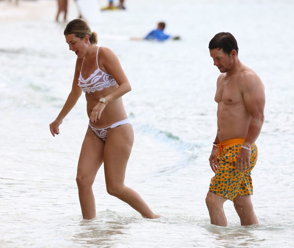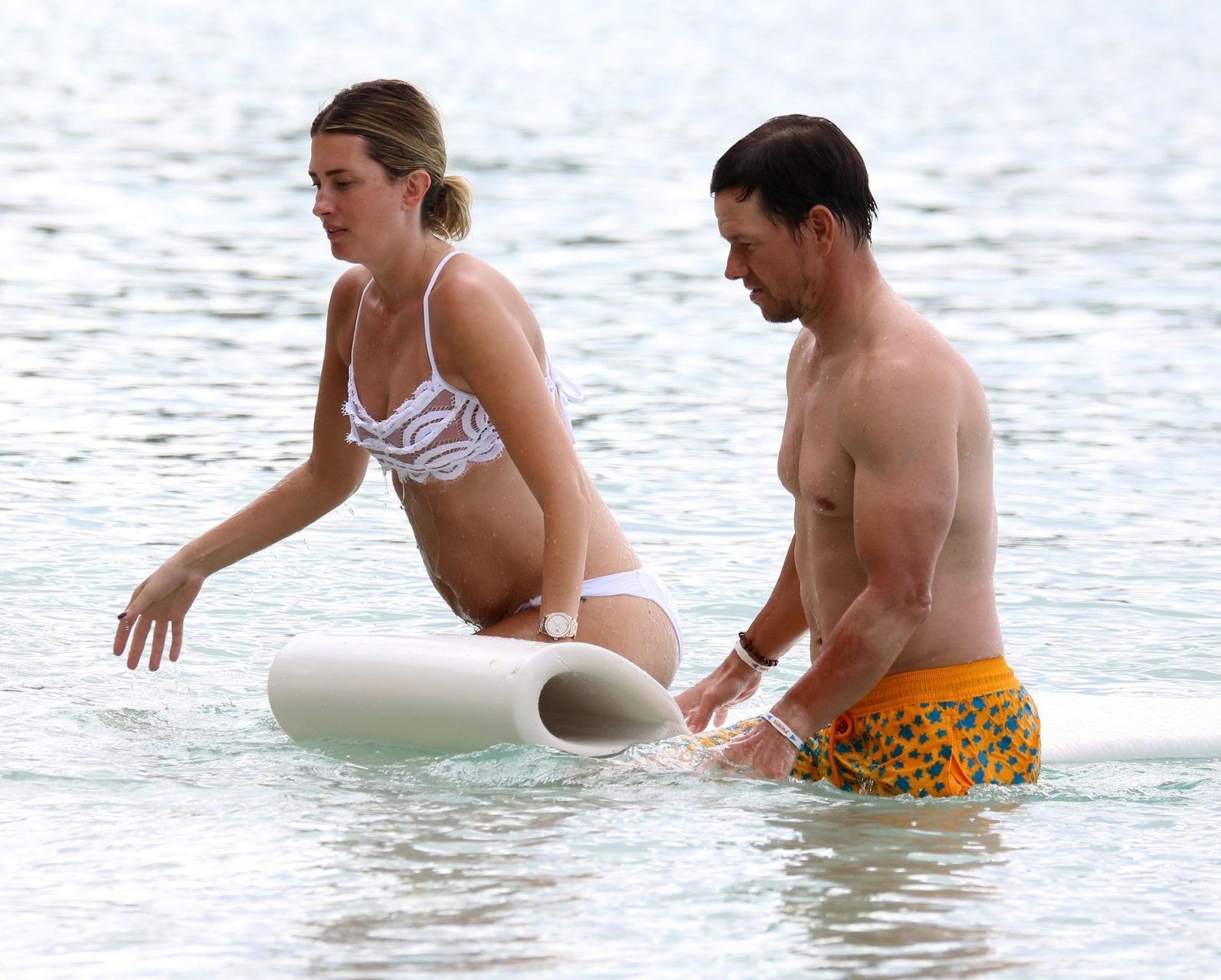 Mark Wahlberg e sua moglie Rhea Durham condividono un momento romantico mentre nuotano durante la loro vacanza a Barbados, 01/03/2019. Rhea è stata vista in bikini bianco sulla spiaggia.