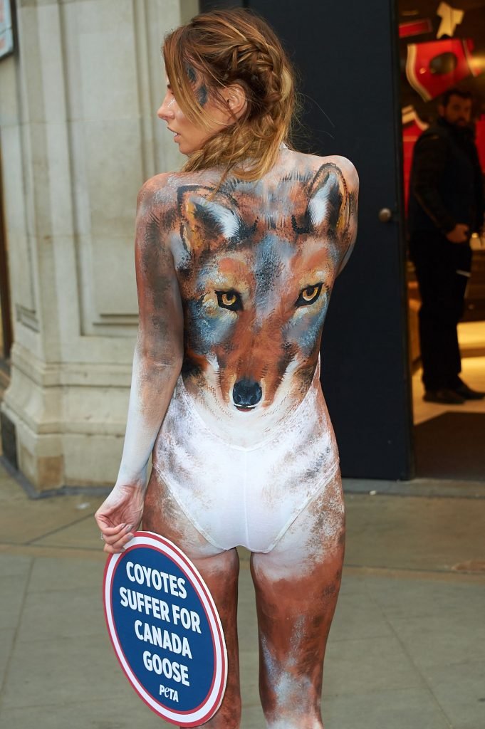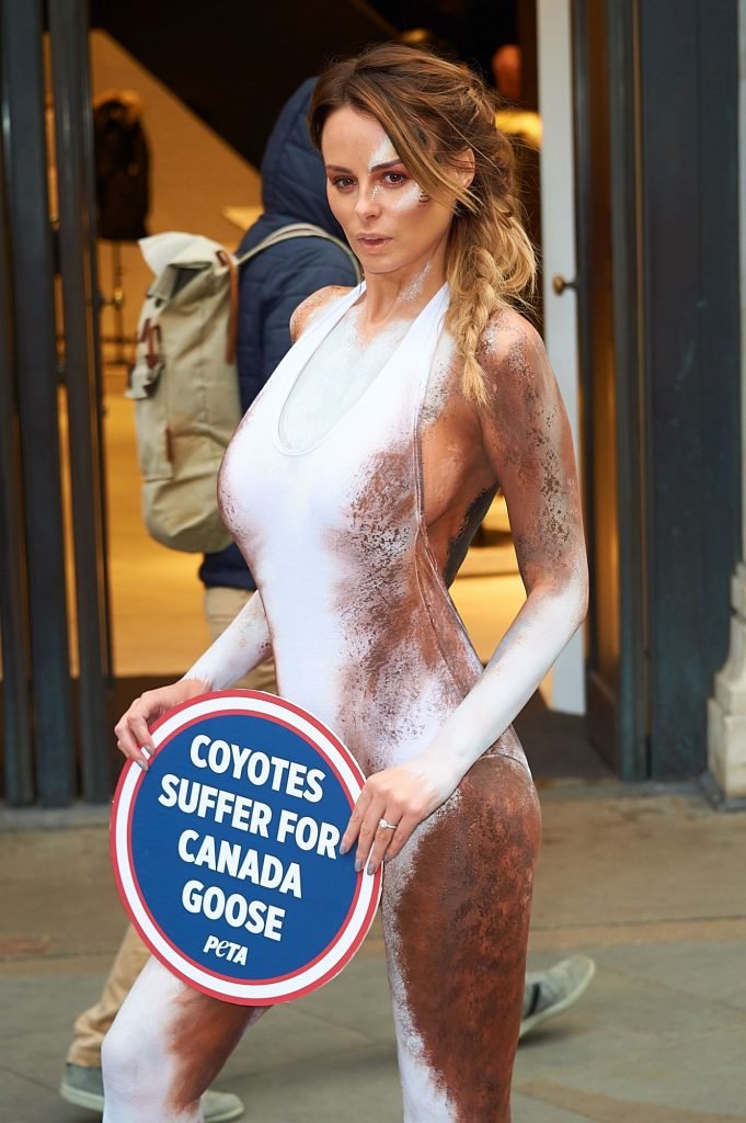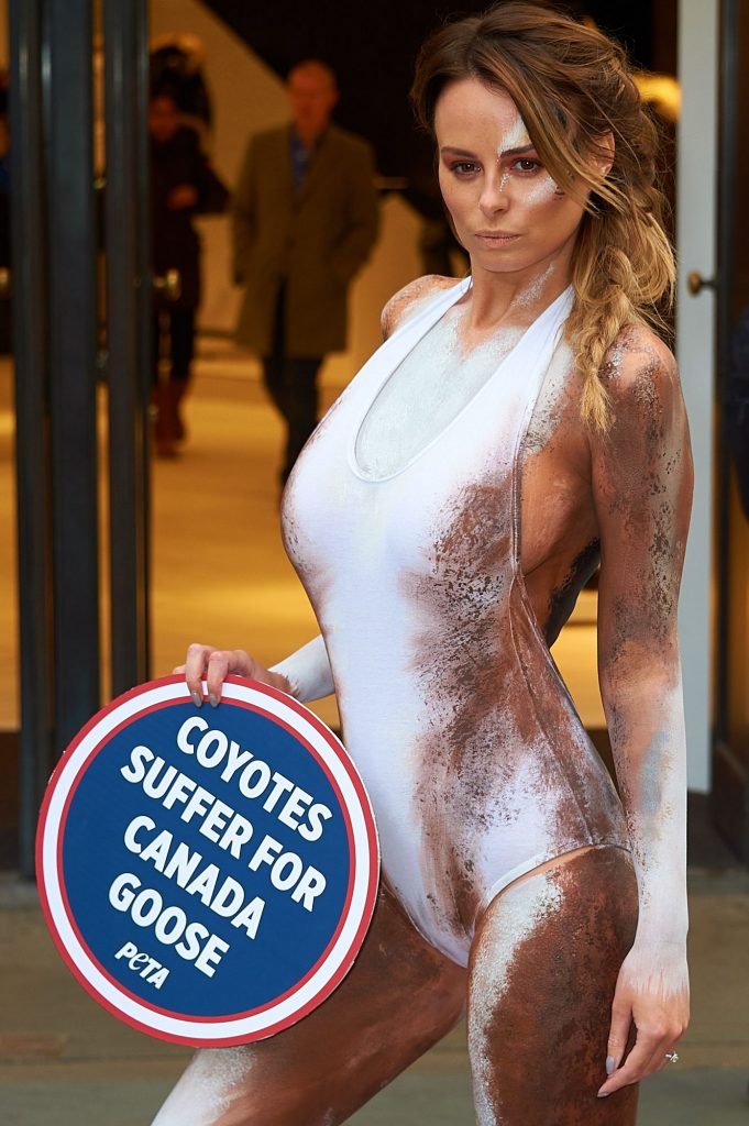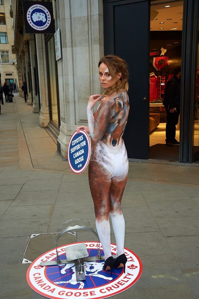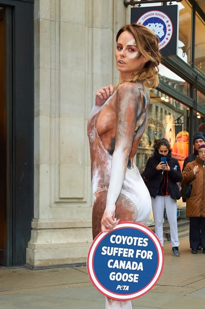 Modella glamour Rhian Sugden, 31 anni, posa per la nuova campagna PETA a Londra, 29/11/2017.