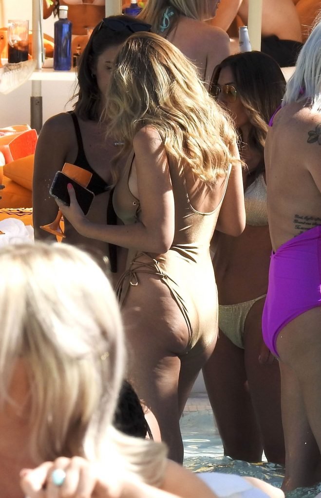 La modella britannica Rhian Sugden è apparsa sexy in vacanza con il suo costume da bagno dorato aderente mentre beveva qualche drink con gli amici a una festa all’Ocean Beach Club di Ibiza, 13/06/2018. La modella di Page 3 è stata coinvolta in presunti scambi di messaggi con il presentatore TV Vernon Kay.