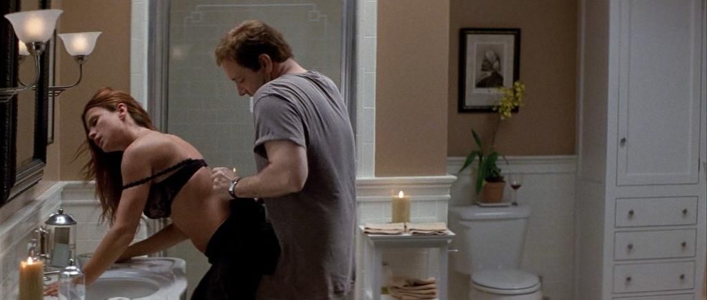Rhona Mitra is an intense sex scene with her professor in the bathroom. First, a guy is pulling off her shirt to reveal her sexy lingerie. Then he lifts her skirt and pulls down her thong panties, exposing her naked ass. Now, she bends over as the guy has hard sex with her from behind.