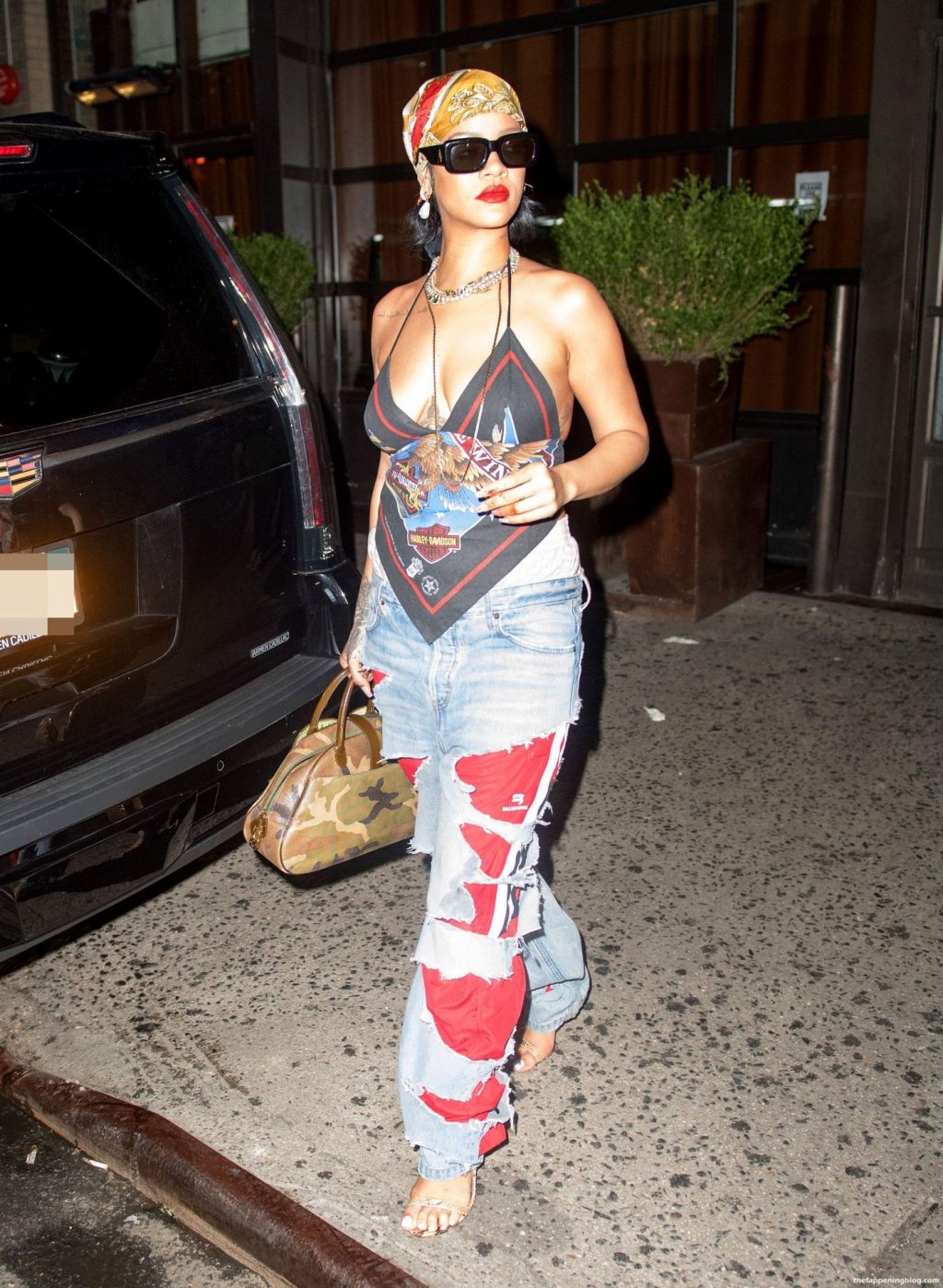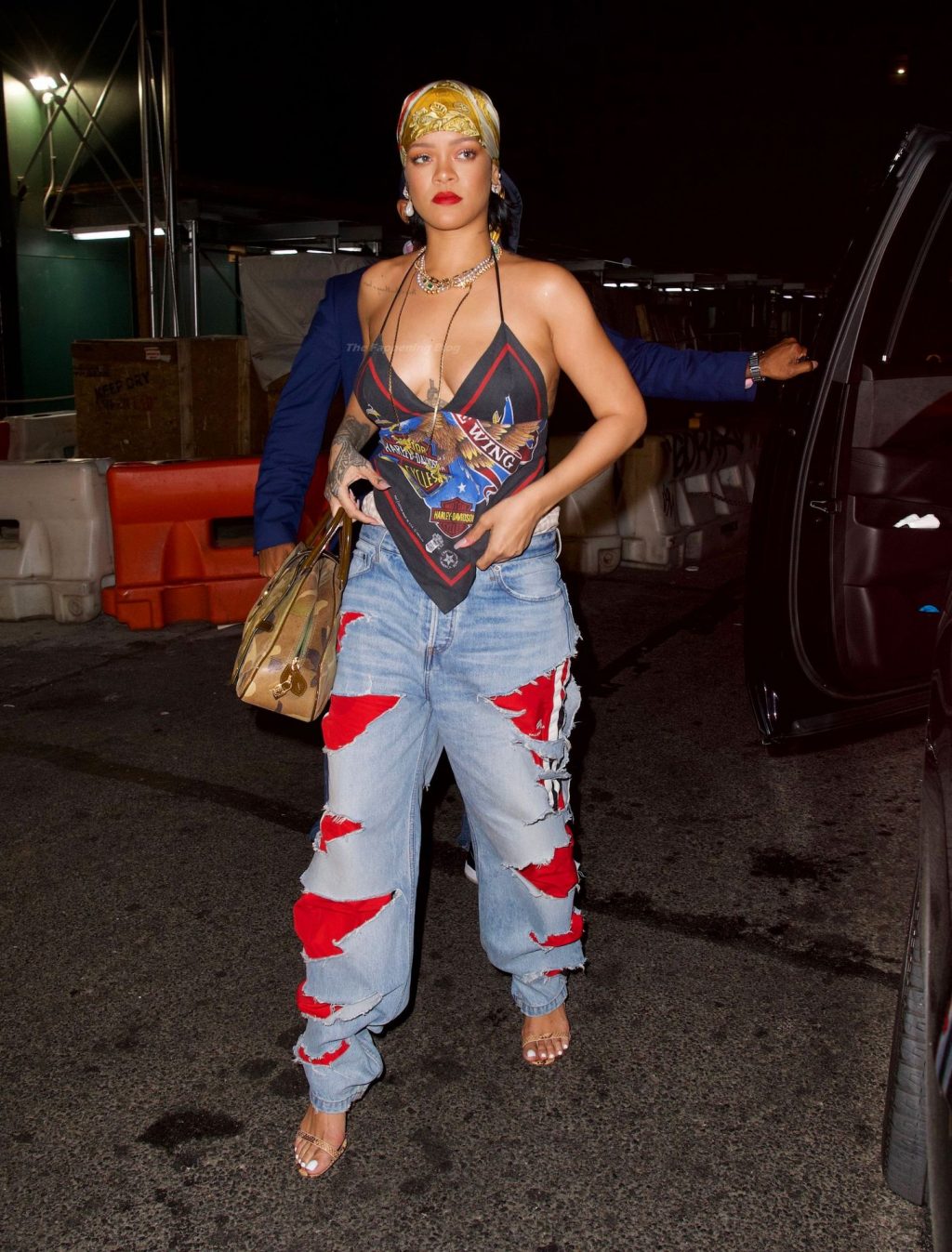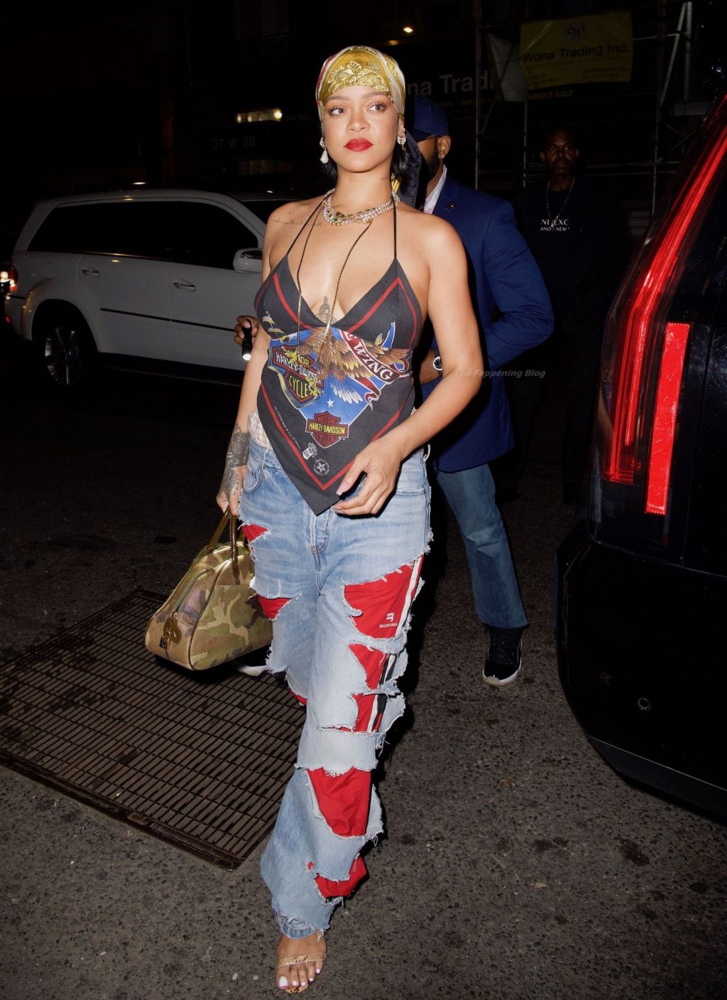 Rihanna si gode una serata a New York indossando un top Harley bandana scollato e jeans strappati sopra i suoi pantaloni della tuta – New York, 08/12/2021.