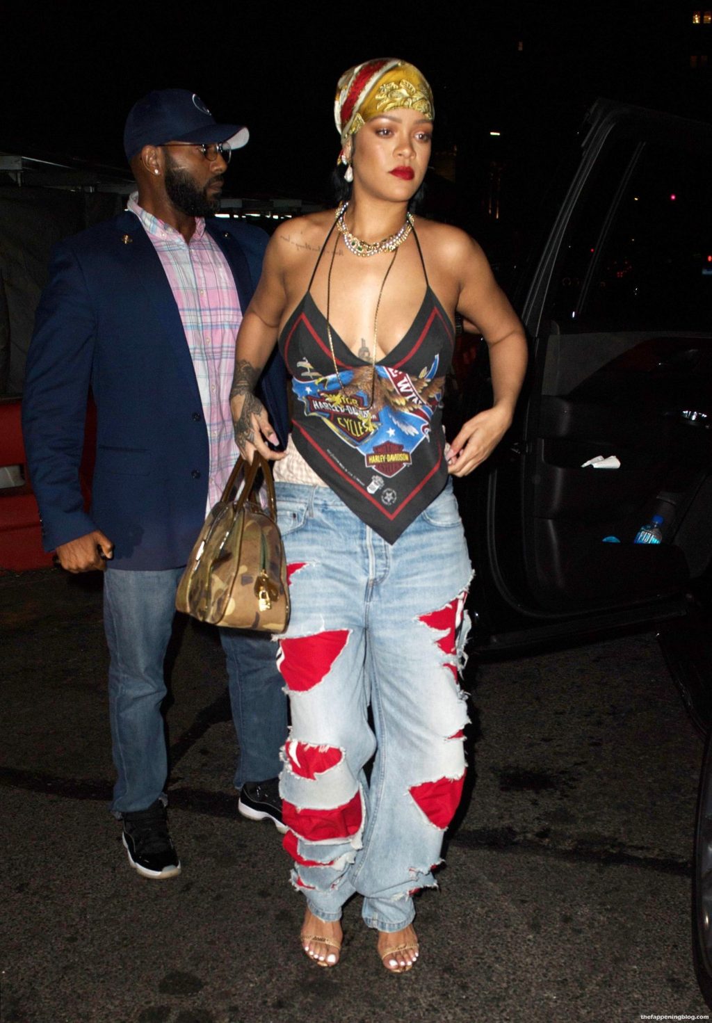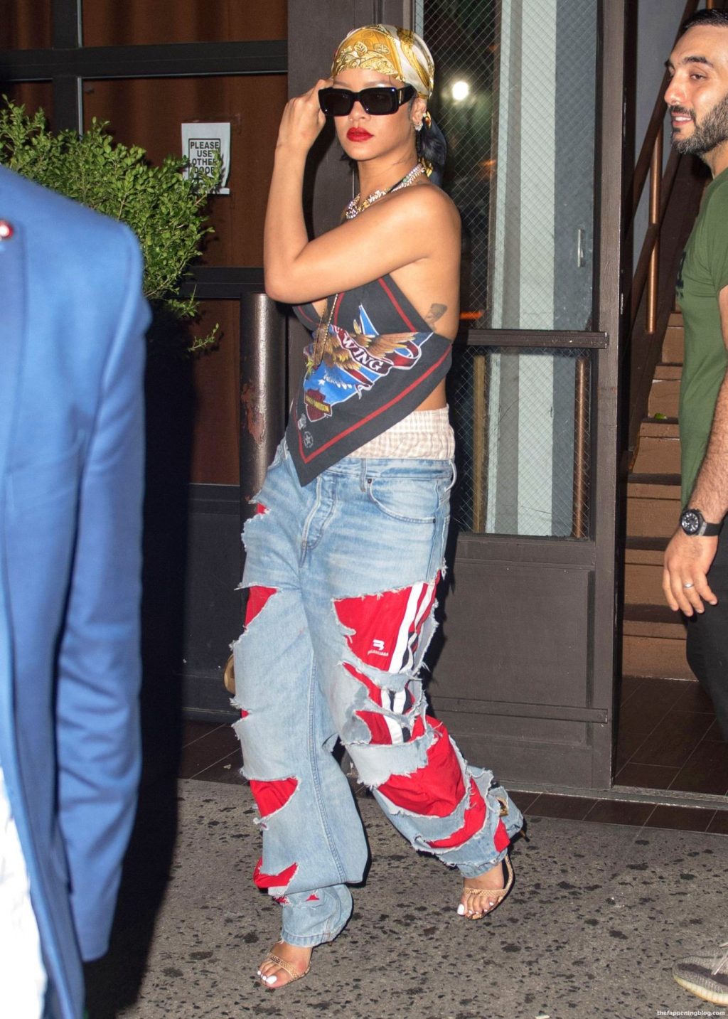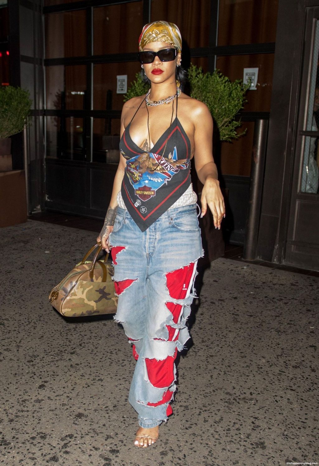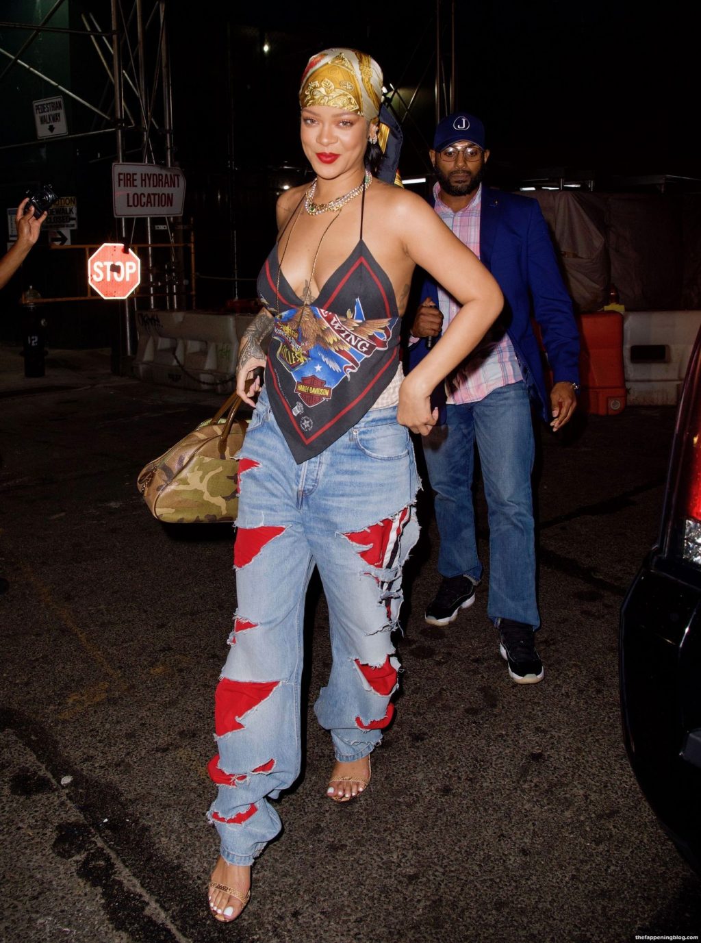 Rihanna si gode una serata a New York indossando un top Harley bandana scollato e jeans strappati sopra i suoi pantaloni della tuta – New York, 08/12/2021.