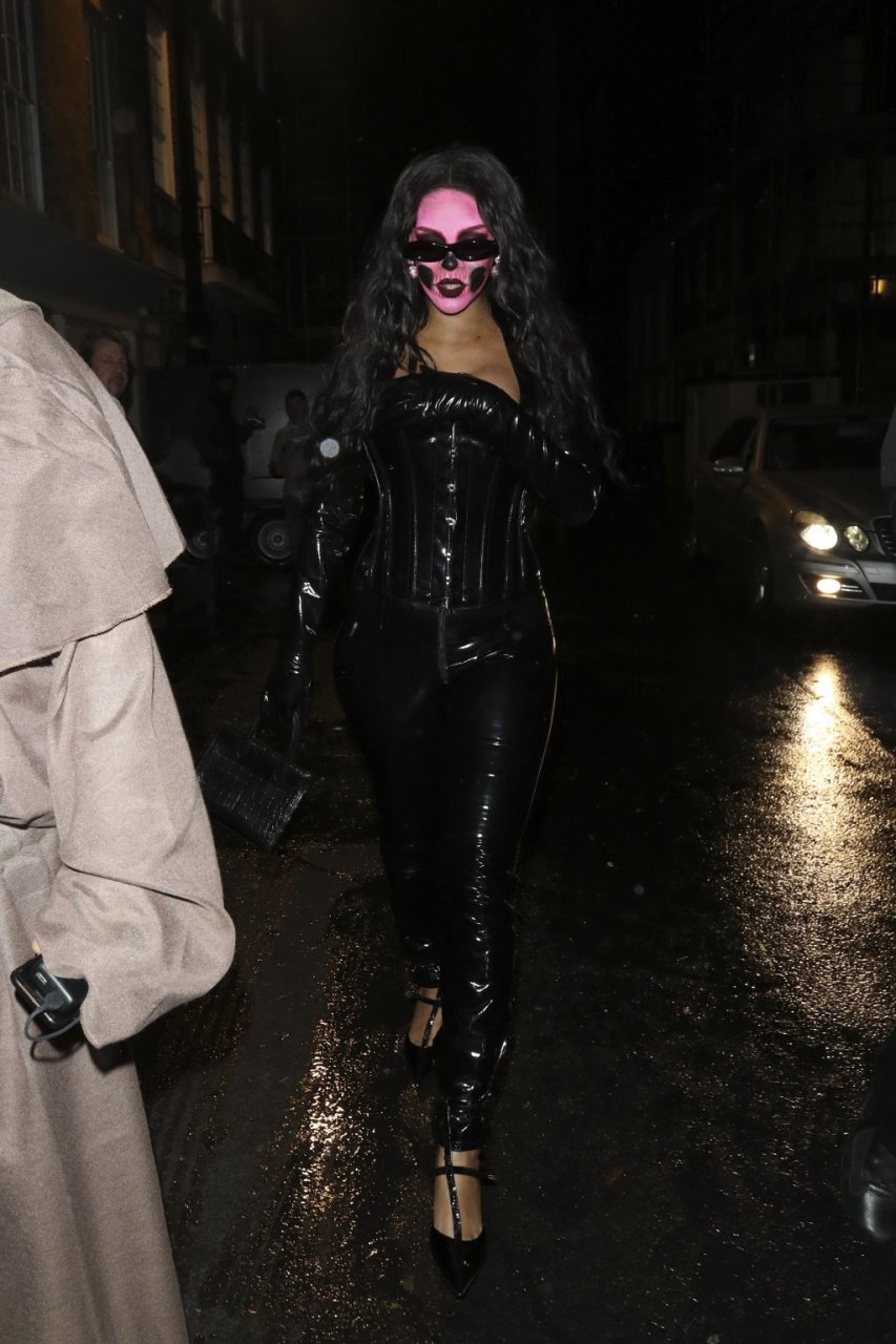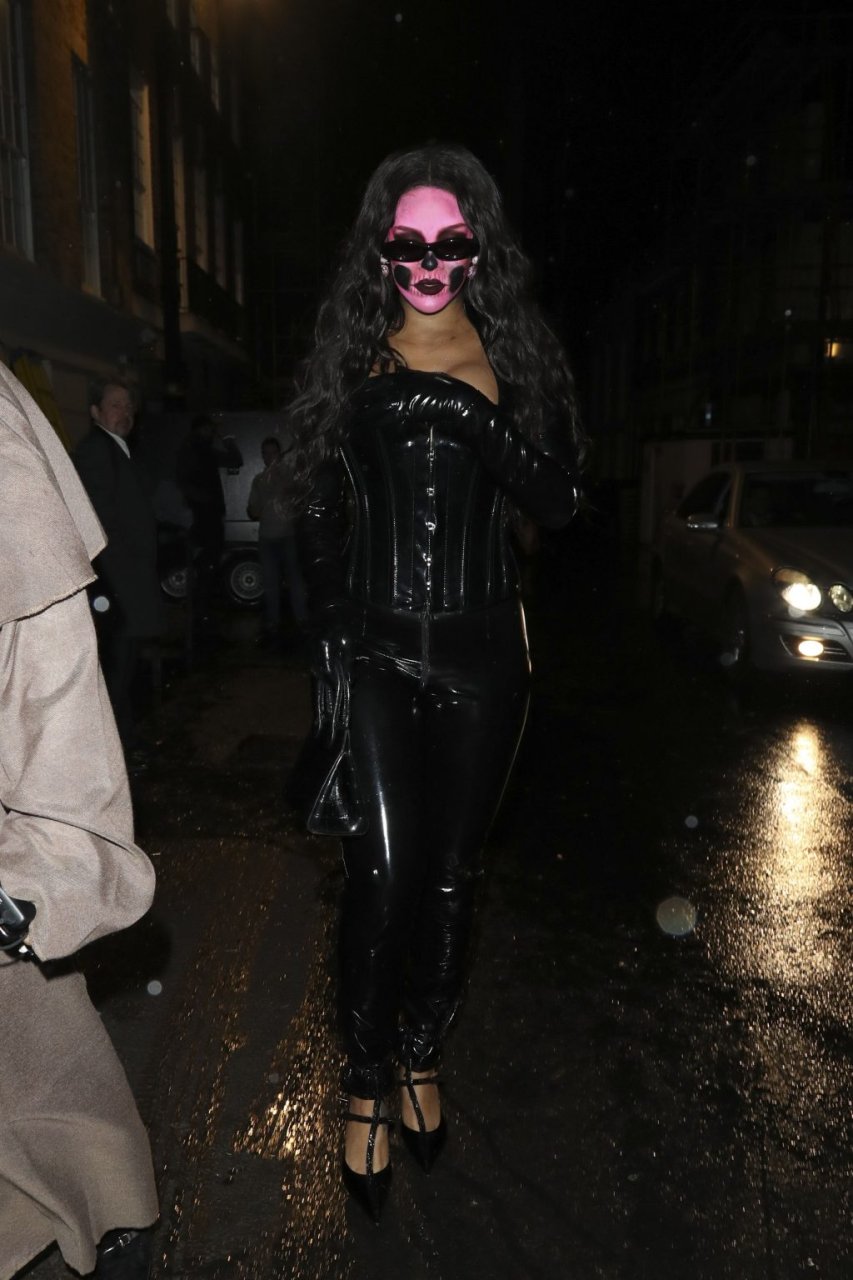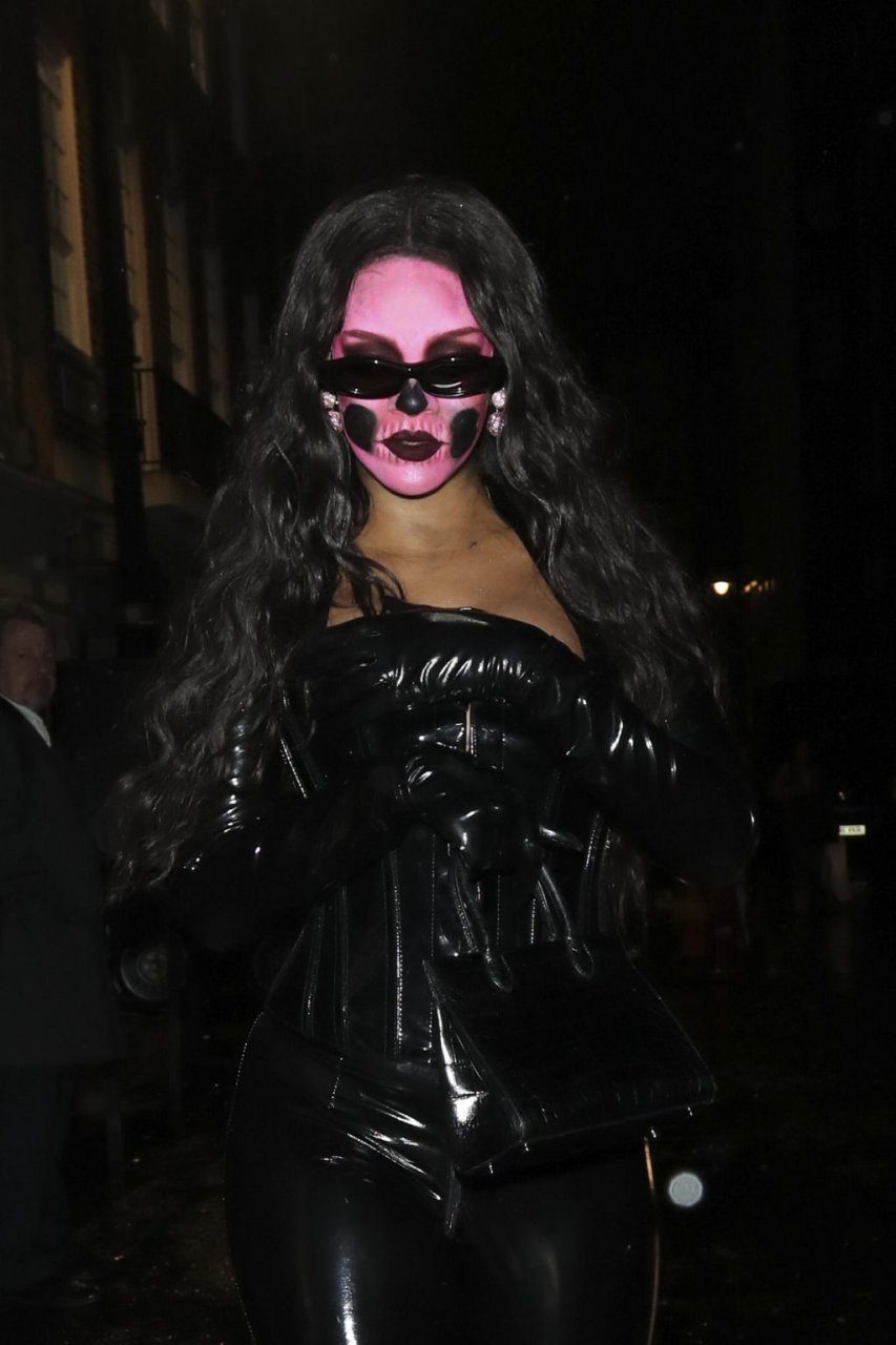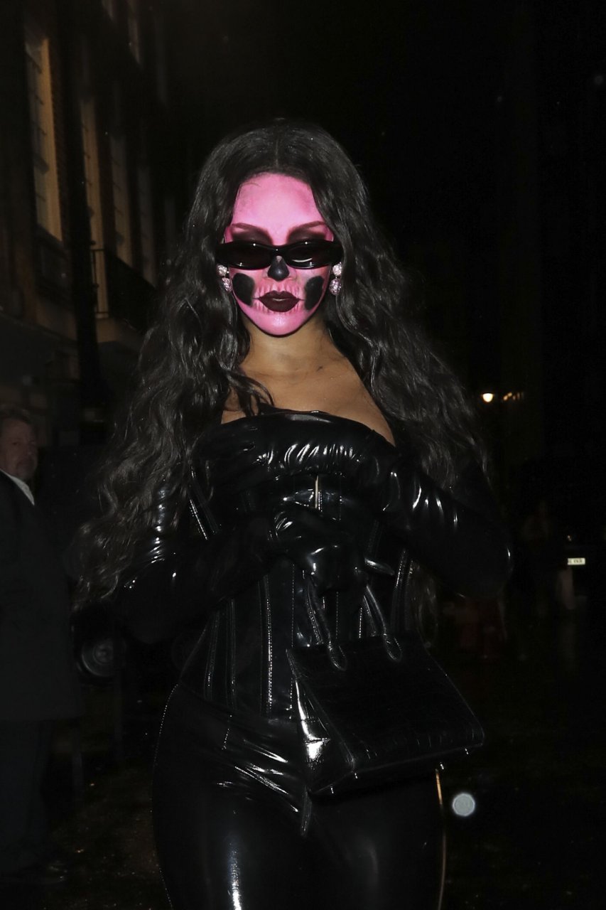 Rihanna sfoggia un aspetto prosperoso a una festa di Halloween a Londra, 31/10/2018. La cantante barbadiana ha mostrato le sue curve con un bustier in pelle nera lucida e collant, con trucco rosa a tema teschio sul viso e tacchi appuntiti.