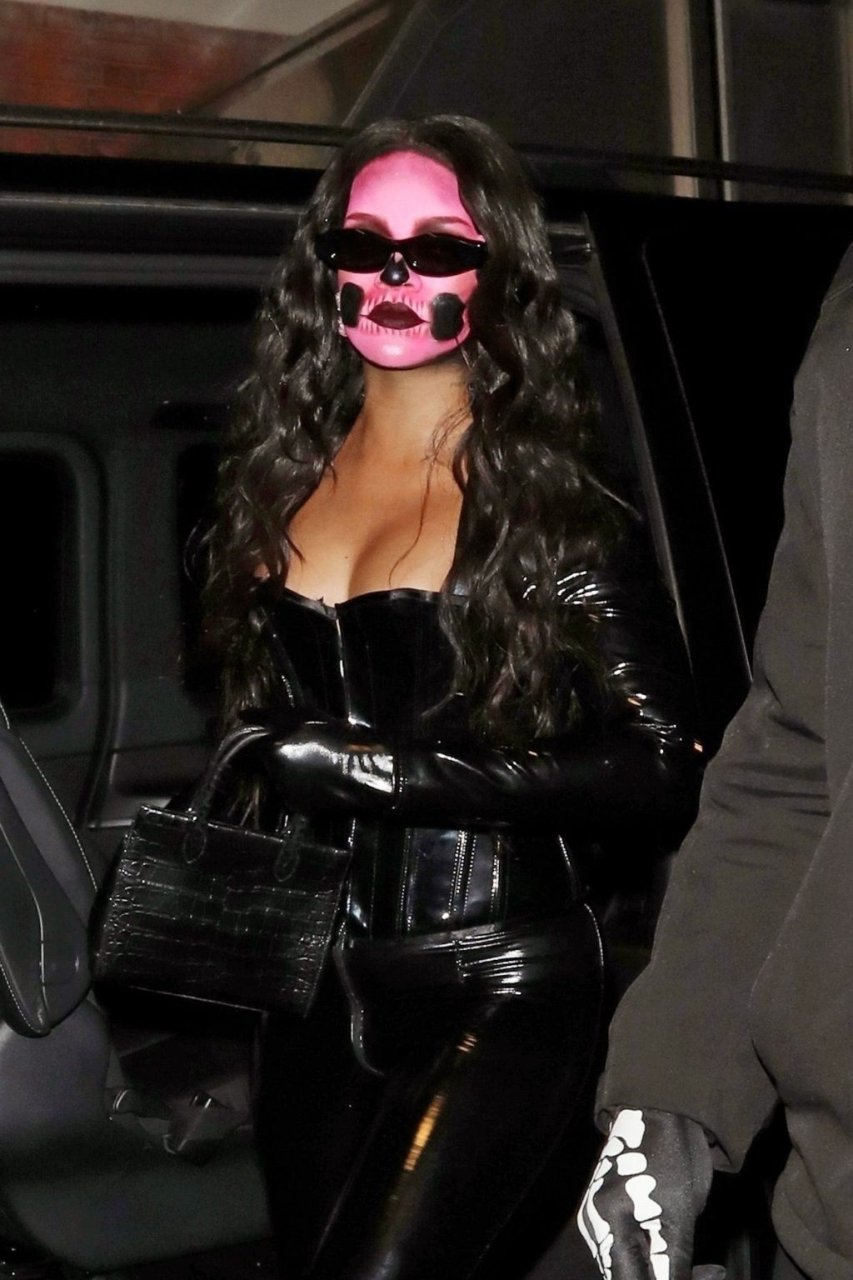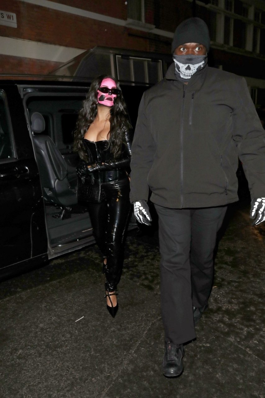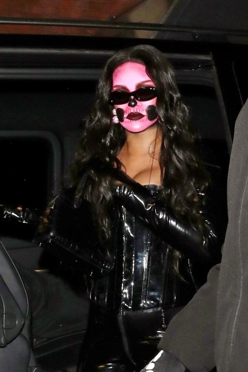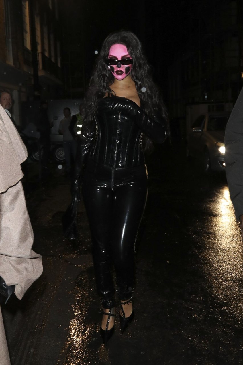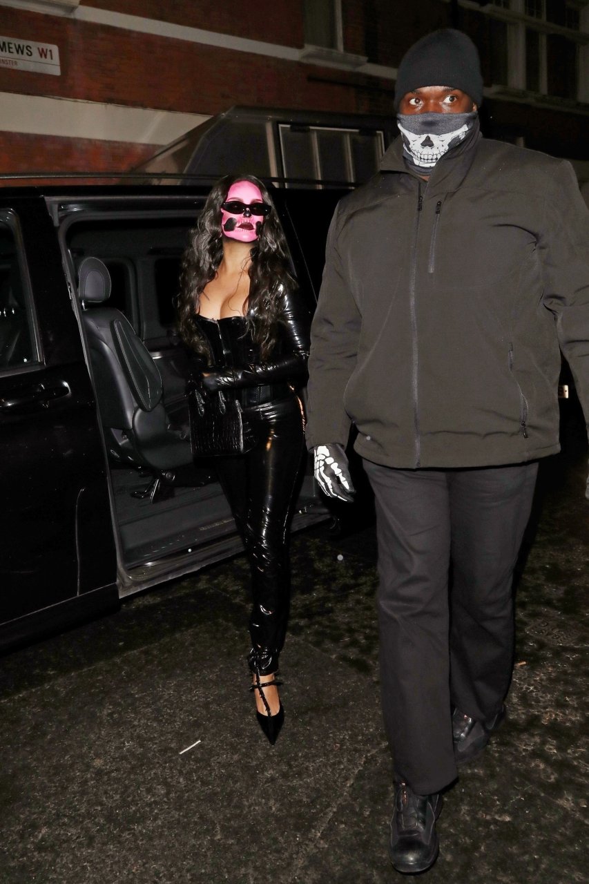 Rihanna sfoggia un aspetto prosperoso a una festa di Halloween a Londra, 31/10/2018. La cantante barbadiana ha mostrato le sue curve con un bustier in pelle nera lucida e collant, con trucco rosa a tema teschio sul viso e tacchi appuntiti.