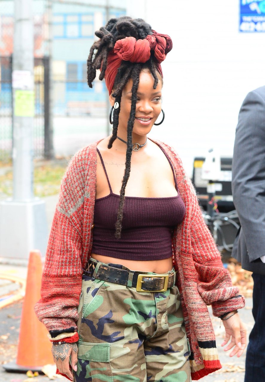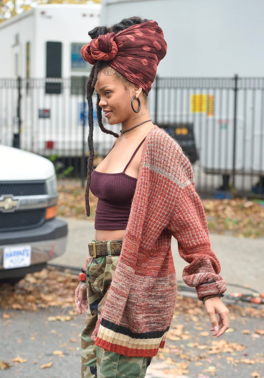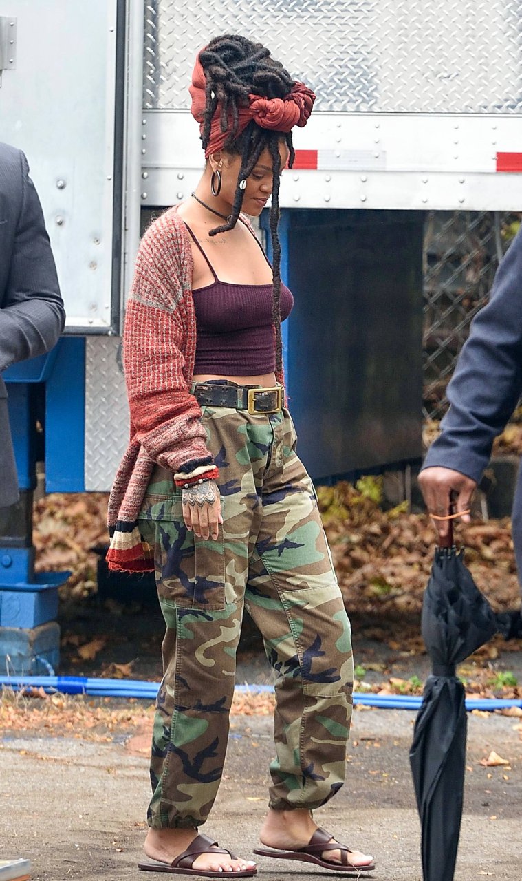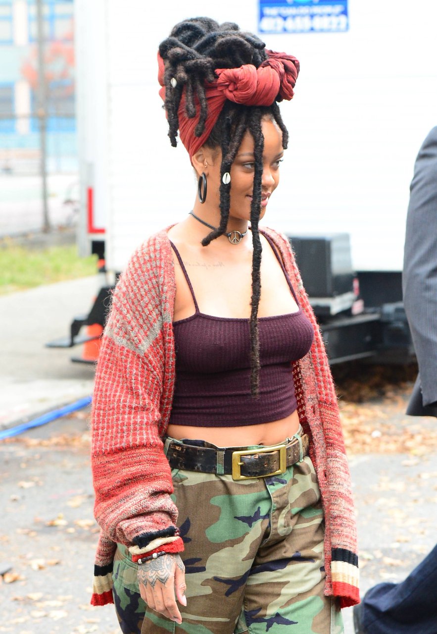 Rihanna indossa un piccolo top viola senza reggiseno sul set di Ocean’s Eight a New York, 11/03/16. Black Gorgona. Rihanna è una cantante e stilista americana. Età: 28 (20 febbraio 1988).