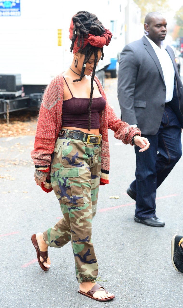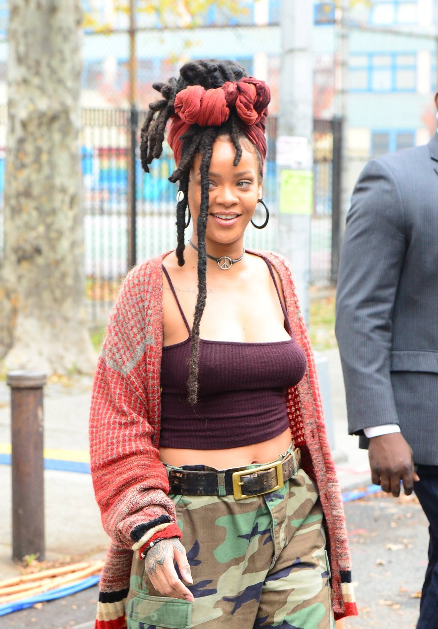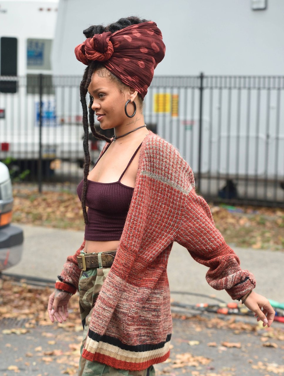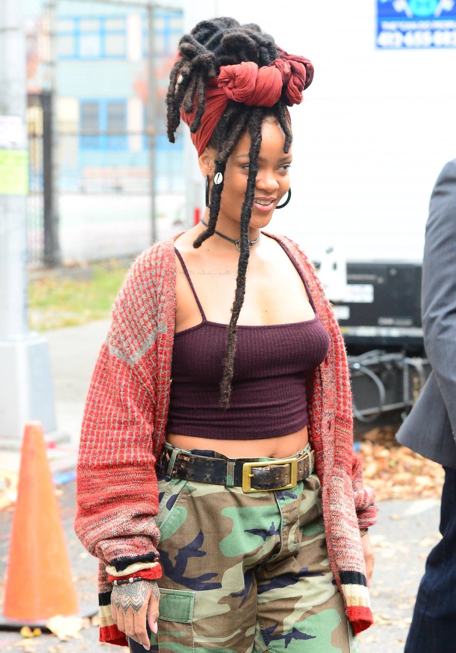 Rihanna indossa un piccolo top viola senza reggiseno sul set di Ocean’s Eight a New York, 11/03/16. Black Gorgona. Rihanna è una cantante e stilista americana. Età: 28 (20 febbraio 1988).